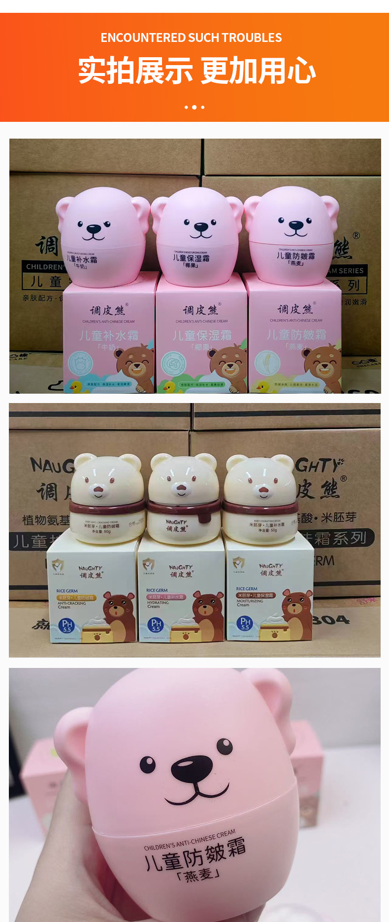 50 г детского увлажняющего крема с зародышами риса; 50 г детского увлажняющего крема с зародышами риса; 50 г крема против растрескивания рисовых зародышей для детей; 50 г детского увлажняющего крема с молоком; 50 г кокосового детского увлажняющего крема; 50 г детского крема от натирания с овсяной пудрой