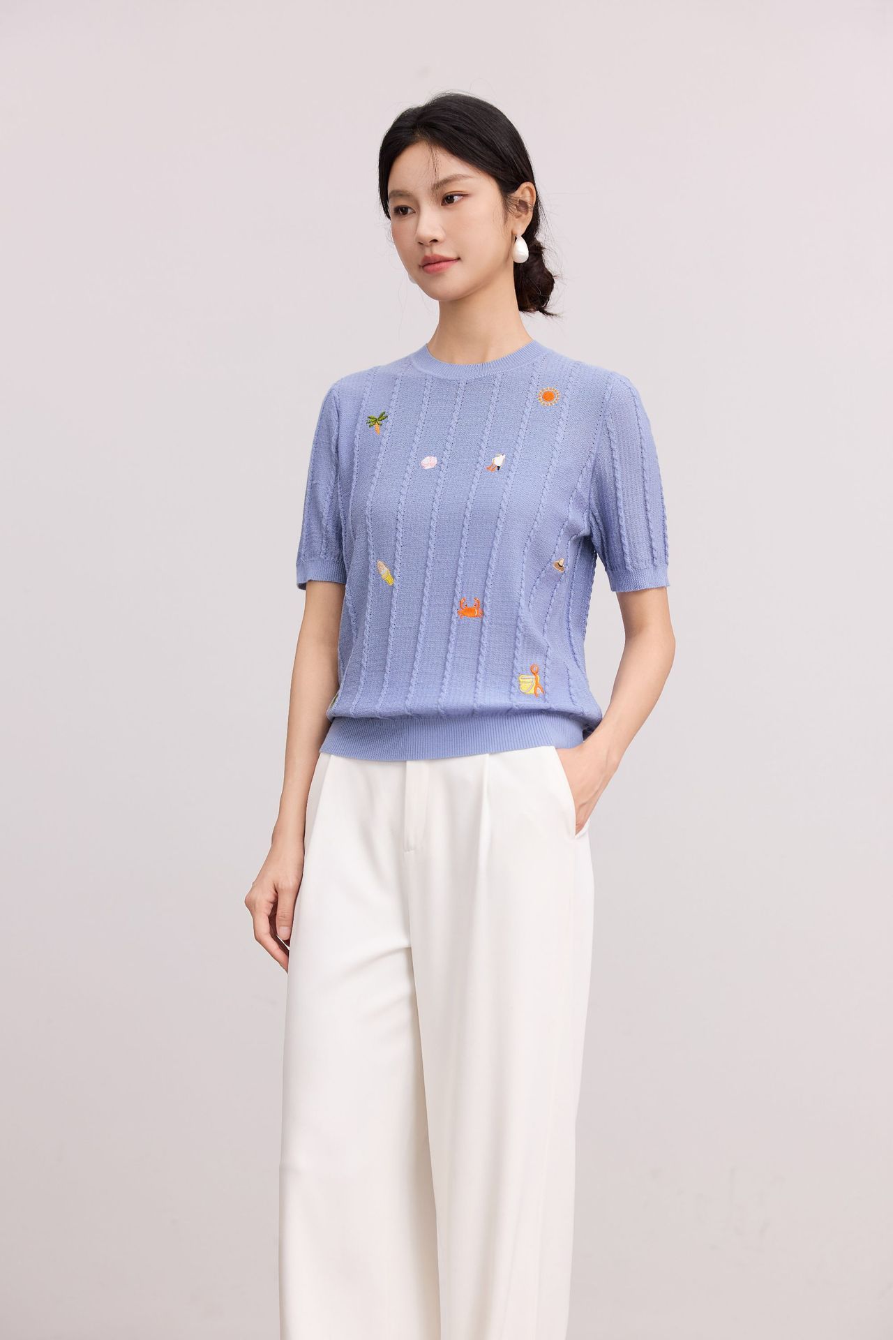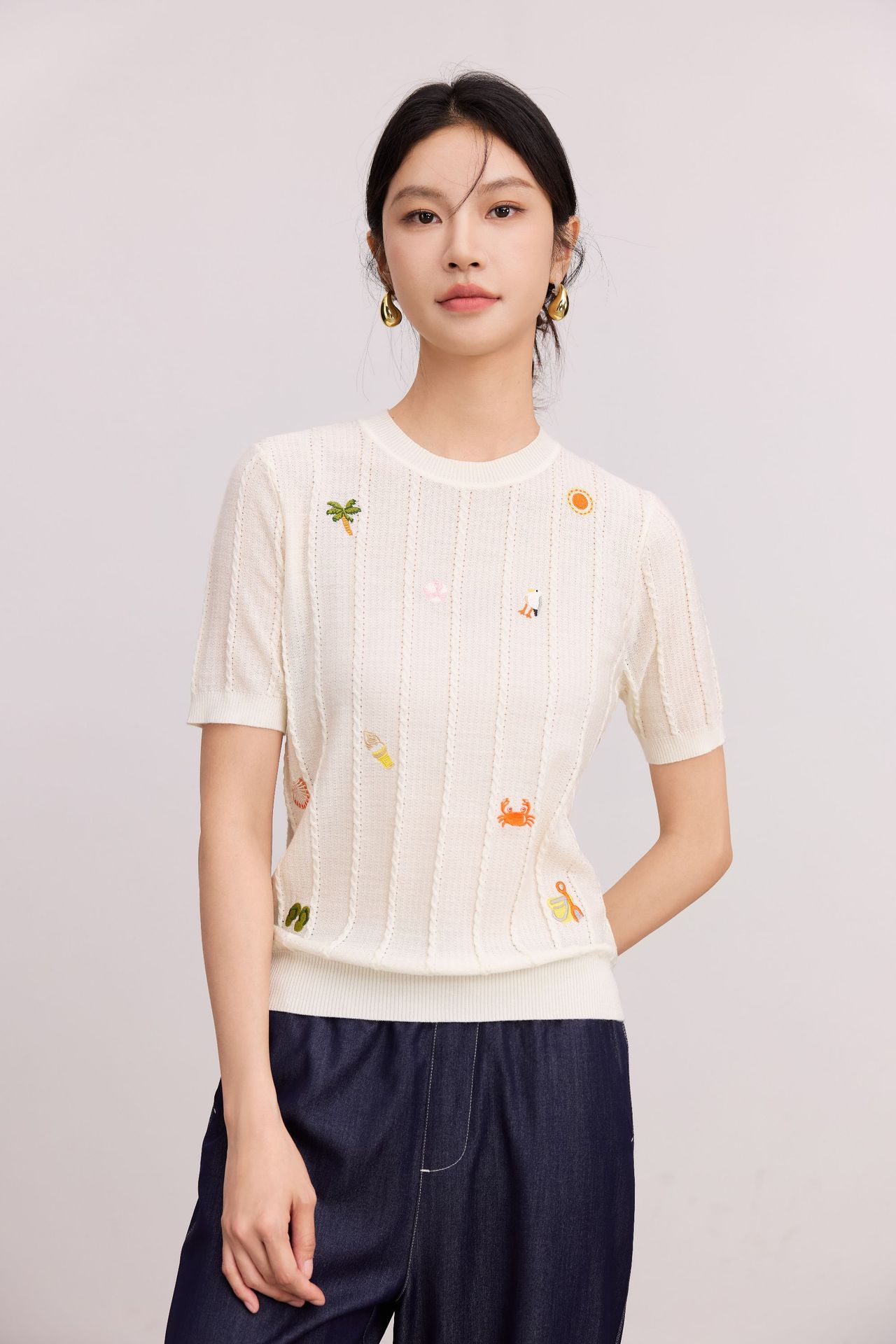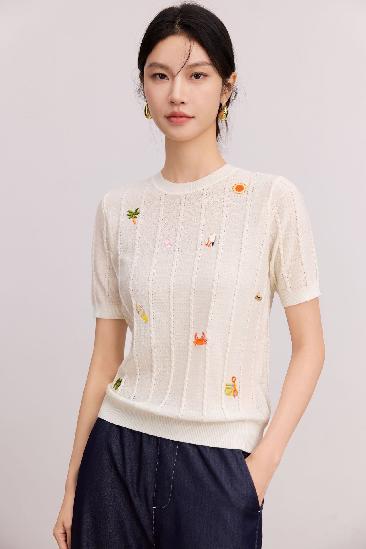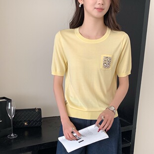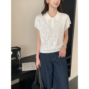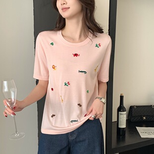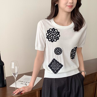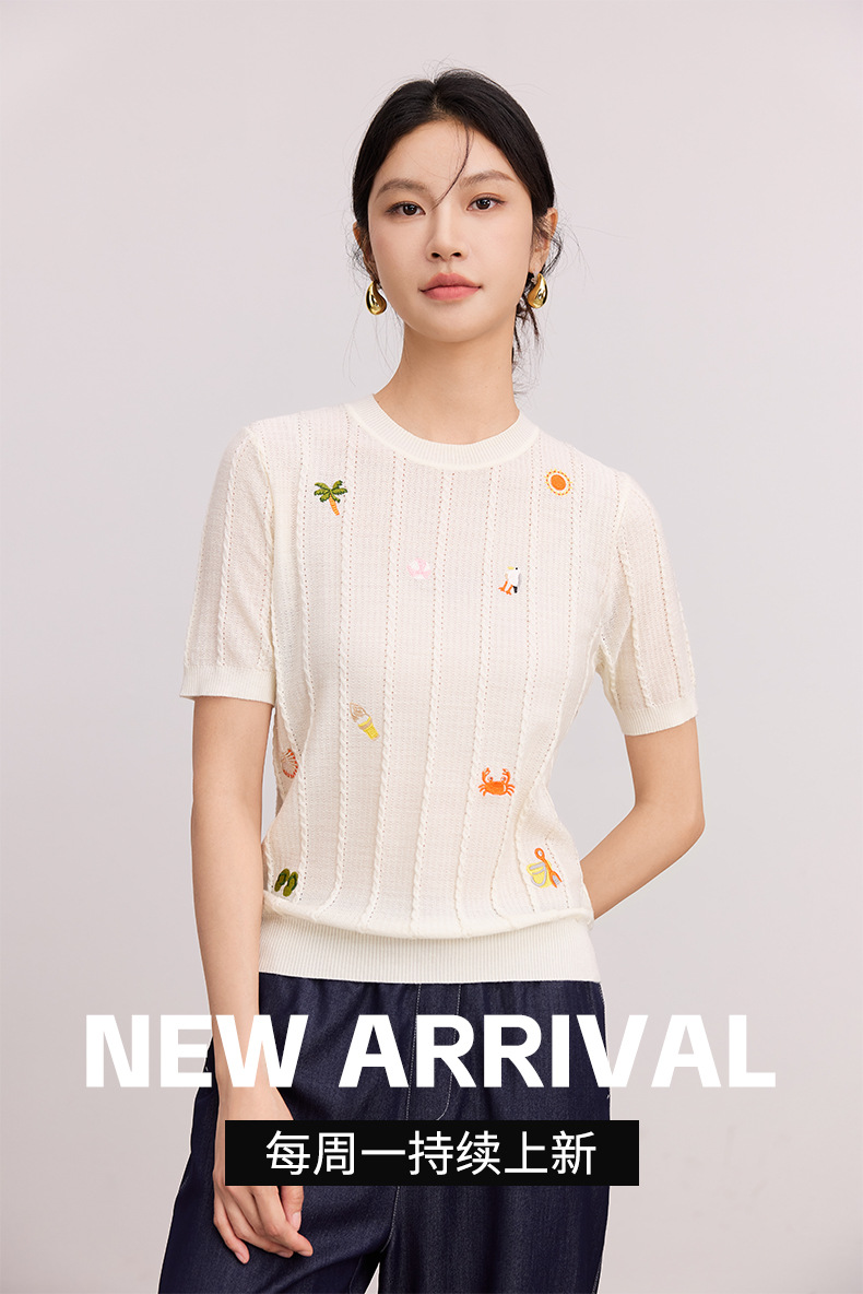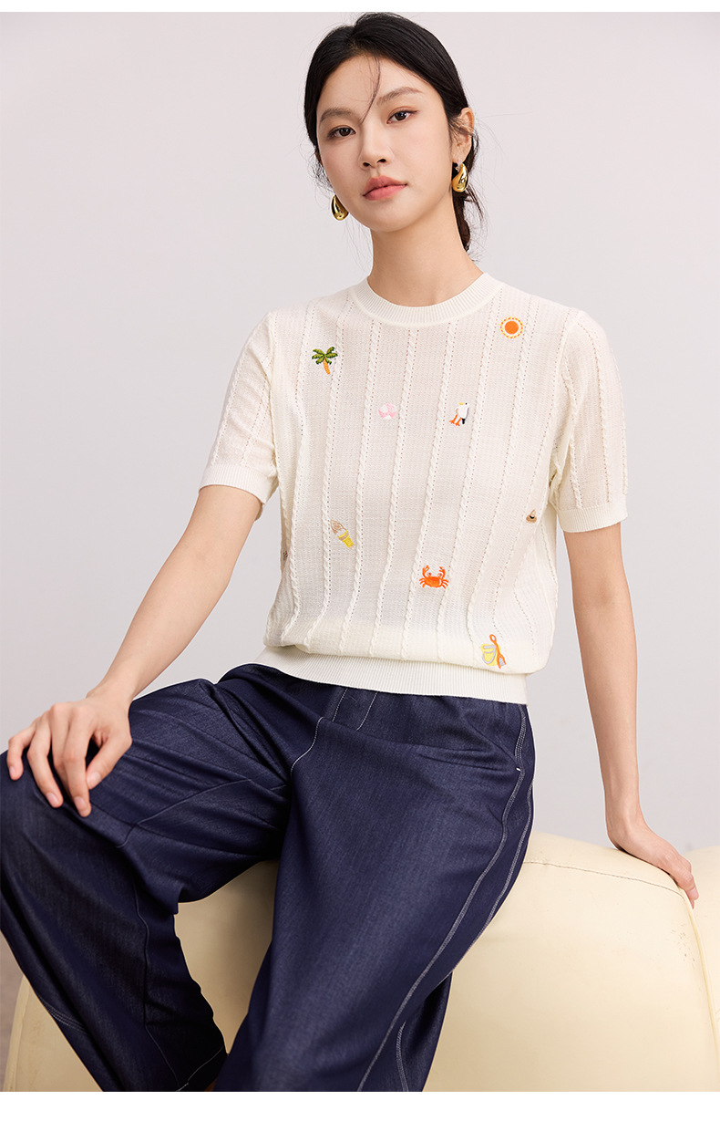 Тонкий вязаный пуловер с вышивкой из смесовой шерсти, с круглым вырезом и короткими рукавами, коллекция Весна/Лето 25