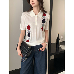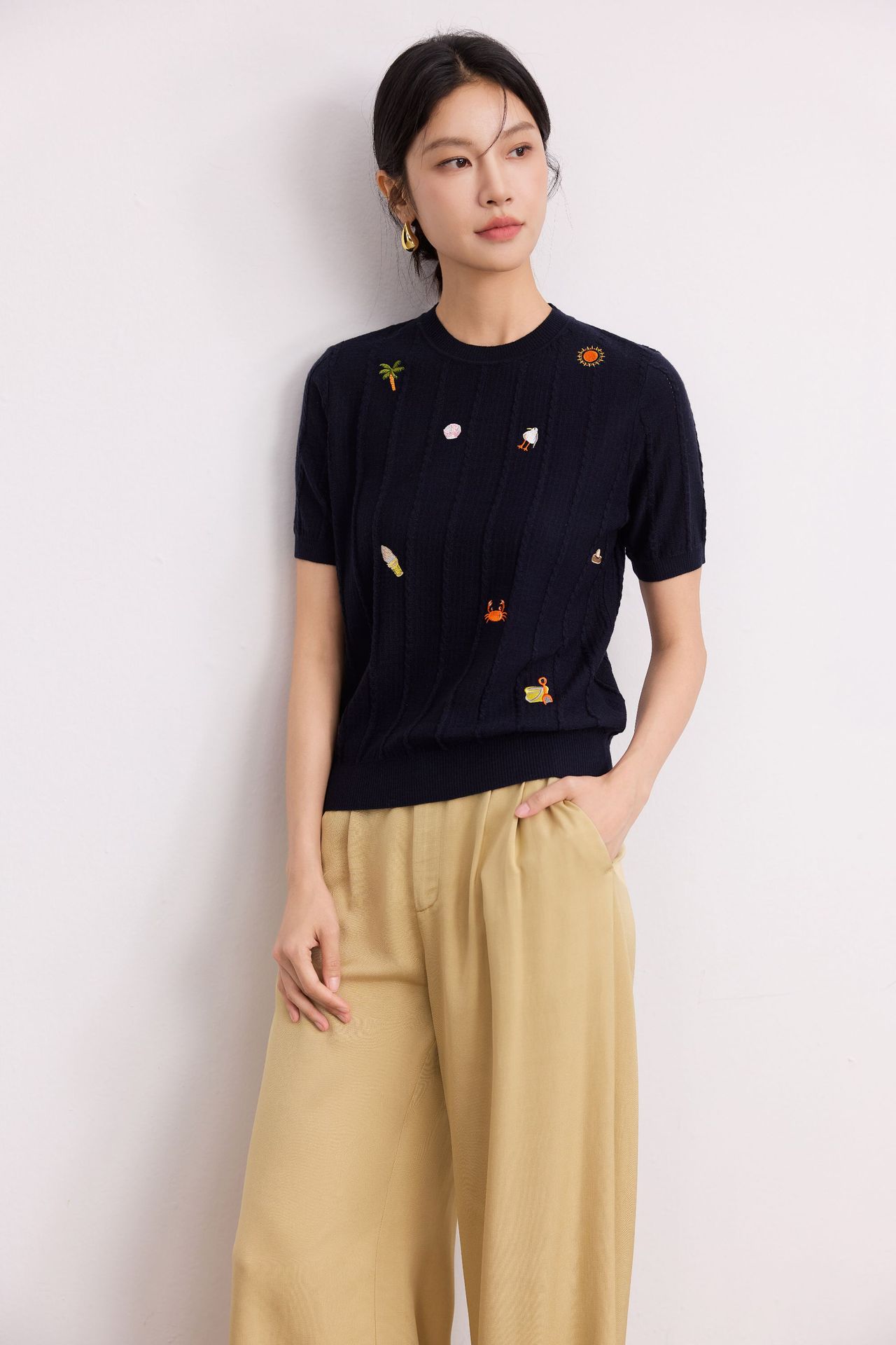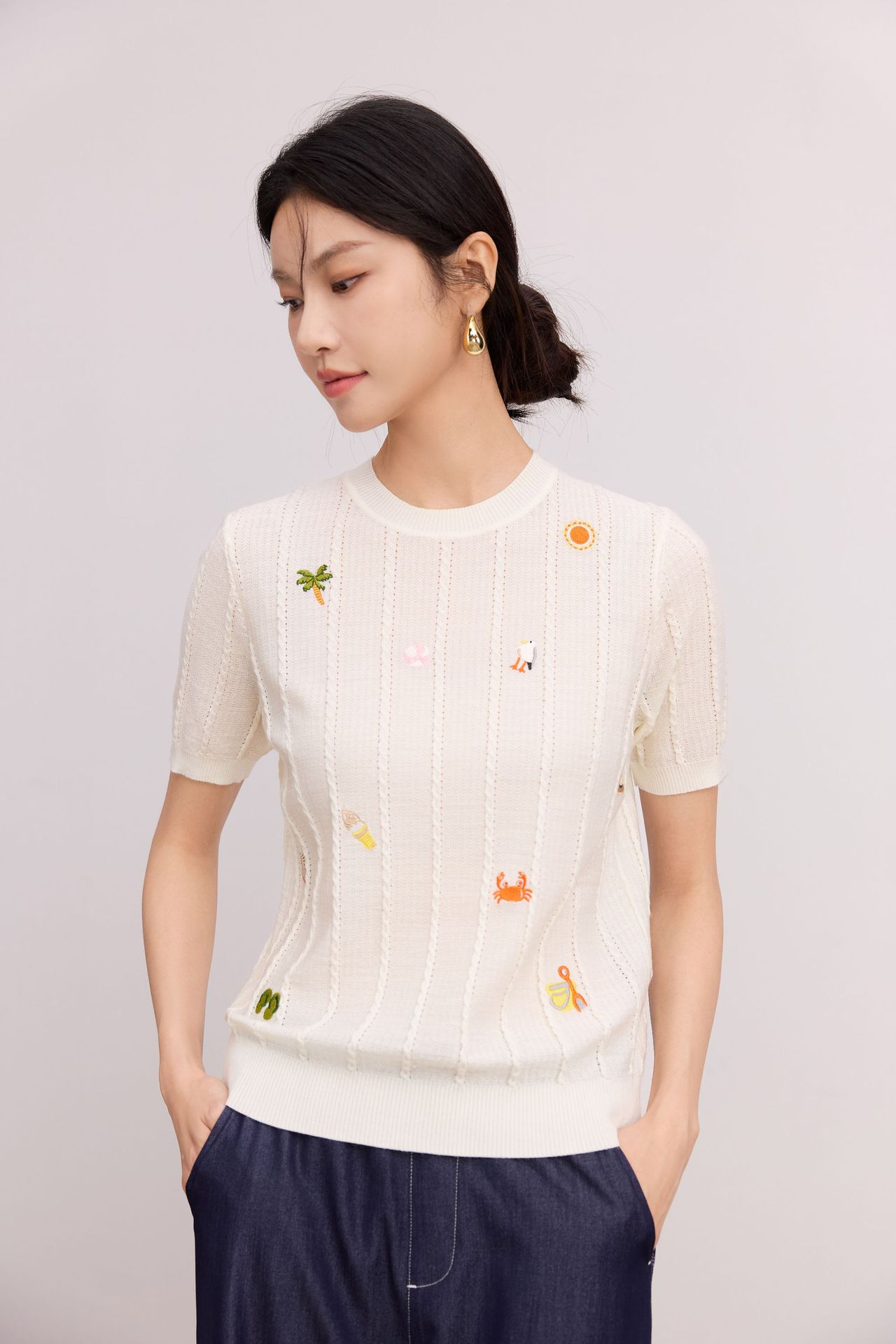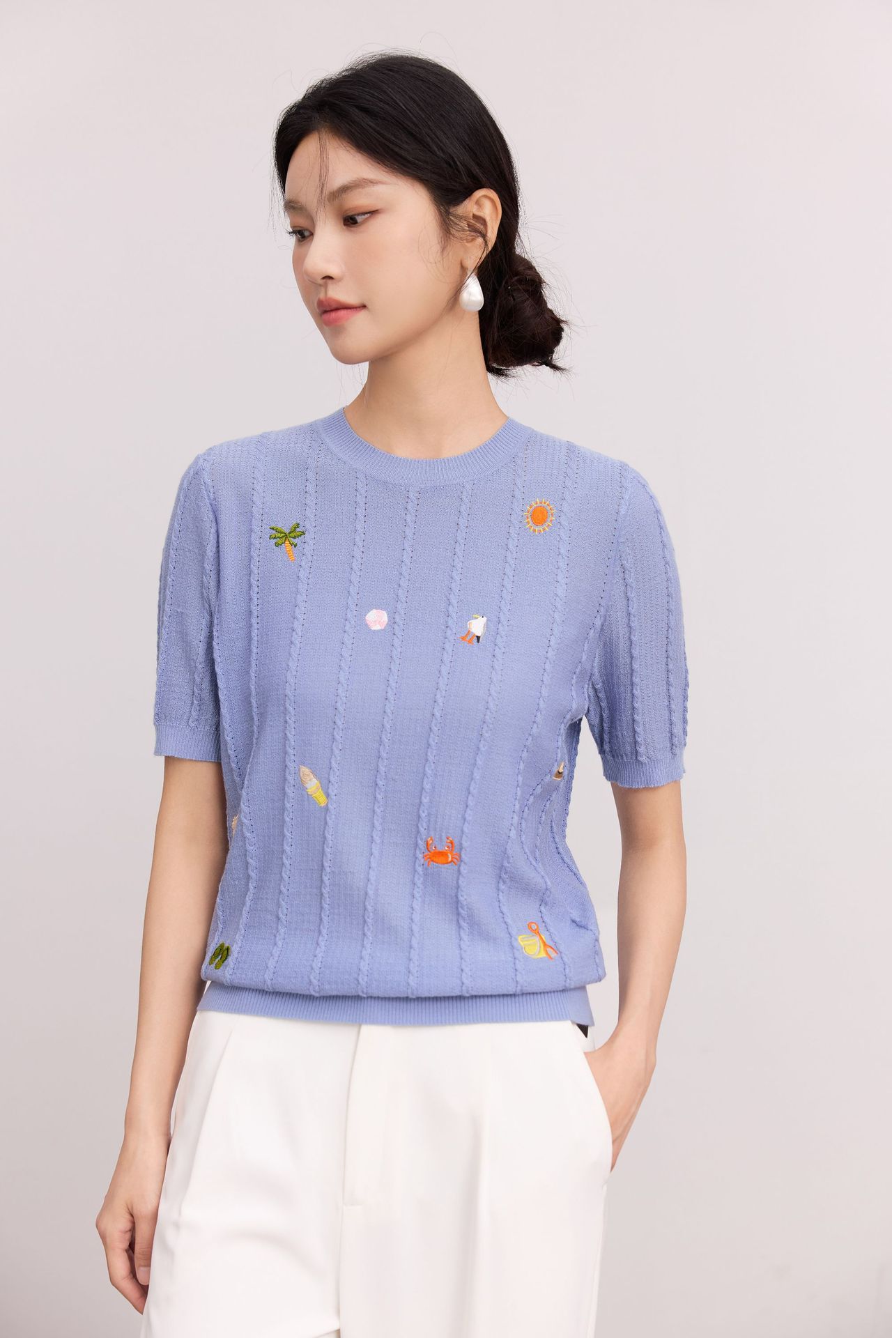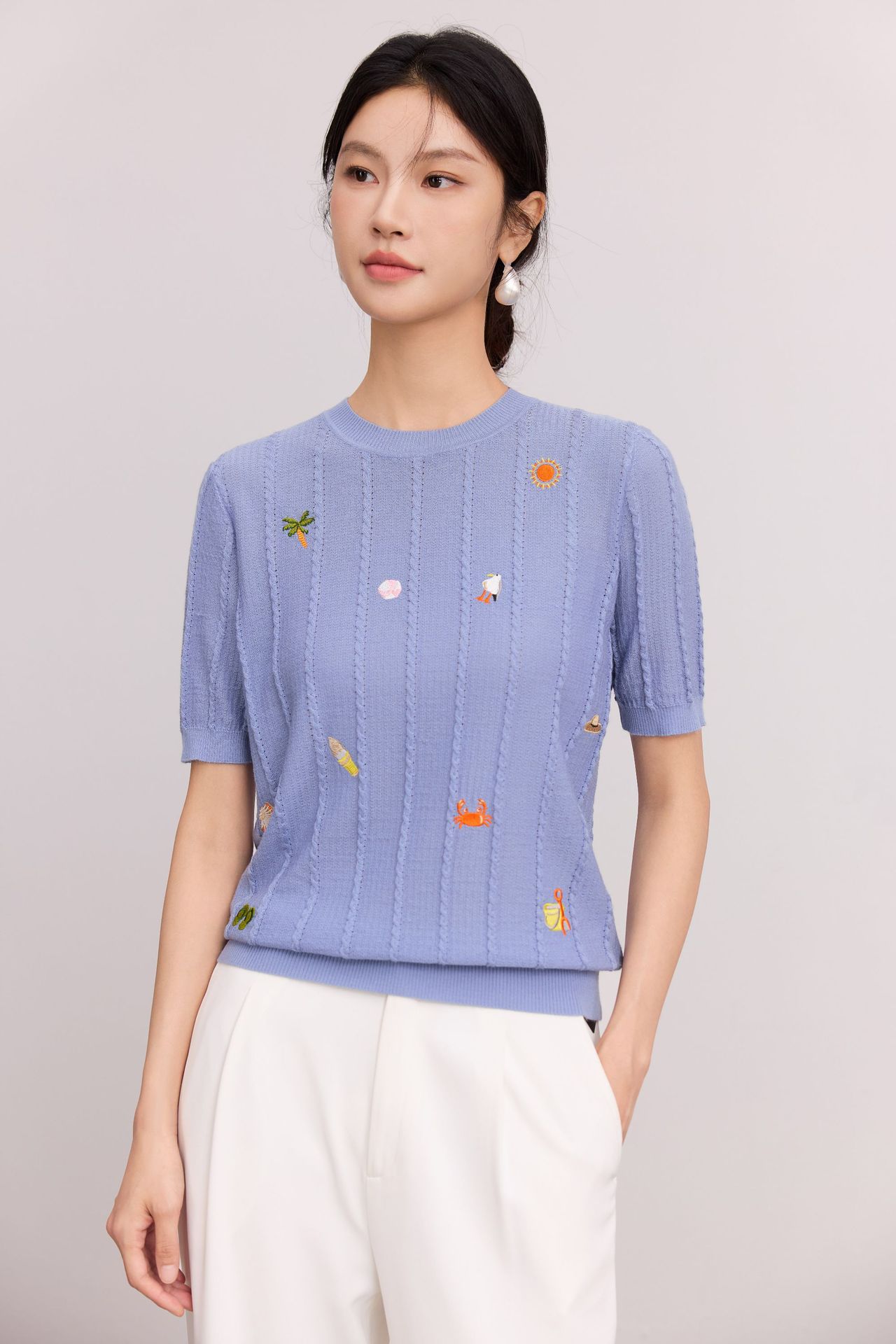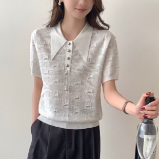 Тонкий вязаный пуловер с вышивкой из смесовой шерсти, с круглым вырезом и короткими рукавами, коллекция Весна/Лето 25