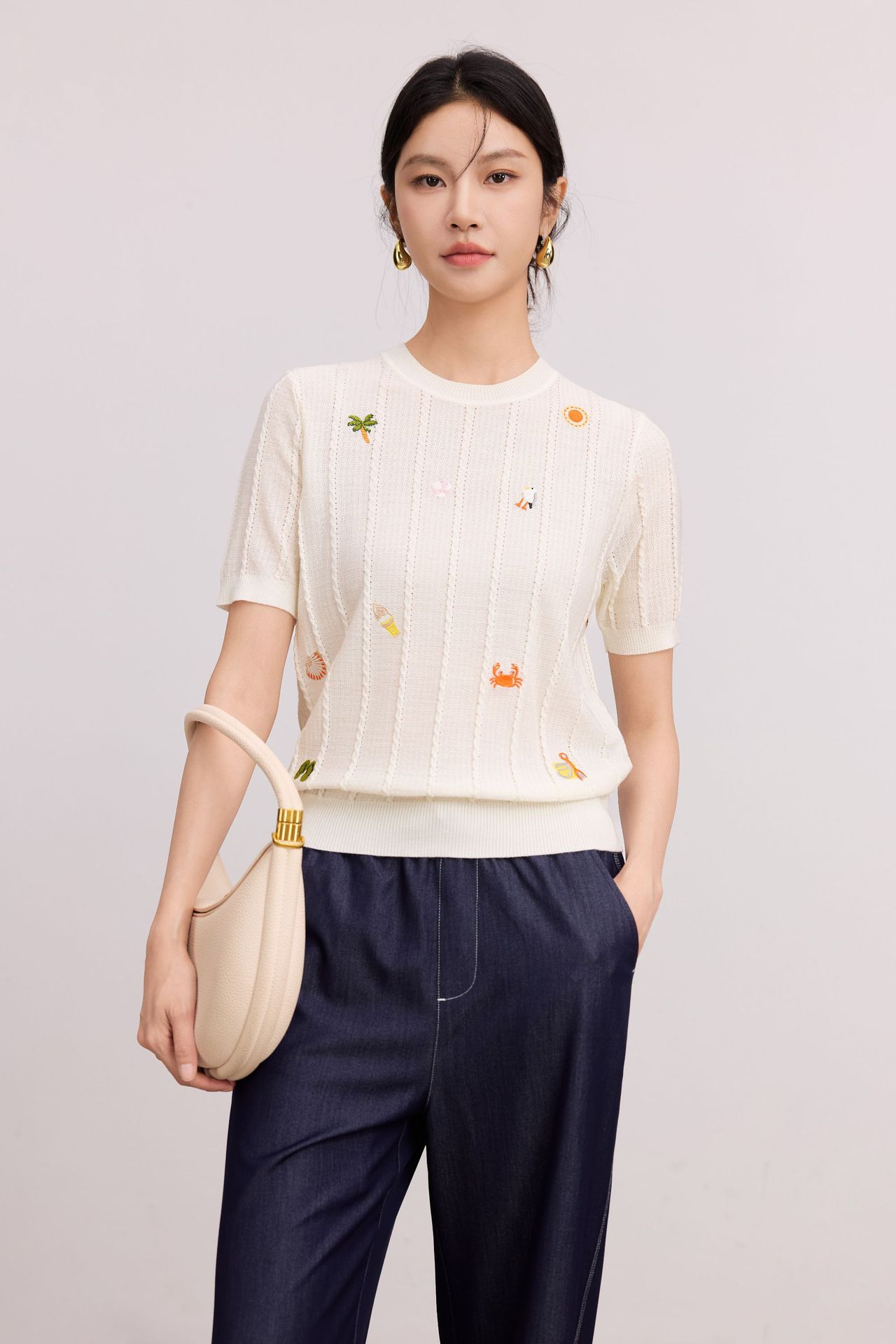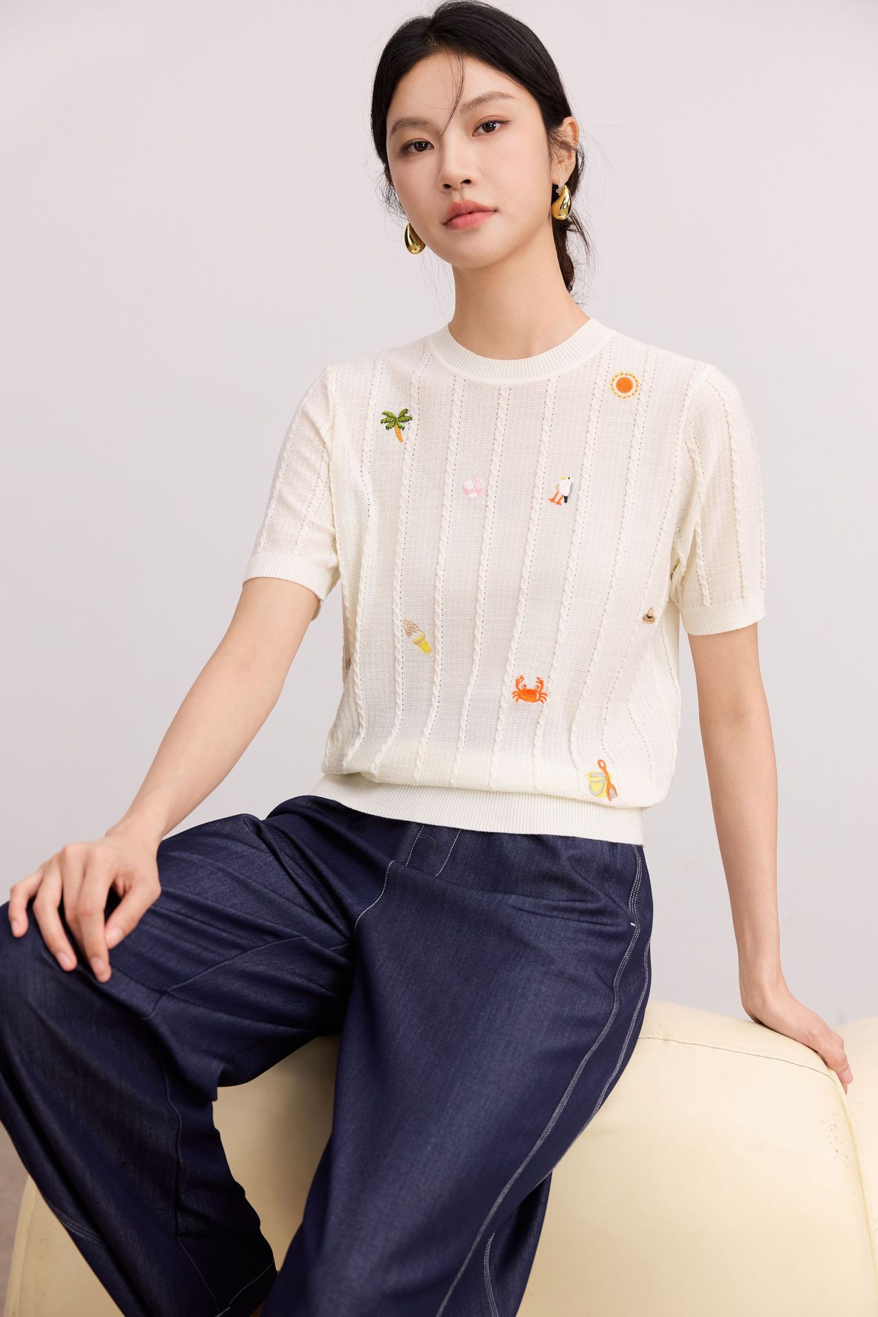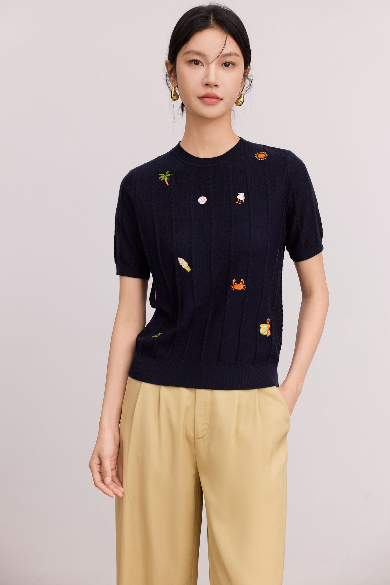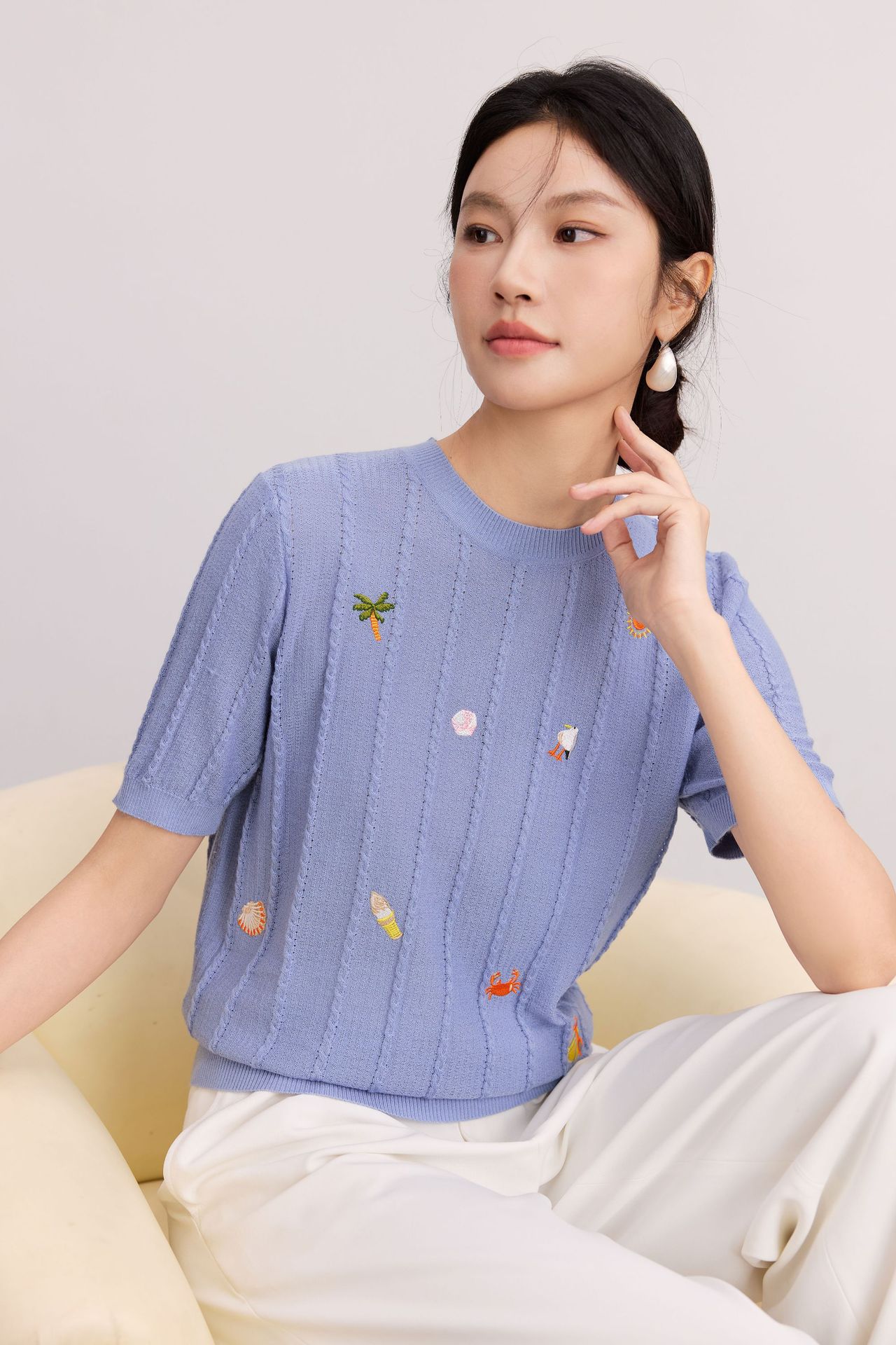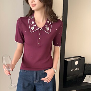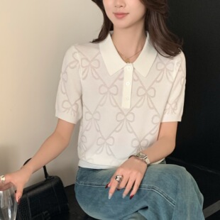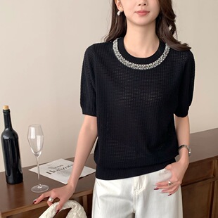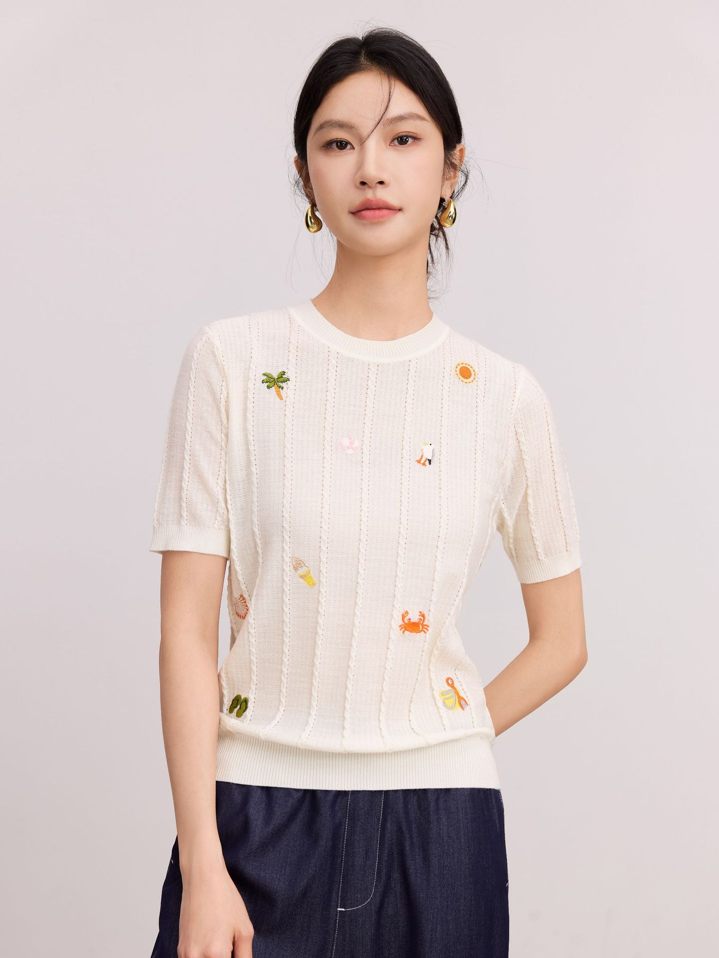 Тонкий вязаный пуловер с вышивкой из смесовой шерсти, с круглым вырезом и короткими рукавами, коллекция Весна/Лето 25