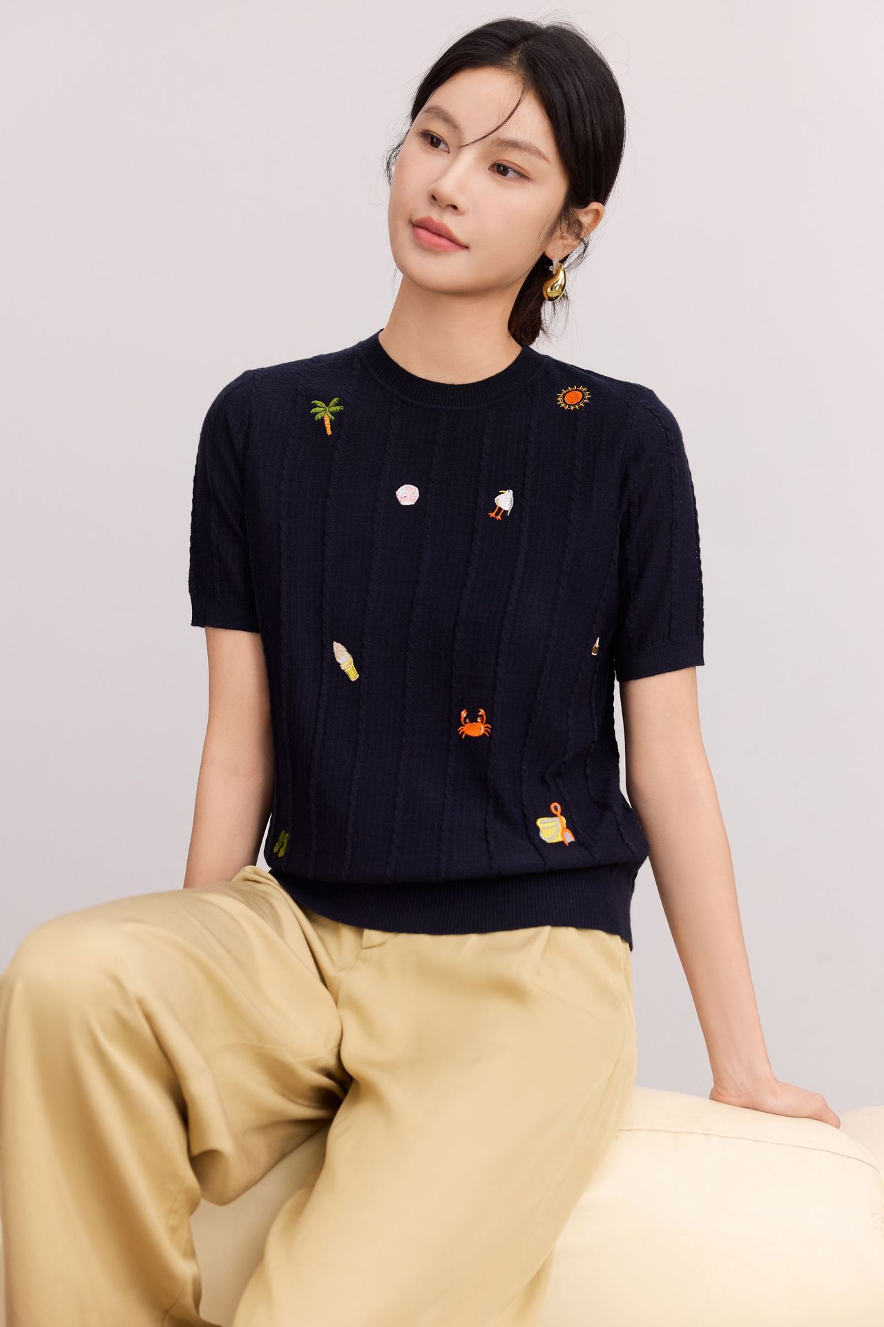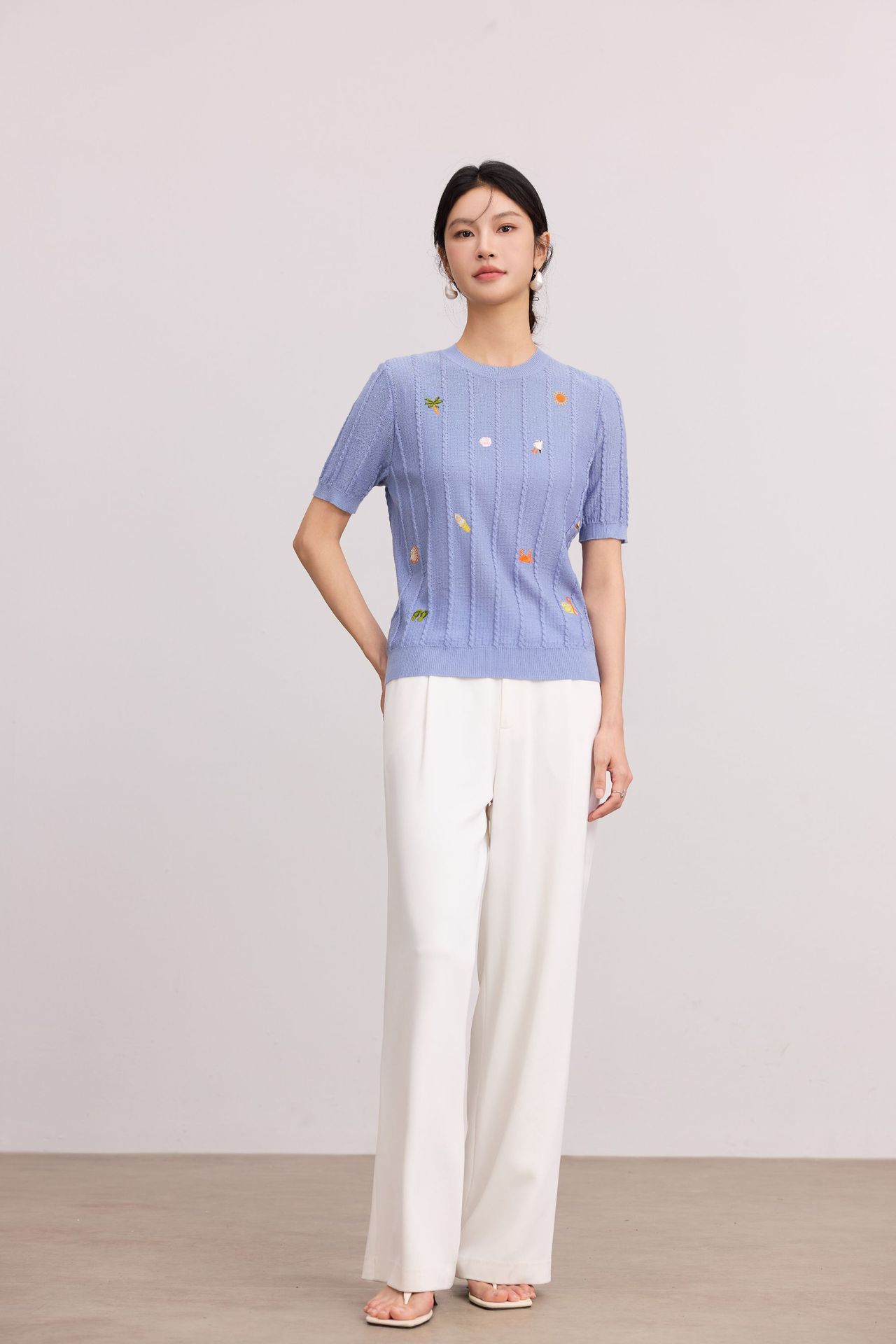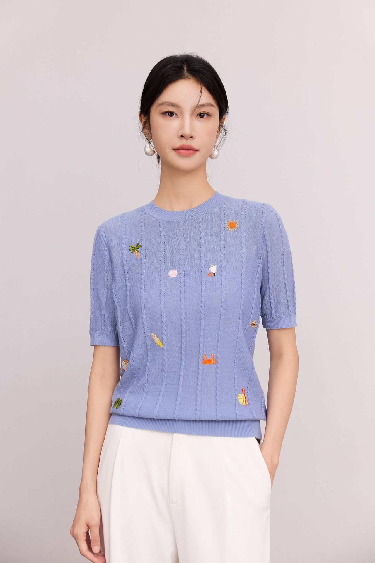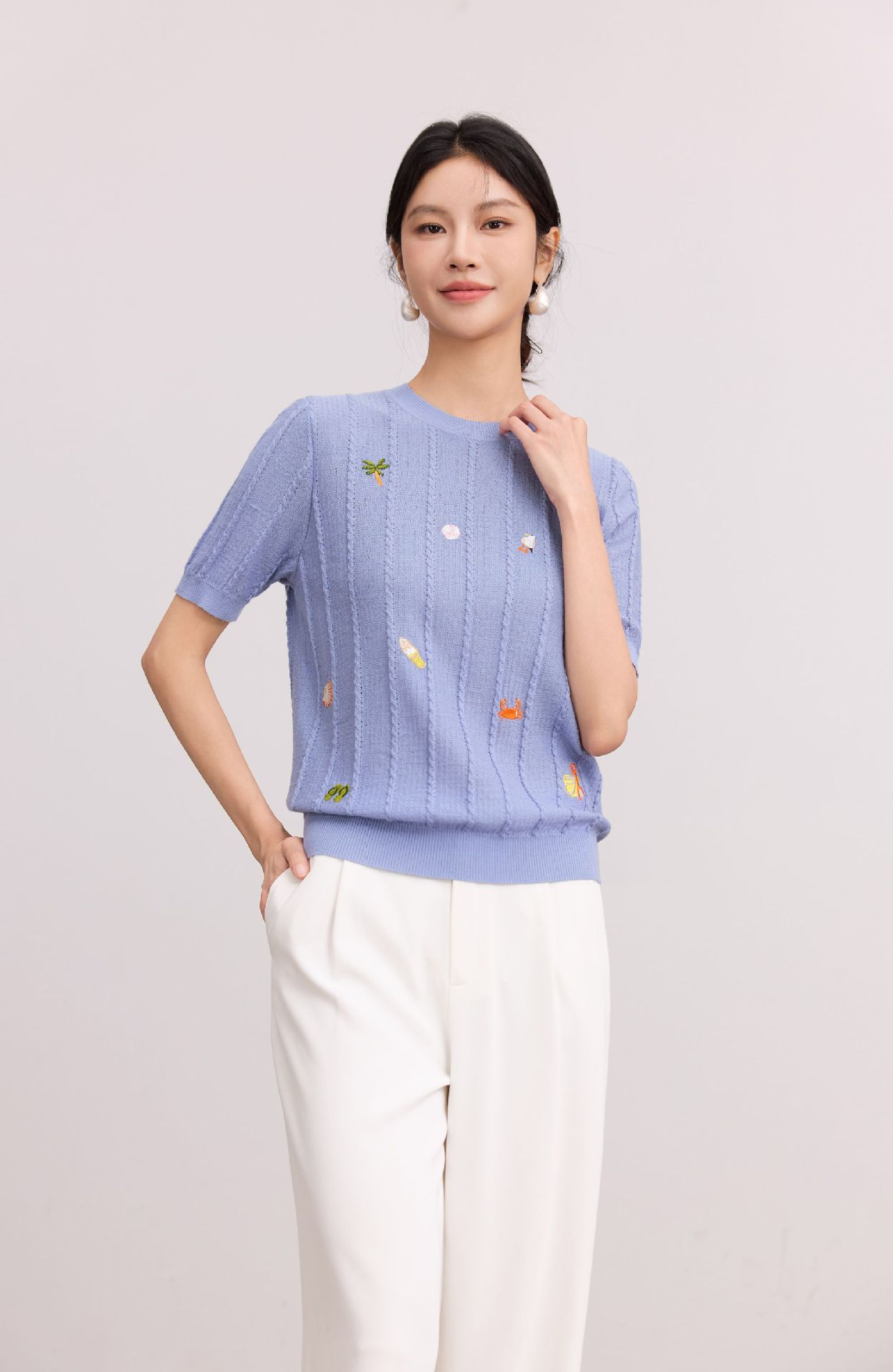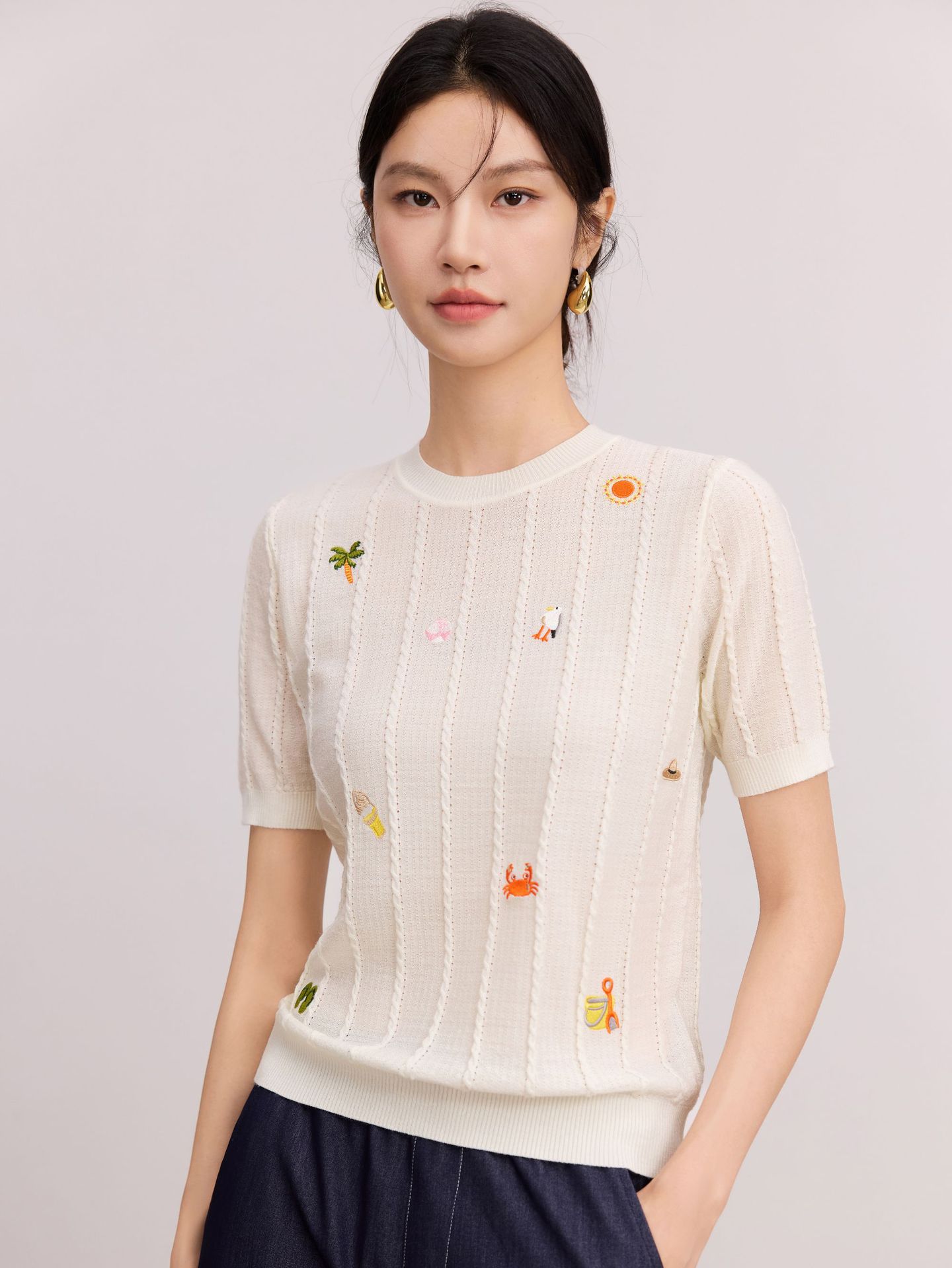 Тонкий вязаный пуловер с вышивкой из смесовой шерсти, с круглым вырезом и короткими рукавами, коллекция Весна/Лето 25