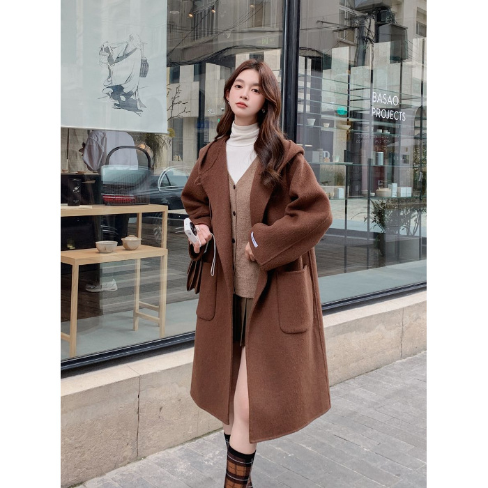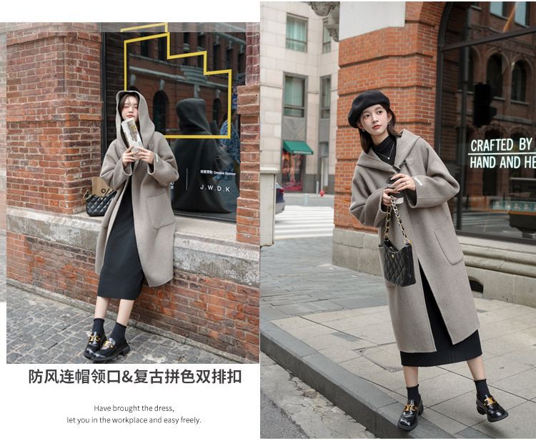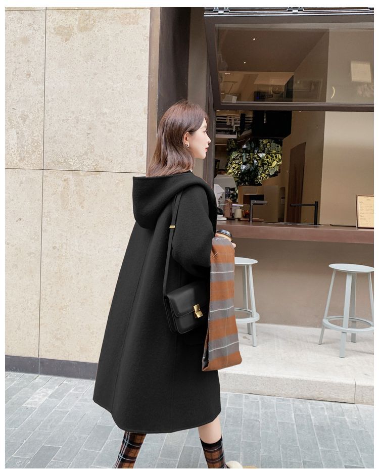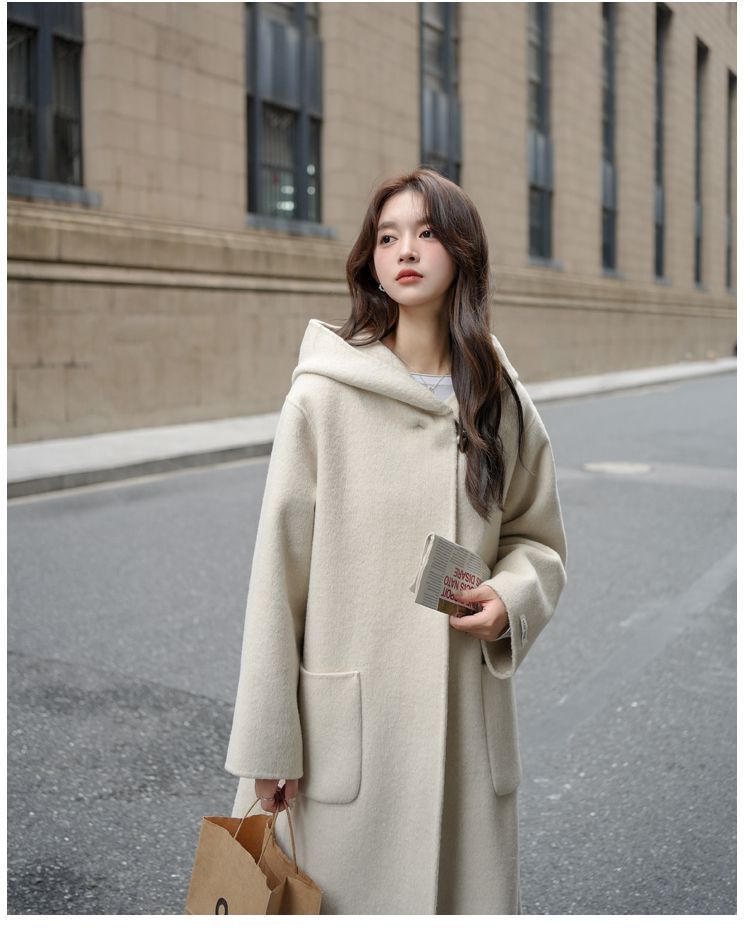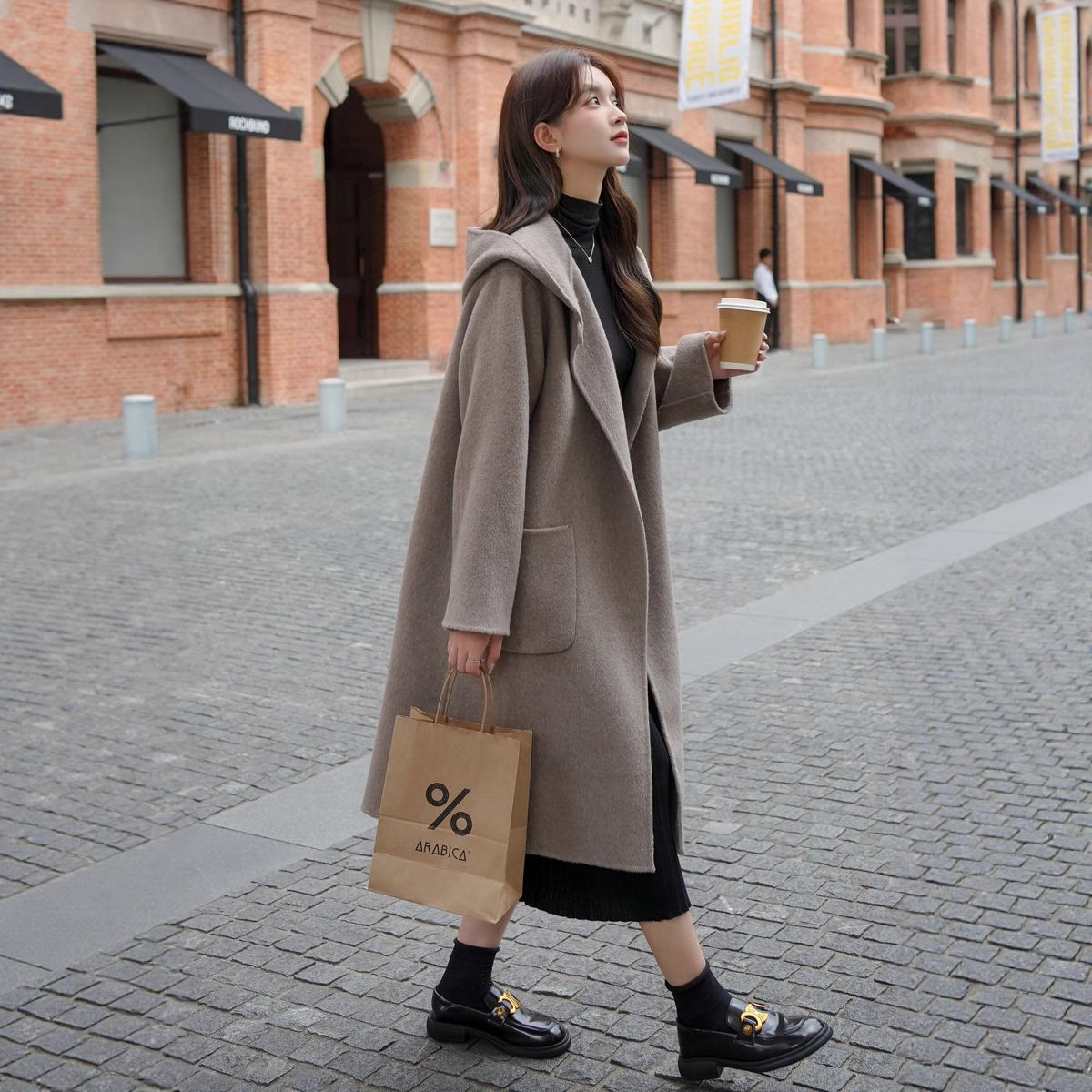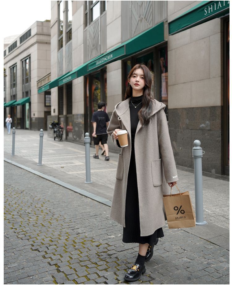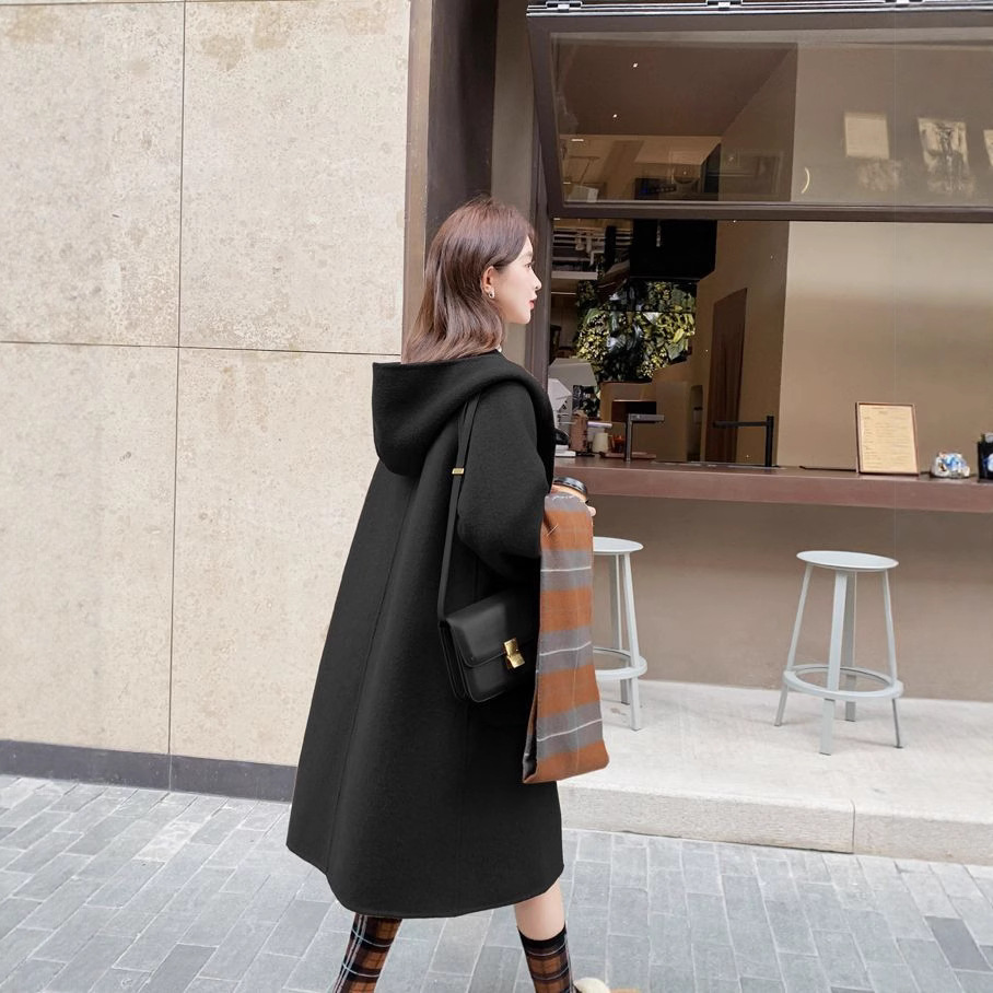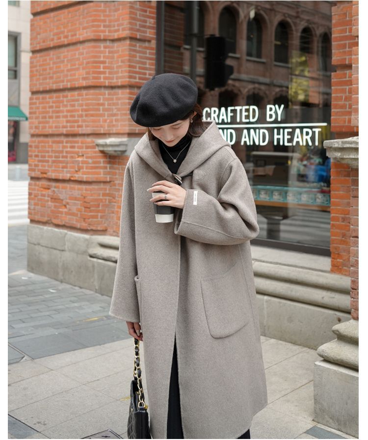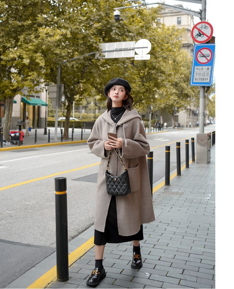 Шерстяная верхняя одежда женская 2024 осень-зима новая с роговыми пуговицами в стиле Хепберн средней длины с капюшоном