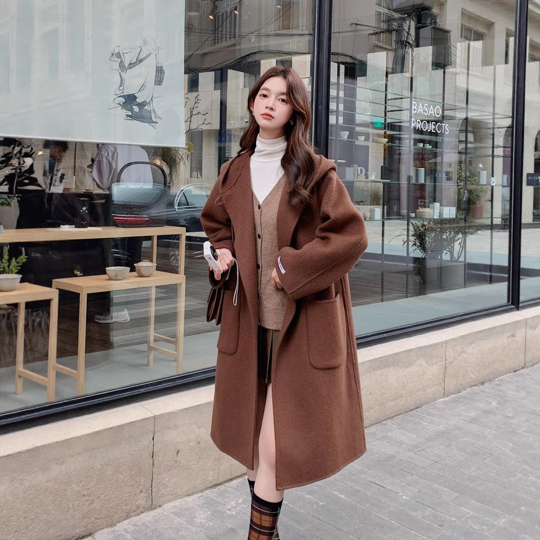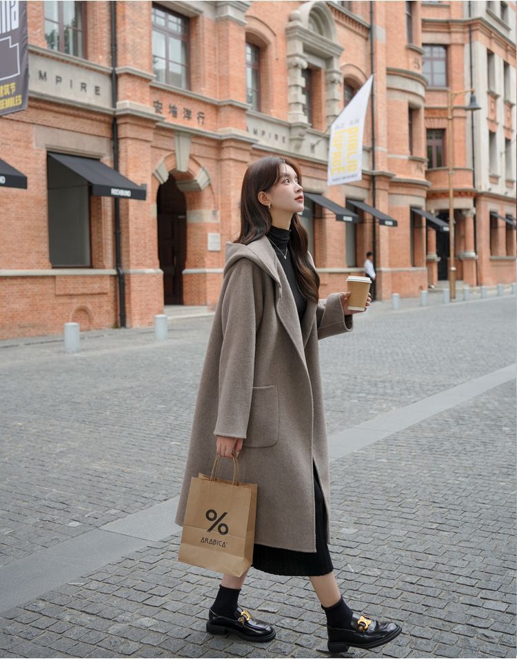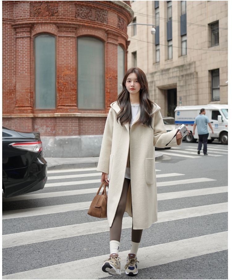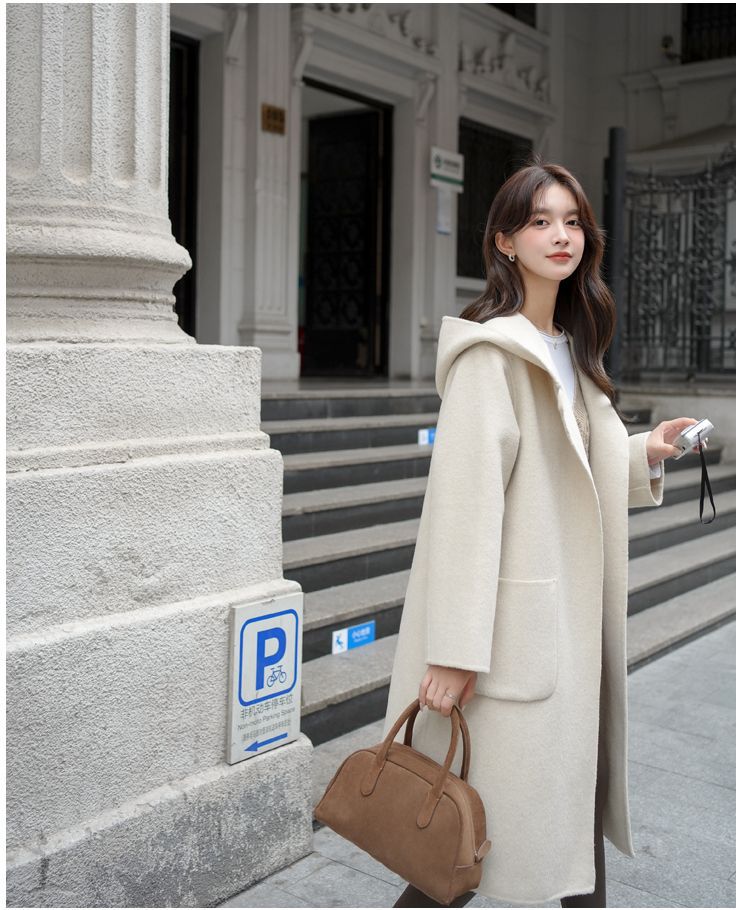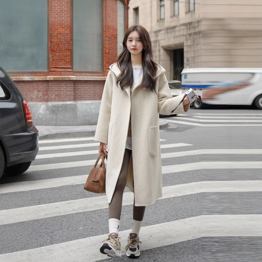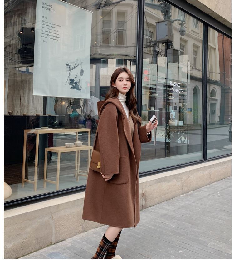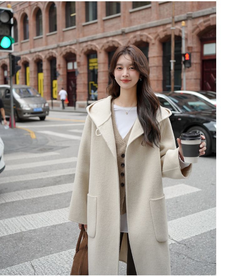 Шерстяная верхняя одежда женская 2024 осень-зима новая с роговыми пуговицами в стиле Хепберн средней длины с капюшоном