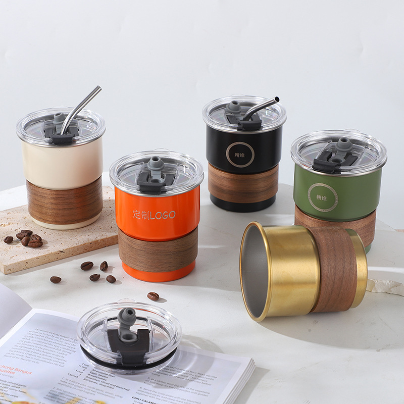 304 нержавеющая сталь утолщенные ступенчатые чашки деревянная теплоизоляционная соломка кофейная чашка наружная портативная мини-чашка оптом