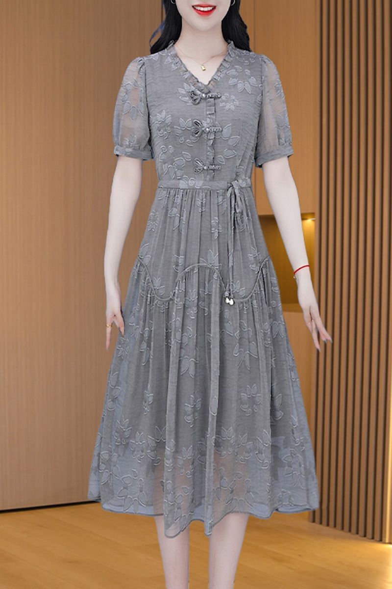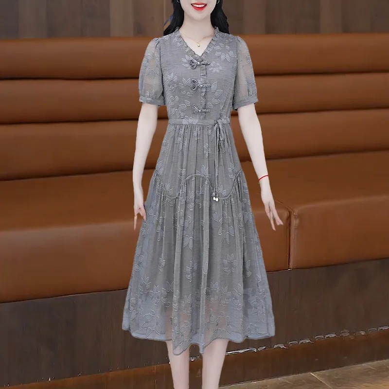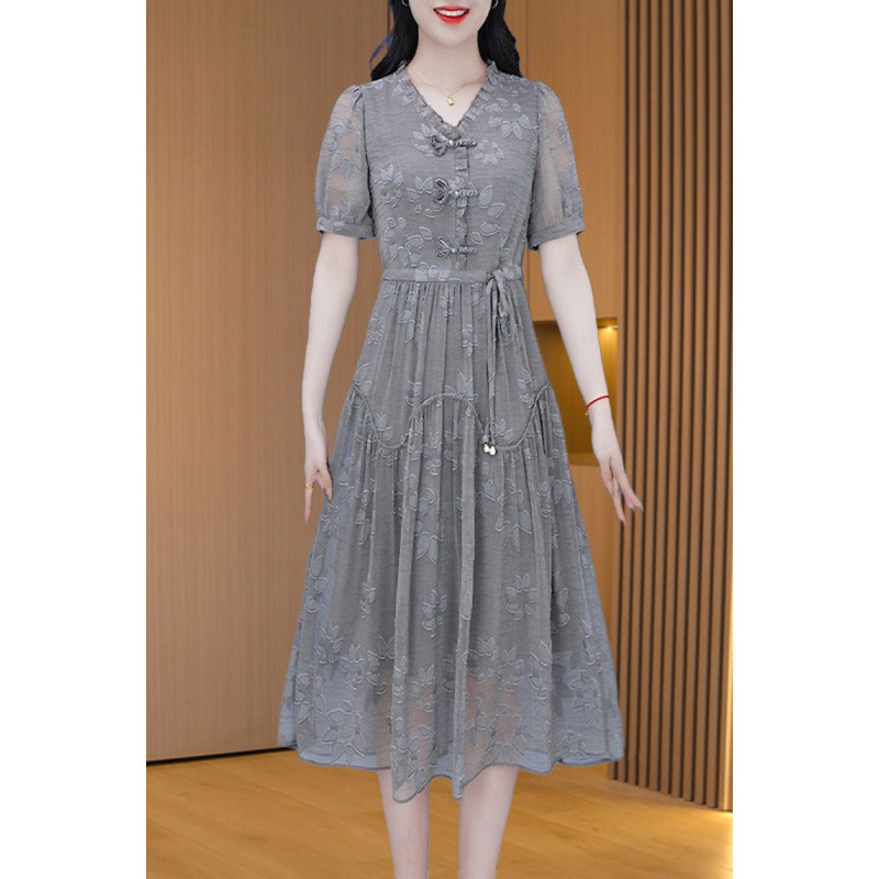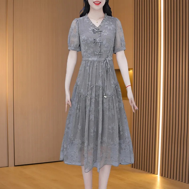 Новое платье с короткими рукавами в китайском стиле женское 2024 лето новая мода гриб минус возрастная талия тонкая юбка средней и длинной