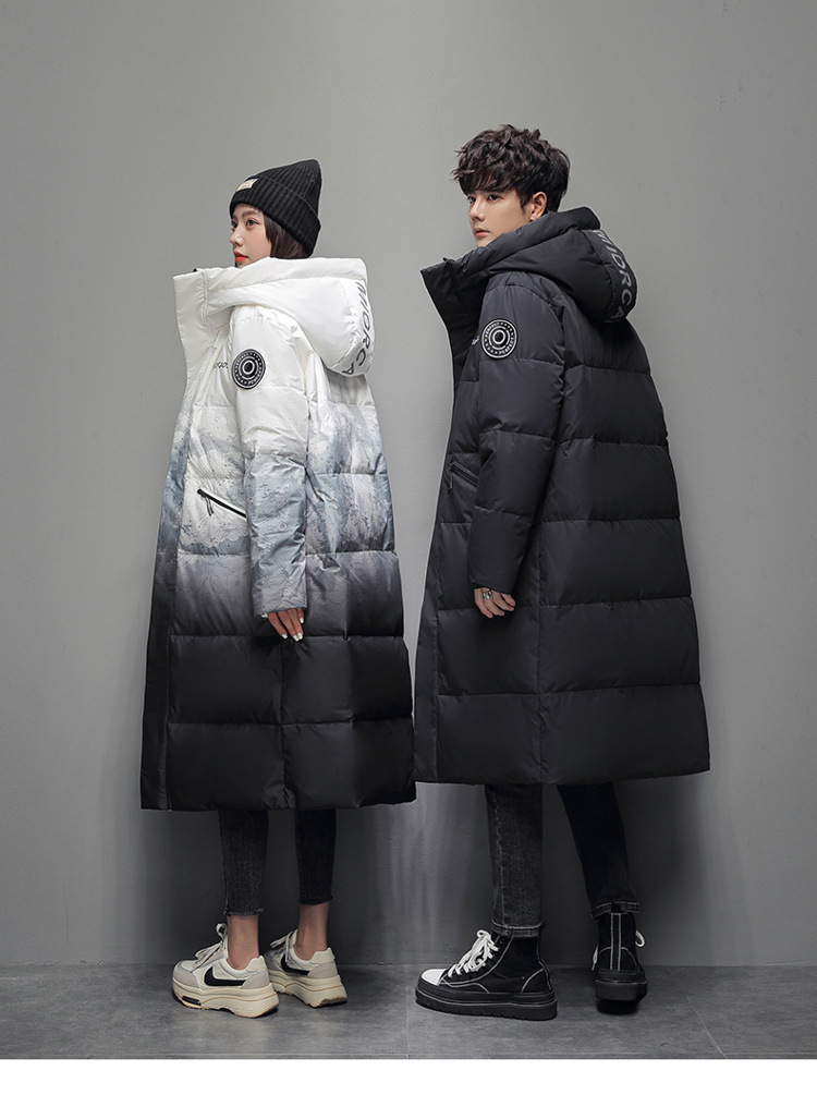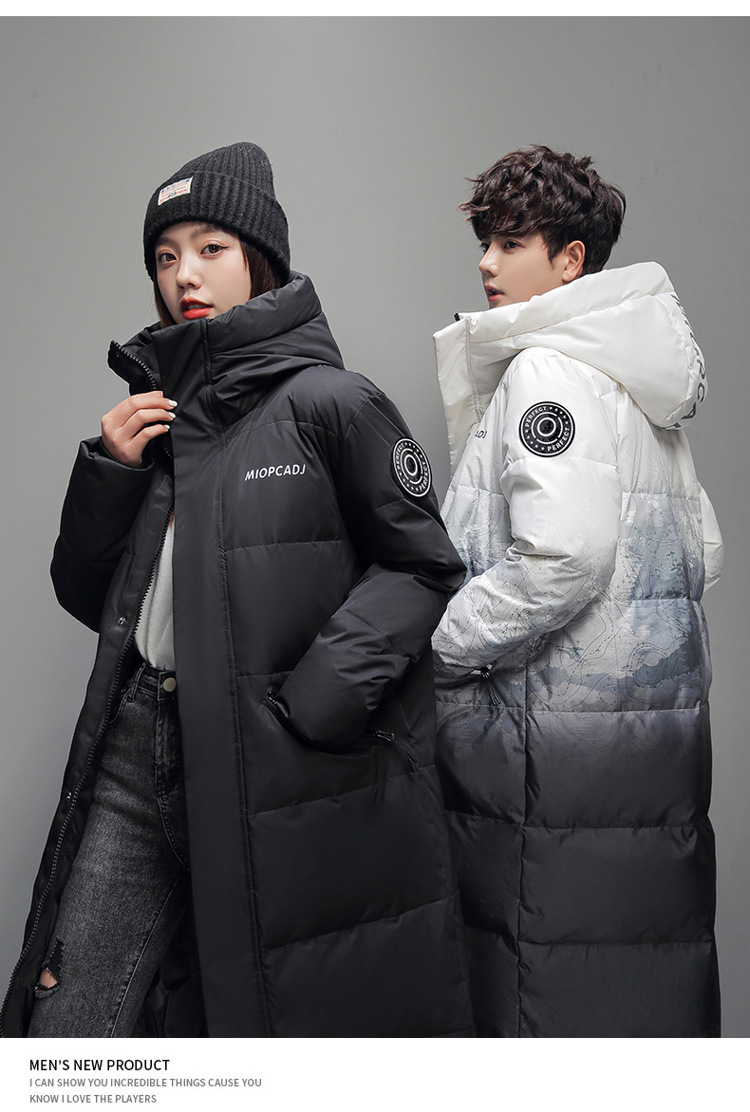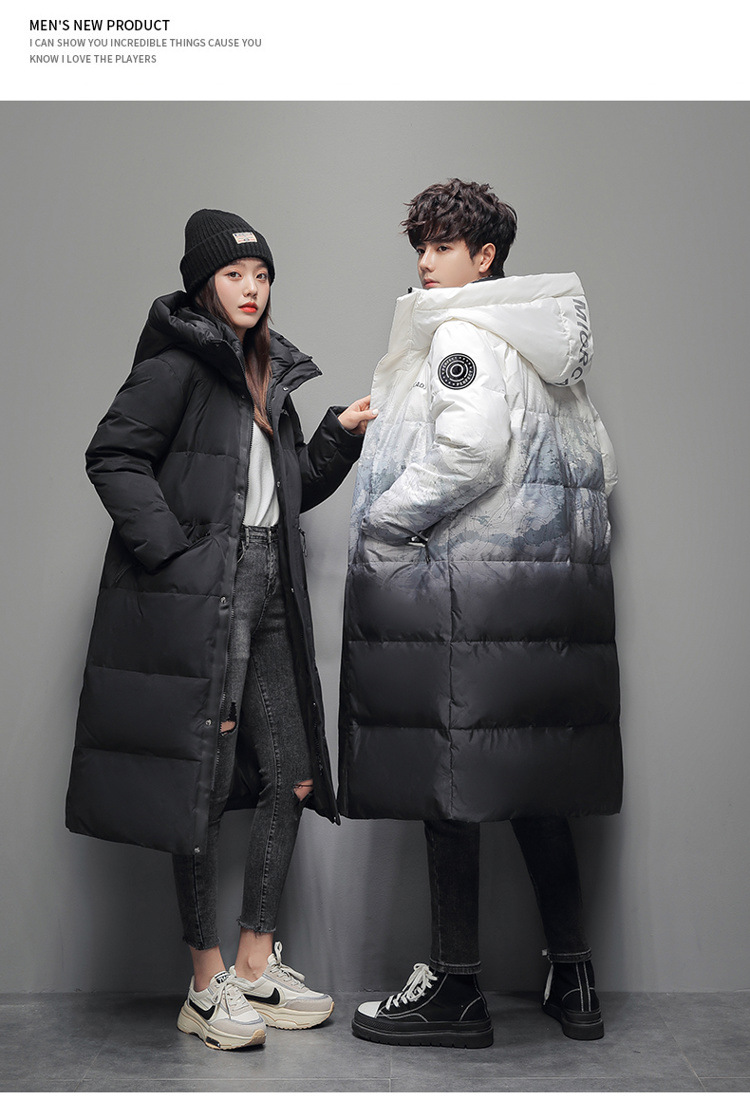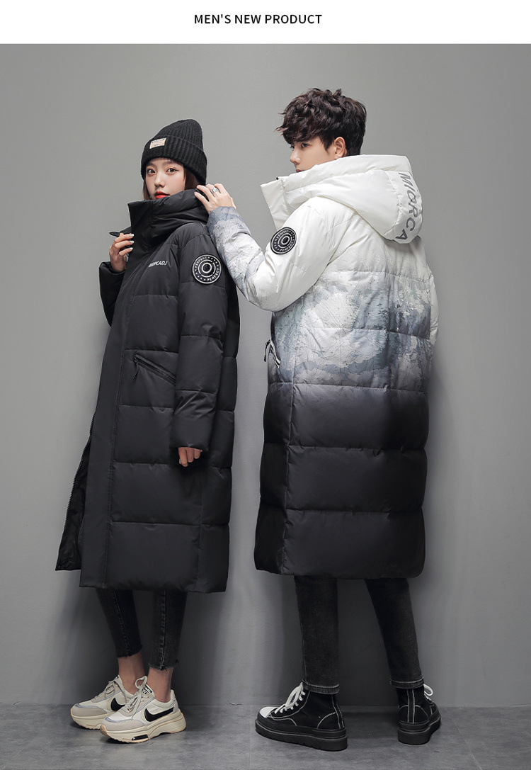 Новогодний пуховик больших размеров для полных зимних пар, мужской утолщенный длинный пуховик выше колена с градиентом и капюшоном 127.