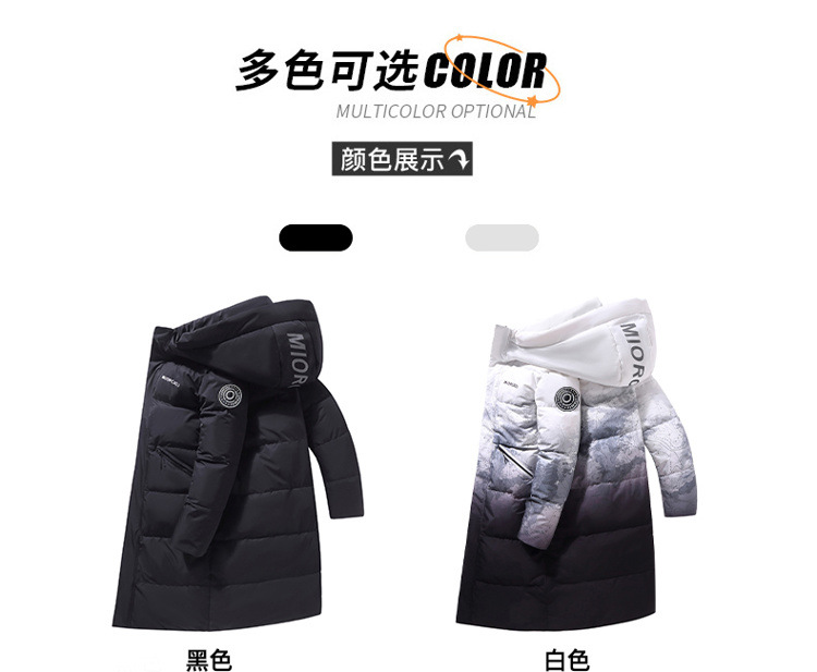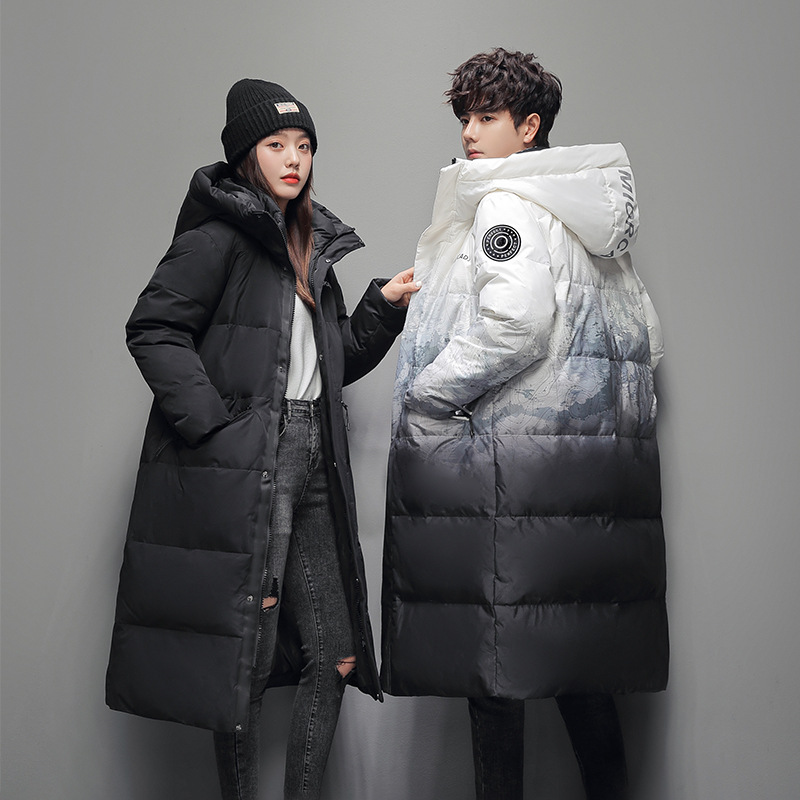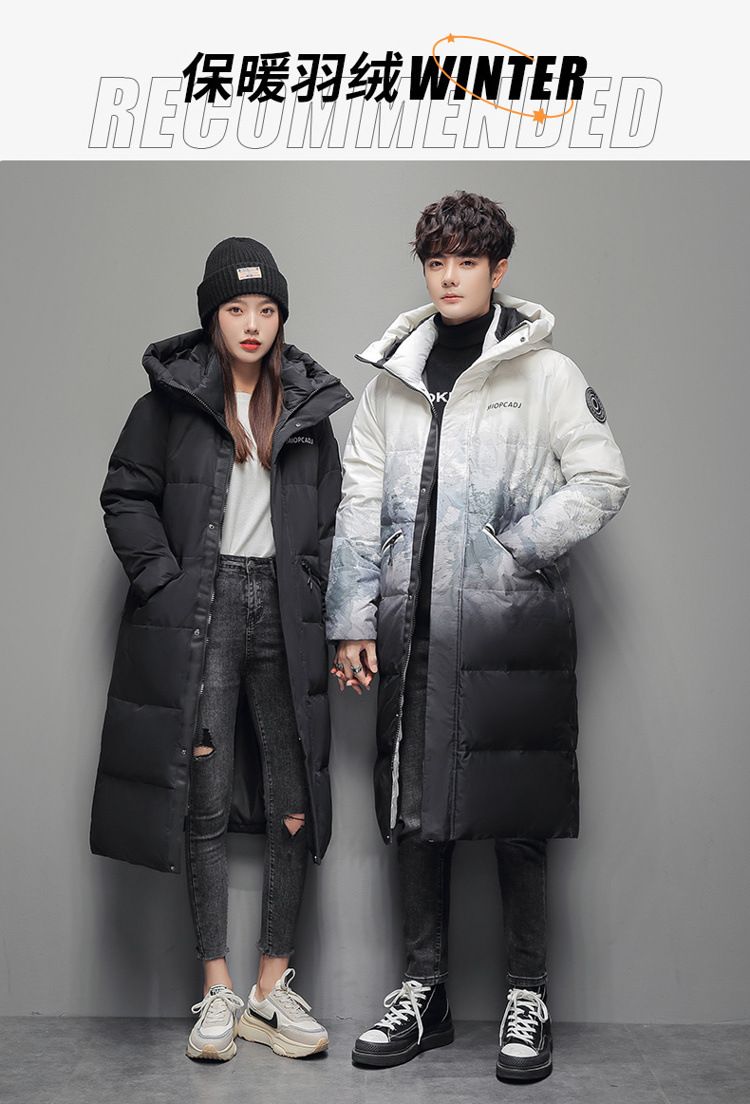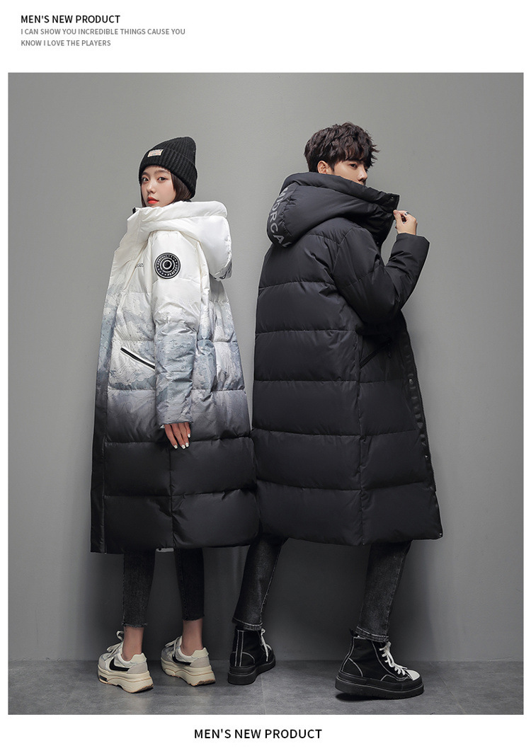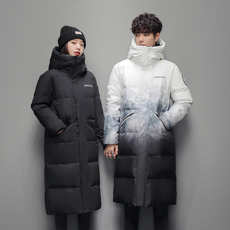 Новогодний пуховик больших размеров для полных зимних пар, мужской утолщенный длинный пуховик выше колена с градиентом и капюшоном 127.
