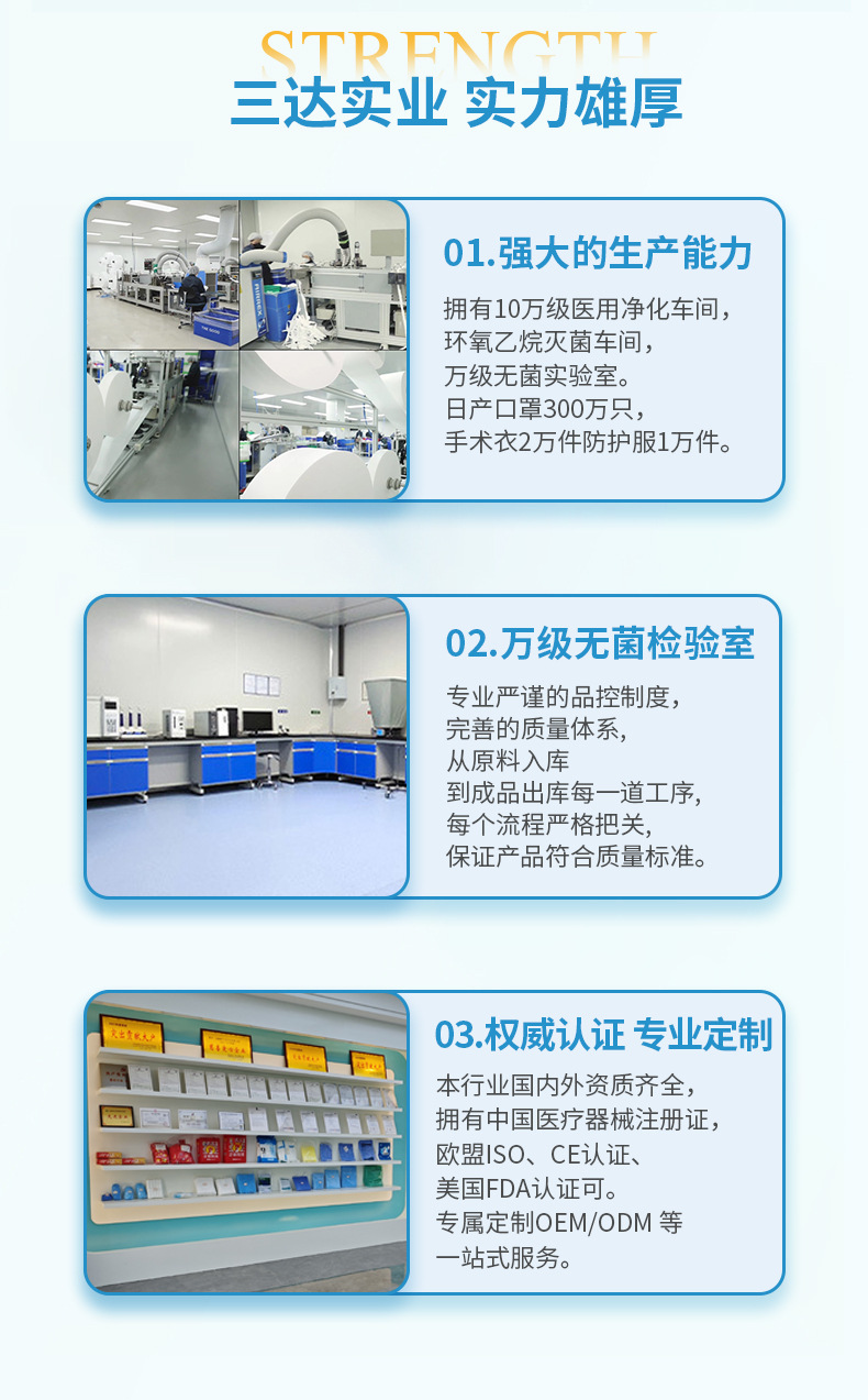 【产品材质】表层拒水无防布+2层医用熔喷布+里层亲肤无纺布