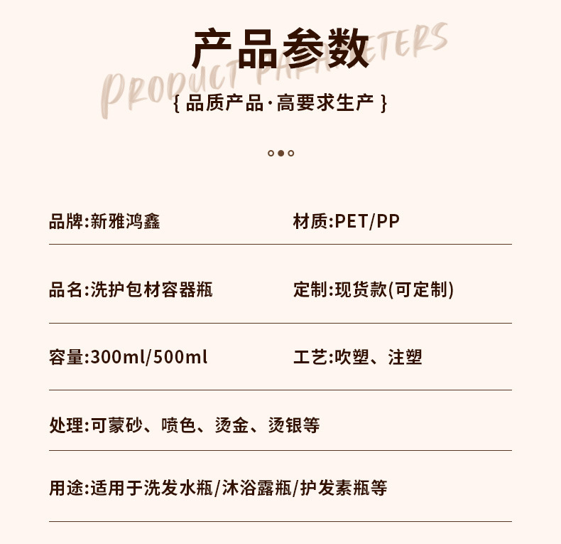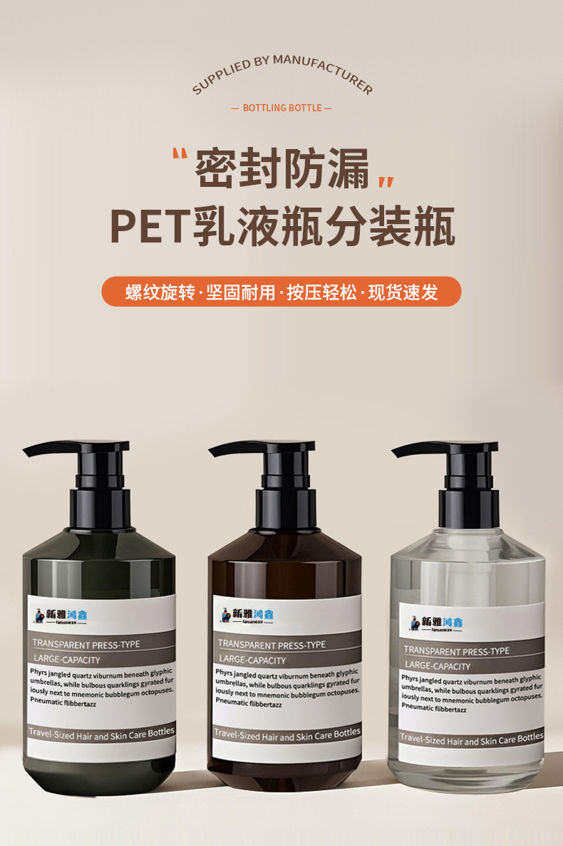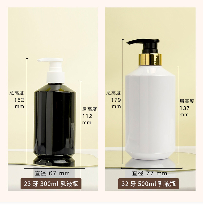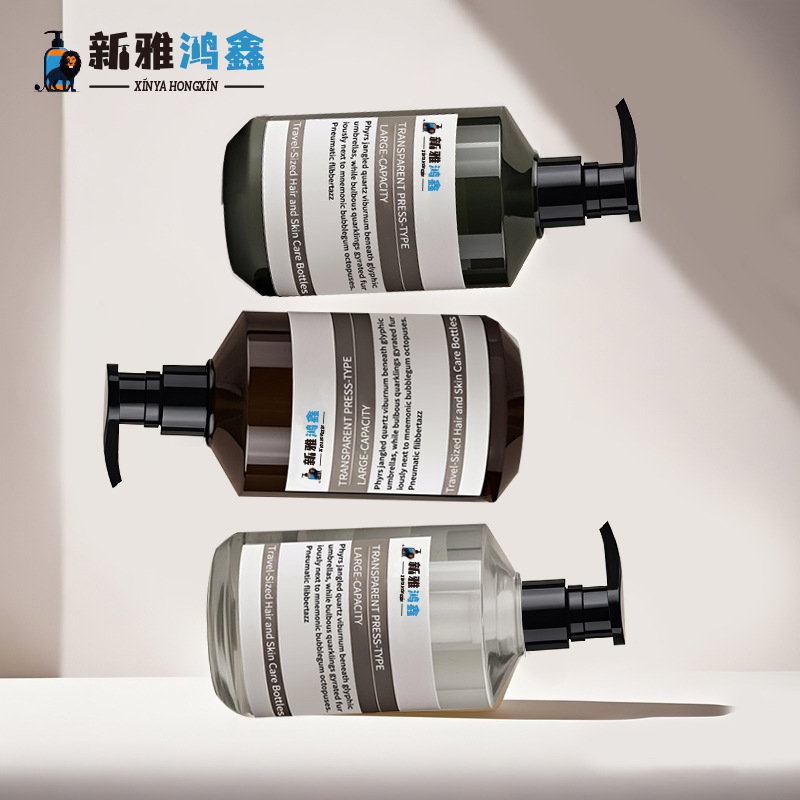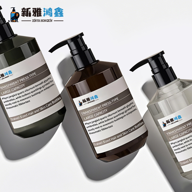 В наличии: флакон для шампуня 500 мл с наклонной горловиной, прозрачный пластиковый флакон для лосьона 300 мл, пустой флакон для косметики и туалетных принадлежностей.