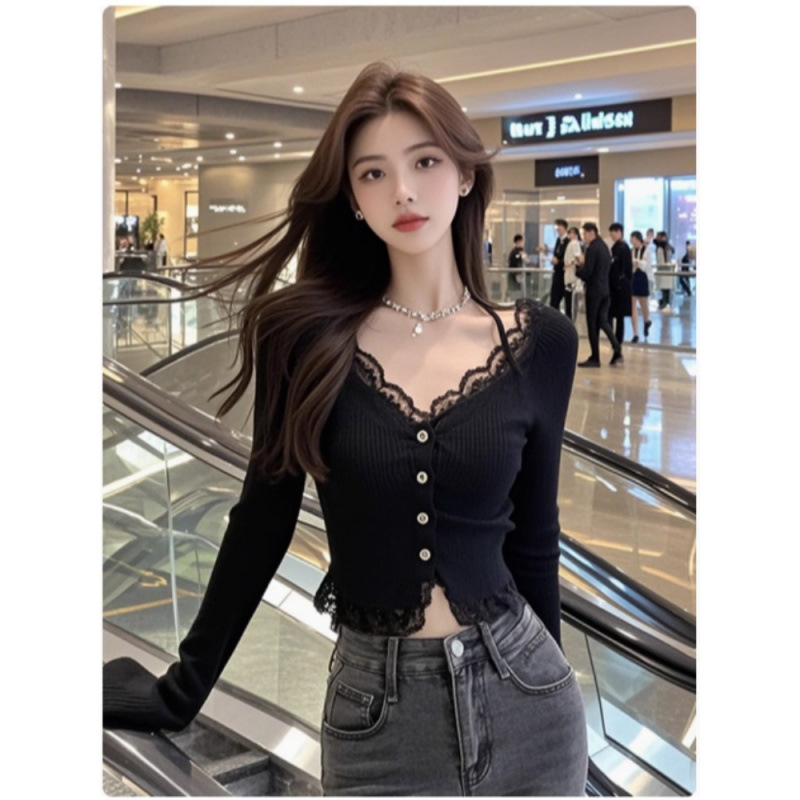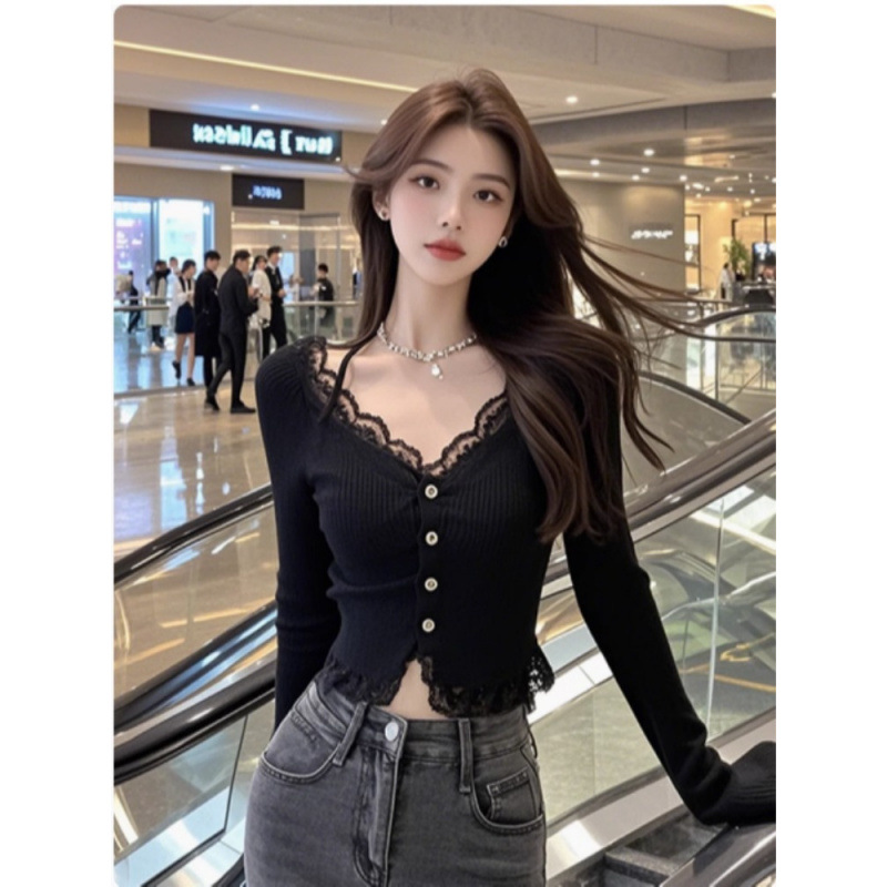 Весенняя и осенняя сексуальная кружевная сшитая футболка с длинными рукавами