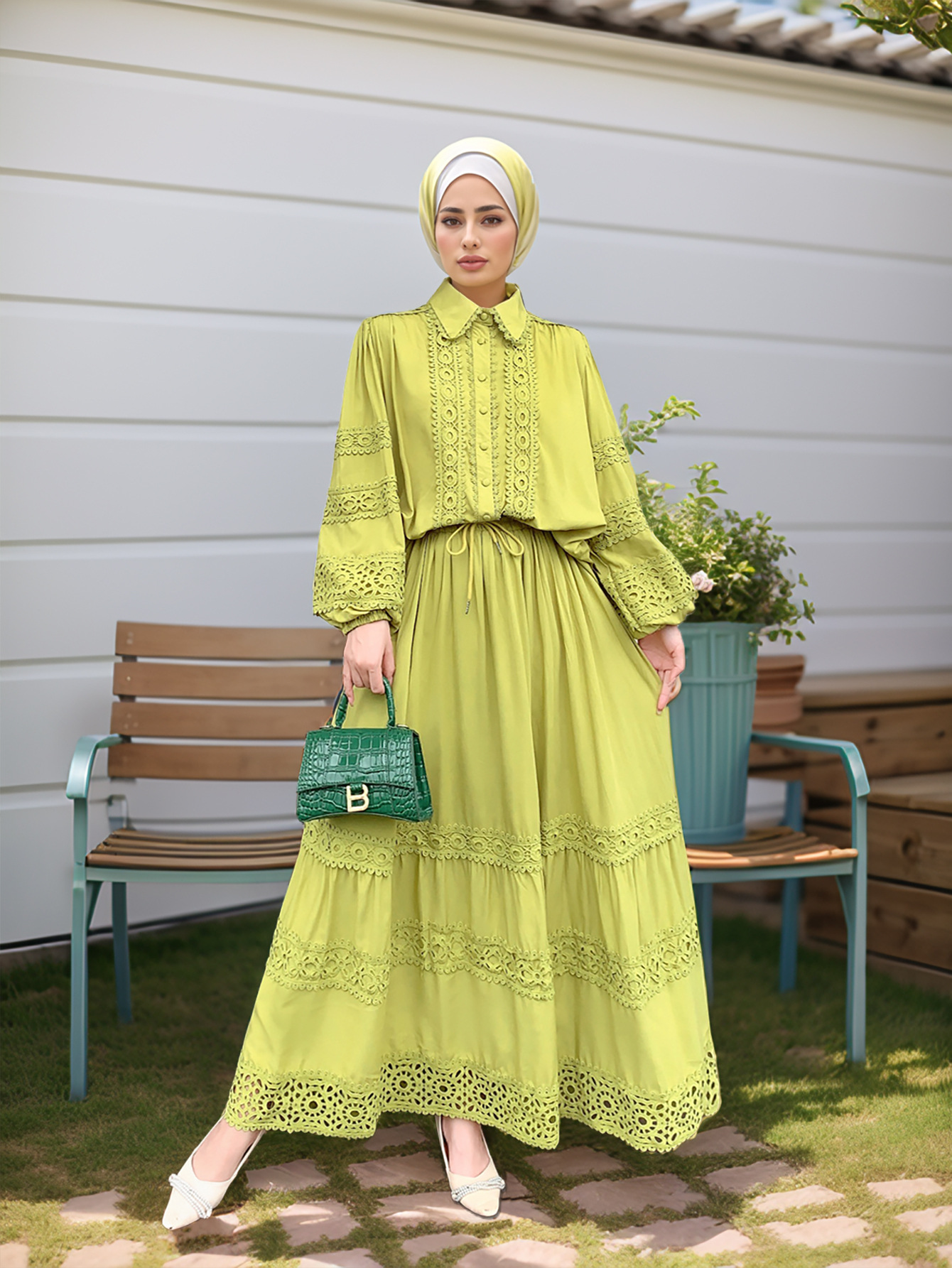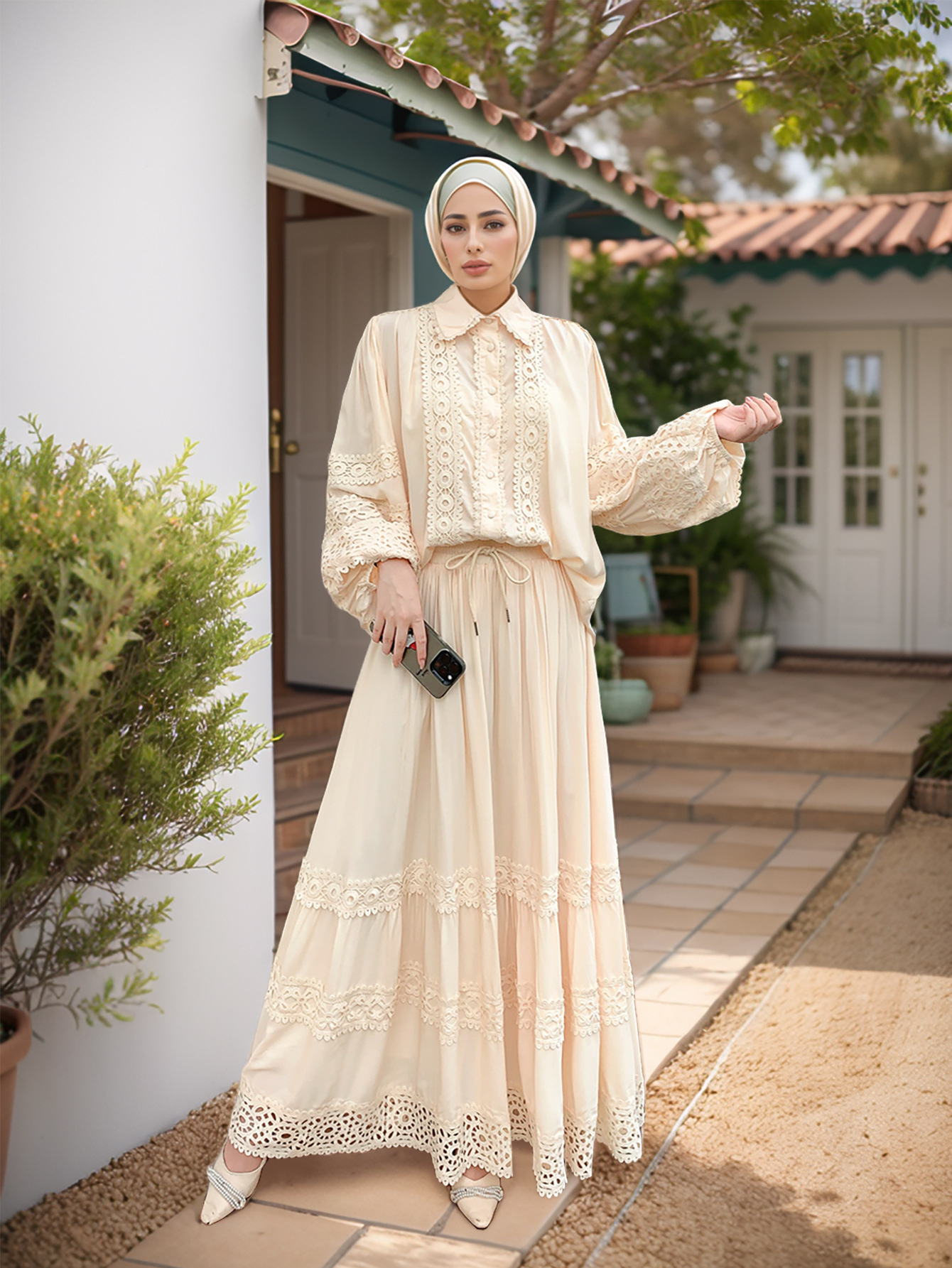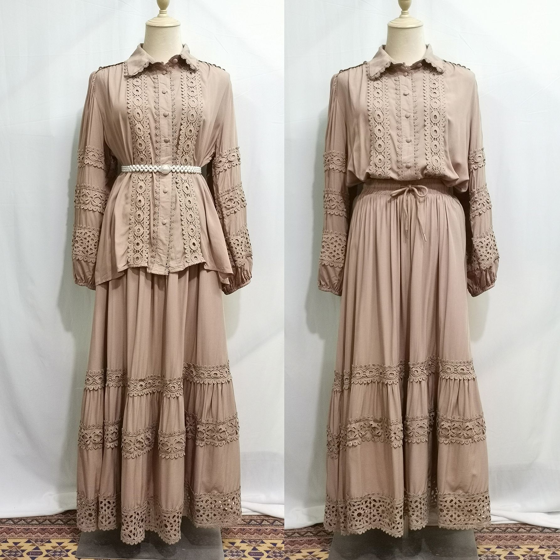 M301 # Хит продаж на Ближнем Востоке: женский мусульманский костюм из двух предметов — топ с ажурной кружевной отделкой и юбка с широким подолом.
