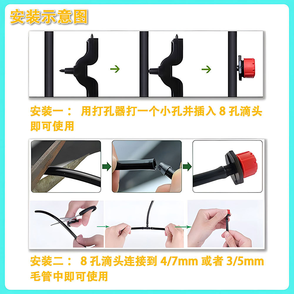 本款滴头可以调节流量,向左拧可以关闭,向右拧调节流量。