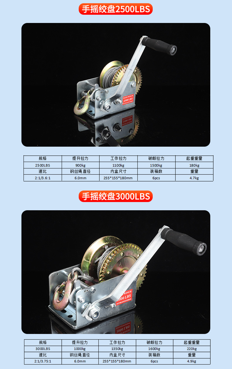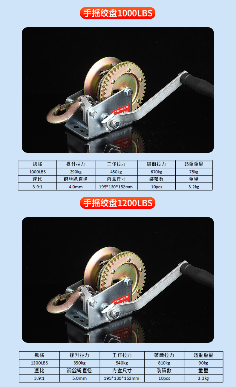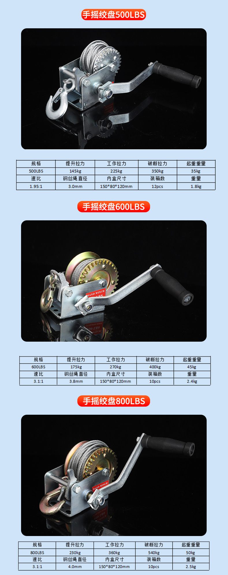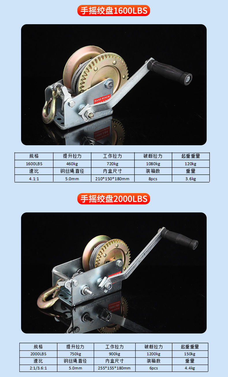 Ручная лебедка 500LBS; Ручная лебедка 800LBS; Ручная лебедка 1000LBS; Ручная лебедка 1200LBS; Ручная лебедка 1600LBS; Ручная лебедка 2000LBS; Ручная лебедка 2500LBS; Ручная лебедка 3000LBS; Самоблокируемая ручная лебедка 1200LBS; Самоблокируемая ручная лебедка 1800LBS; Самоблокируемая ручная лебедка 2600LBS