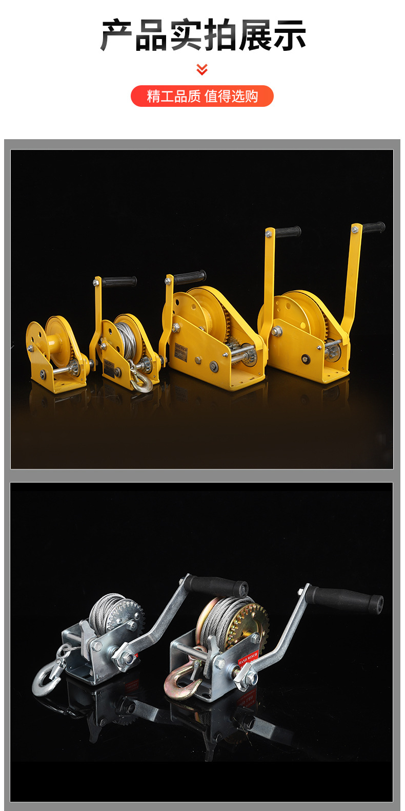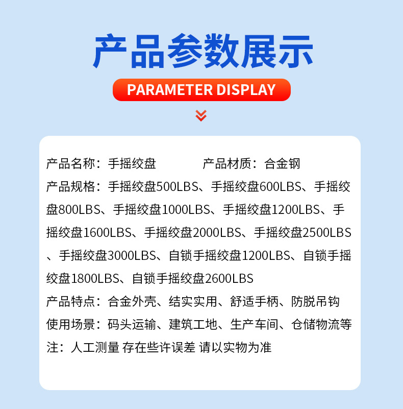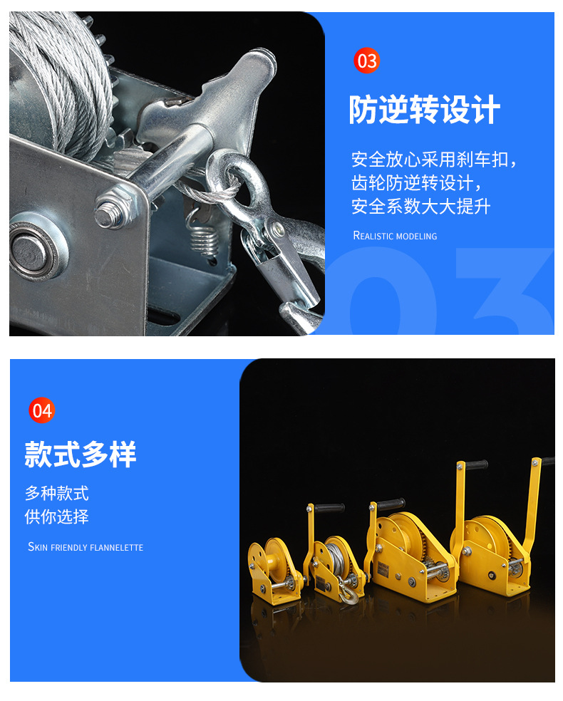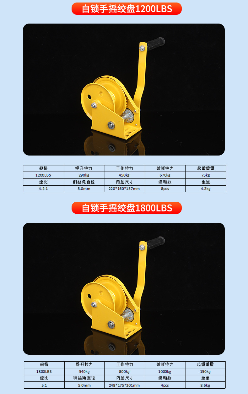 Ручная лебедка 500LBS; Ручная лебедка 800LBS; Ручная лебедка 1000LBS; Ручная лебедка 1200LBS; Ручная лебедка 1600LBS; Ручная лебедка 2000LBS; Ручная лебедка 2500LBS; Ручная лебедка 3000LBS; Самоблокируемая ручная лебедка 1200LBS; Самоблокируемая ручная лебедка 1800LBS; Самоблокируемая ручная лебедка 2600LBS