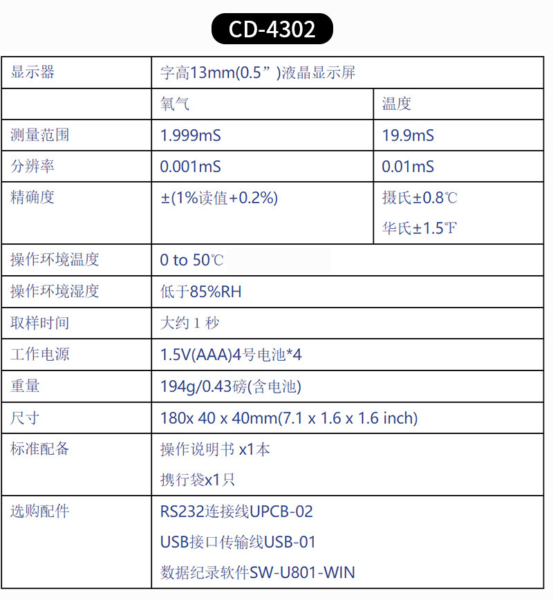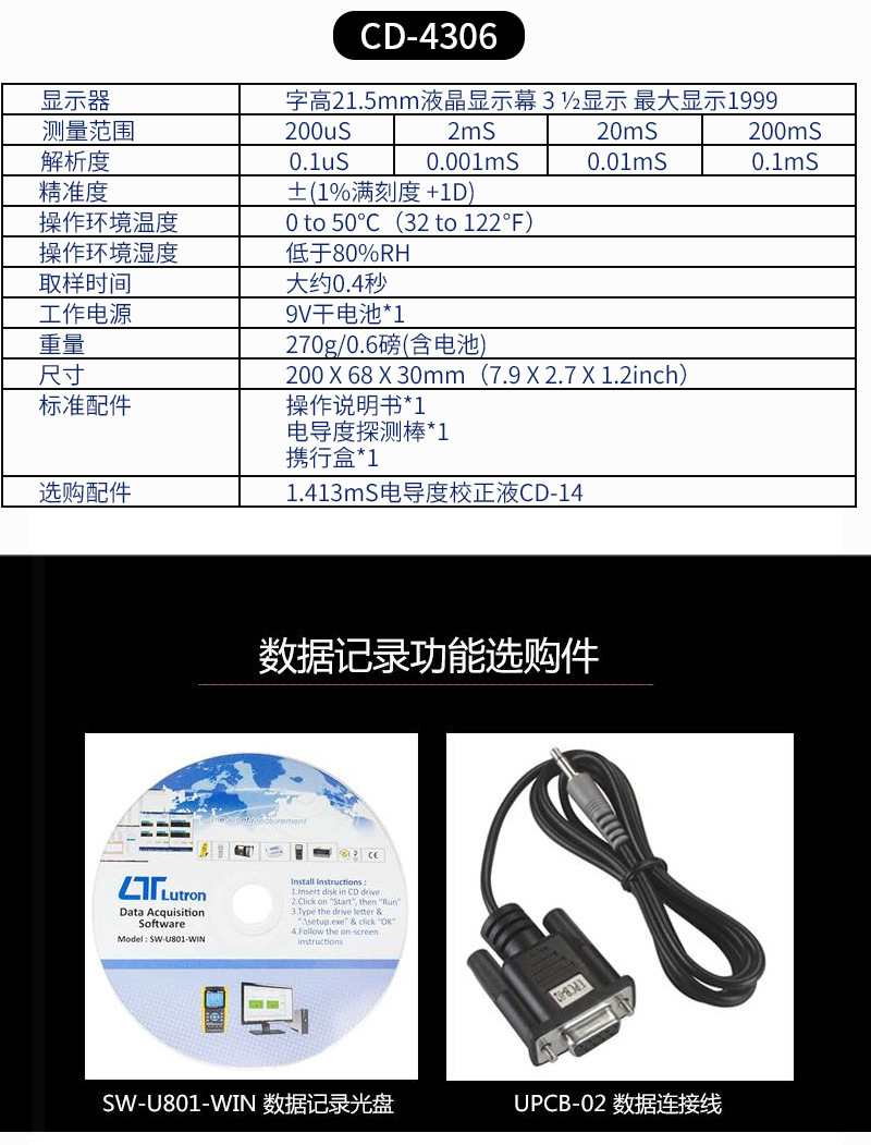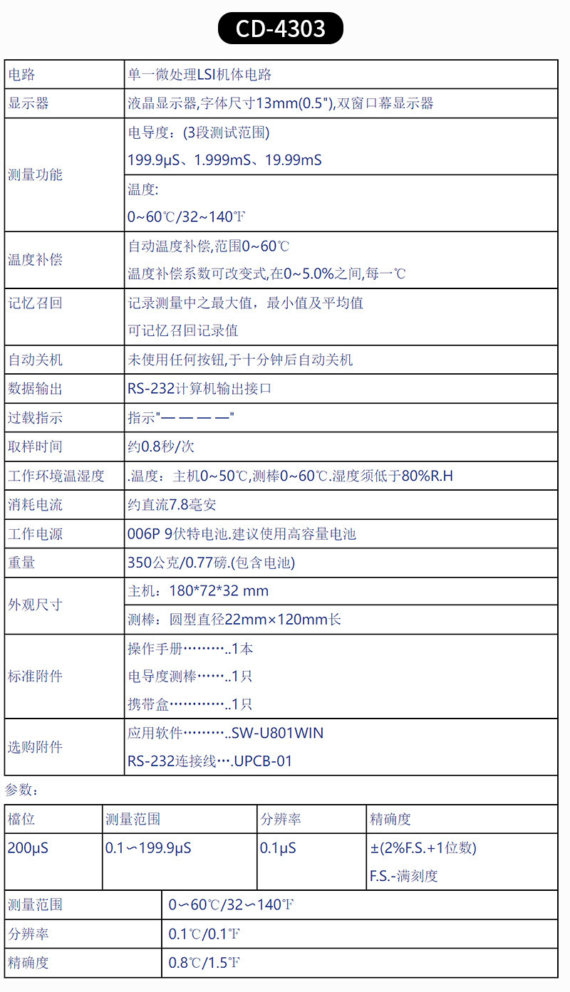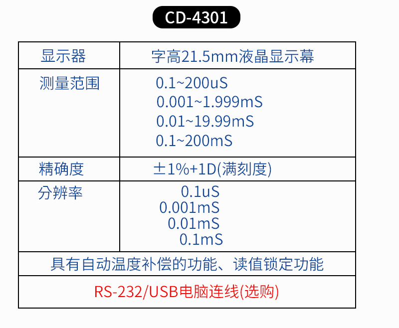 CD4301 измеритель проводимости 0,1~199,9 мкс 0,2~1,999 мс 2~19,99 мс 20~19; CD4302 мини-измеритель проводимости, проводник 0,001~1,999 мс 2~19,99 мс, автоматическая температурная компенсация; Измеритель проводимости CD4303 0,1~199,9 мкс 0,2~199,9 мс 4 уровня ± 1% 0~60℃ РС; CD4306 Измеритель проводимости 0,1~200 мкс 0,001~1,999 мс 0,01~19,99 мс 0.