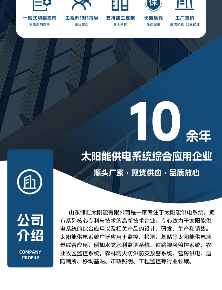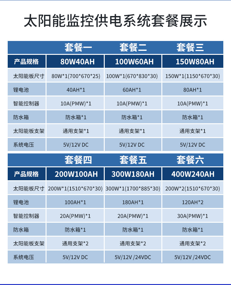 30 Вт 10 Ач (встроенный комплект из листового металла); 30 Вт 20 Ач (встроенный комплект из листового металла); 60 Вт 30 Ач (комплект картриджей); 60 Вт 30 Ач (комплект рычагов); 80 Вт 40 Ач (пакет 1); 100 Вт 60 Ач (пакет 2); 150 Вт, 80 Ач (третий пакет); 200 Вт 100 Ач (пакет 4); 200 Вт 120 Ач (пакет 5); 300 Вт, 180 Ач (шестой пакет); 400 Вт, 240 Ач (пакет 7); 80 Вт 40 Ач (литий-железо-фосфатный аккумулятор); 120 Вт 60 Ач (литий-железо-фосфатный аккумулятор); Контроллер можно обновить до дистанционного управления синхронизацией через 4G.; Обратитесь в службу поддержки клиентов, чтобы получить список индивидуальных решений для системы электропитания.