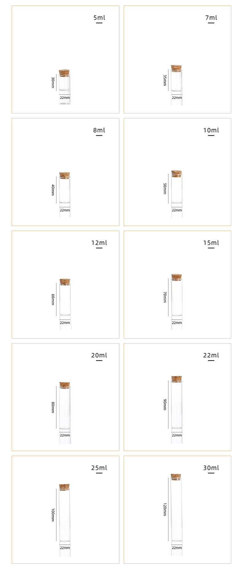 22*30 5 мл прямой горлышко с пробкой; прозрачный; 22*35 7 мл прямой горлышко, пробка; прозрачный; 22*40 8 мл прямой горлышко пробка; прозрачный; 22*50 10 мл прямой горлышко, пробка; прозрачный; 22*60 12 мл прямой горлышко с пробкой; прозрачный; 22*70 15 мл прямой горлышко, пробка; прозрачный; 22*80 20 мл прямой горлышко с пробкой; прозрачный; 22*90 22 мл пробка с прямым горлышком; прозрачный; 22*100 25 мл прямой горлышко, пробка; прозрачный; 22*120 30 мл прямой горлышко, пробка; прозрачный; 22*150 40 мл прямой горлышко, пробка; прозрачный