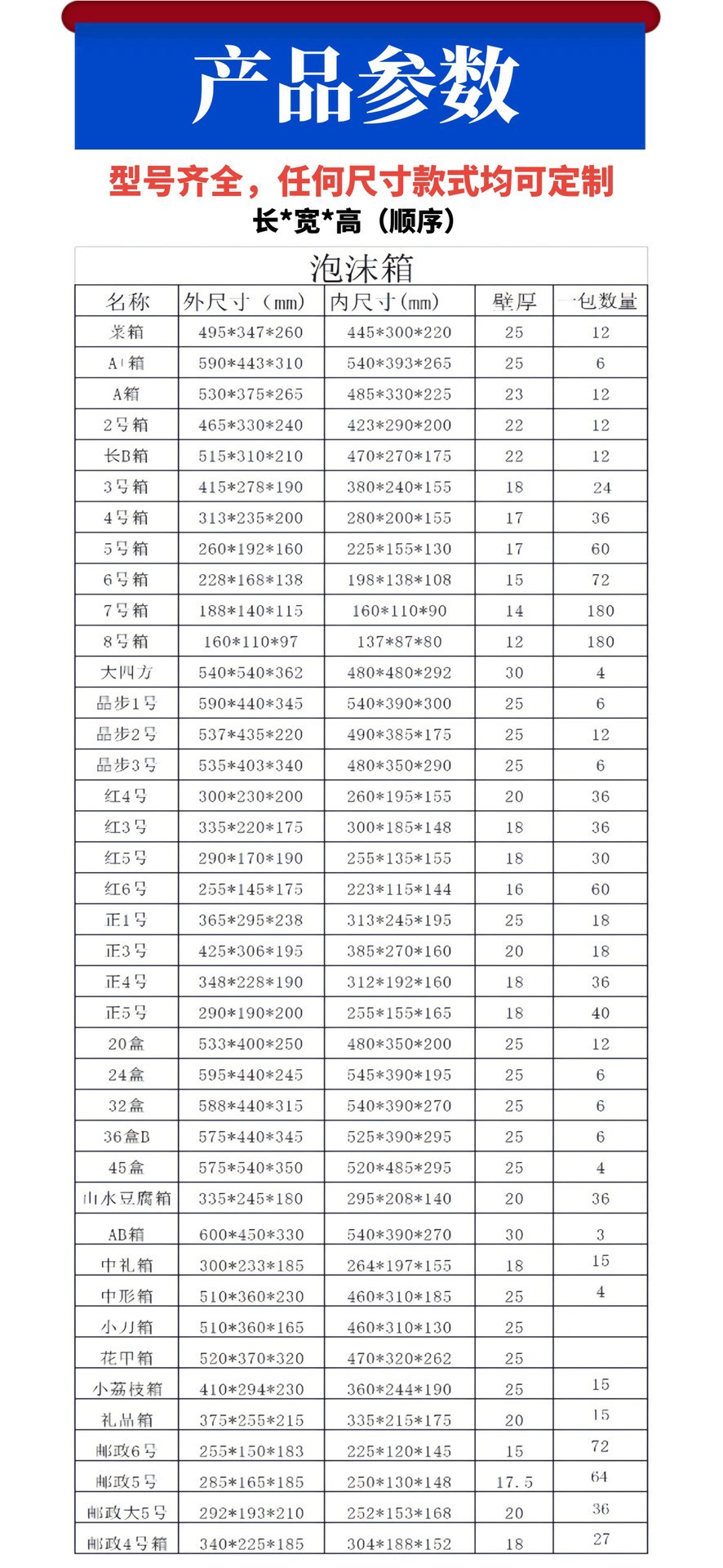 2.5kg установлено 29*18*20; 5kg установлен 35*18,5*22; Красный №4 (300*230*200)мм; Красный №3 (335*220*175)мм; Небольшая пенопластовая коробка для ножей (510*360*165) мм.; Пенопластовая коробка Хуа Цзя (520*370*320)мм; Пост 8 (208*108*135); Коробка АВ (600*450*330)мм (1 упаковка 3 шт.); Подарочная коробка среднего размера (300*233*185)мм (15 штук в упаковке); Коробка из пенопласта (530*375*265)мм (12 штук в упаковке); Позитив №1 (365*295*238) (1 упаковка 18 шт.); Коробка пенопластовая длинная Б (515*310*210)мм (по 1 упаковке по 12 шт.); 20 коробок (533*400*250)мм (1 упаковка 12 шт.); Почтовый №4 + трехслойная коробка (27 штук в упаковке); Пенопластовая коробка А+пятислойная картонная коробка (1 упаковка по 6 шт.); Пенопластовая коробка + пятислойная картонная коробка (1 упаковка по 12 шт.); BBB(462*348*200)мм(1 упаковка 12 шт.); Коробка пенопластовая №2 (465*330*240) мм (1 упаковка 12 шт.); Коробка для овощей (495*347*260)мм (1 упаковка 12 шт.); Пенопластовая коробка А+ (590*443*310)мм (1 упаковка 6 шт.); Цзинбу №1 (590*440*345) (1 упаковка 6 шт.); Цзинбу №2 (537*435*220) (1 упаковка 12 шт.); Пенопластовая коробка Long B + трехслойная коробка (1 упаковка по 12 шт.); Большая квадратная коробка из пенопласта (540*540*362) (1 упаковка 4 шт.); Большая квадратная пенопластовая коробка + пятислойная коробка (1 упаковка по 4 шт.); Пенопластовая коробка Positive B + пятислойная коробка (1 упаковка по 12 шт.); 24 коробки (595*440*245)мм (1 упаковка 6 шт.); Цзинбу №3 (535*403*340)мм (1 упаковка 6 шт.); Красный №6 (255*145*175)мм (1 упаковка 60 шт.); 32 коробки (588*440*315)мм (1 упаковка 6 шт.); 45 коробок (575*540*350)мм (в упаковке 4 шт.); Почтовая Служба 7 (225*130*155) (1 упаковка 72 шт.); Коробка пенопластовая №2 + картонная коробка пятислойная (465*330*240) мм (1 упаковка 12 шт.); Почтовая большая коробка из пенопласта 5 + коробка; 10kg установлен 43*24.5*28.5; 1.5kg установлен 27*15.5*16.5; 2kg установлено 28*16*18; Пенопластовая коробка №3 + трехслойная коробка (24 шт. в упаковке); №3 (415*278*190) (24 штуки в упаковке); №1 высокий ящик 35,5*29,5*32,5; 2B 50*36*36.8; 35 коробок 51,5*36,5*36,5; Нестандартный №4 32,3*24,5*22; Пенопластовая коробка №6 (72 шт./упак.); Почтовый №6 (255*150*183) мм (72/уп.); Почтовый №5 (285*165*185) мм (64/упак.); Подарочная коробка (375*255*215)мм (15 шт/уп); Почтовый размер 5 (292*193*210 мм (36 шт./упак.); Почтовый №5 + трехслойная коробка ((64 шт в упаковке)); Почтовый №6 + трехслойная коробка (72 шт в упаковке); Пенопласт №6 + трехслойная коробка (1 упаковка 72 шт.); Коробка из алюминиевой фольги №2 48,3*34,5*26,5; Большая коробка из алюминиевой фольги 1 размера 43*31,5*26; Посылка 5, коробка из алюминиевой фольги (29,5*17,5*20,3); Коробка из алюминиевой фольги Post 6 (26,5*16*20,1); Почтовый №8 208*108*135 (по 120 брат/пакет); Почтовый №7 225*130*155 (72 шт/упаковка); Позитивный B (458*365*255) (12 шт./упак.); Коробка из алюминиевой фольги №1 38,8*31*21; Вишневая коробка (на фото по 18 шт./упак.); Пенопластовая коробка J8 (34*28*31) 12 шт./упак.; Пенопластовая коробка Shanshui 335*245*180мм, 36шт/уп.; 75 коробок пенопластовых коробок + картонных коробок (4 шт./упак.); 75 коробок пенопластовых коробок 740*553*365мм, 4 шт/уп.; Нестандартный пенопластовый ящик №5 (54 шт. в упаковке); Нестандартная пенопластовая коробка №5 + трехслойная коробка (1 упаковка 54 шт.); Нестандартный №4 (28 штук в упаковке); Почтовый №3 + картонная коробка (18 штук в упаковке); Почтовый №3 (1 упаковка 18 шт.); Нестандартный пенопласт №4 + трехслойная коробка (28 шт. в упаковке); На 1 размер больше (410*294*230) (18 шт/упак.); Большой 1 размер + картонная коробка (в соответствии с 18 шт./упак.); Коробка средней формы (510*360*230)мм, 1 упаковка 10 шт.; Почтовый №4 (1 упаковка, 27 штук)