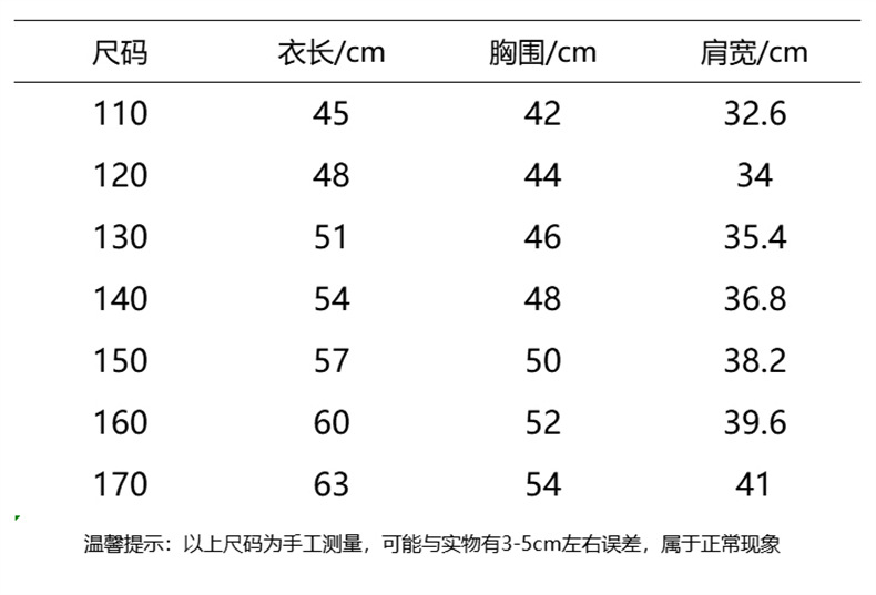 110cm; 120cm; 130cm; 140cm; 150cm; 160cm; 170cm