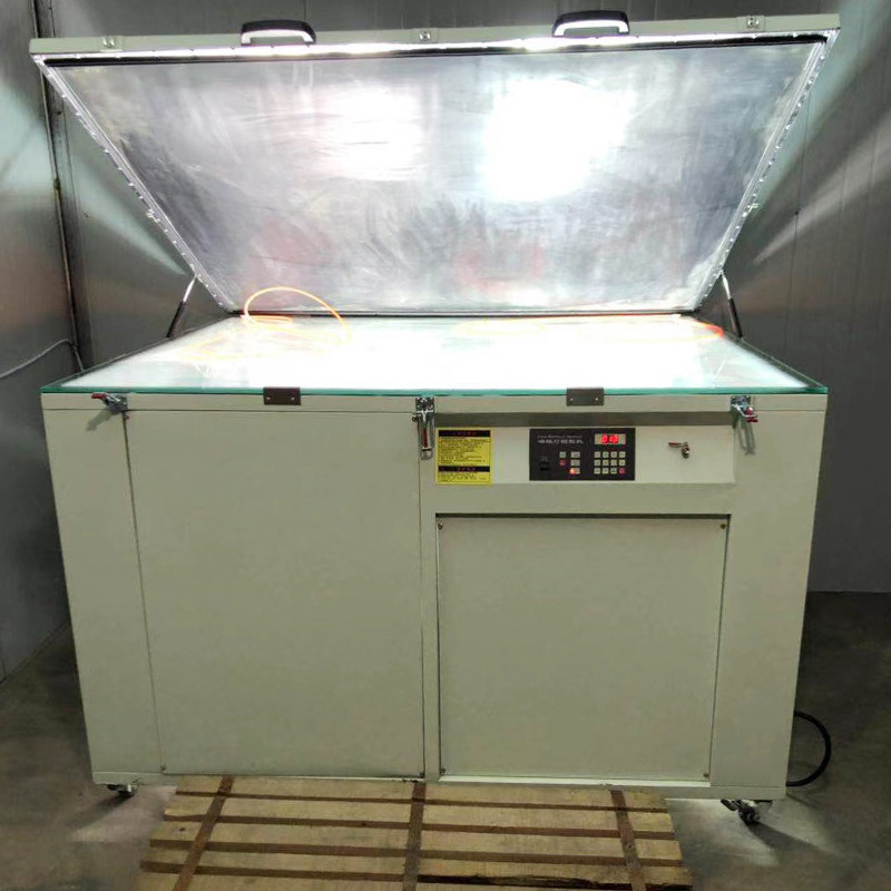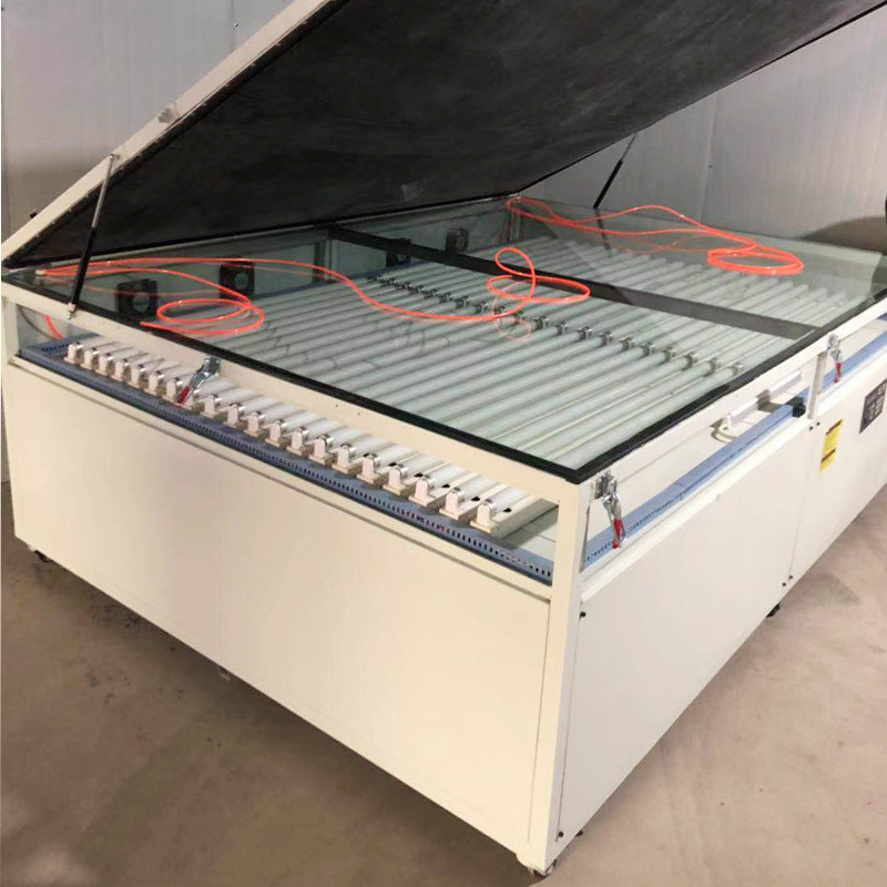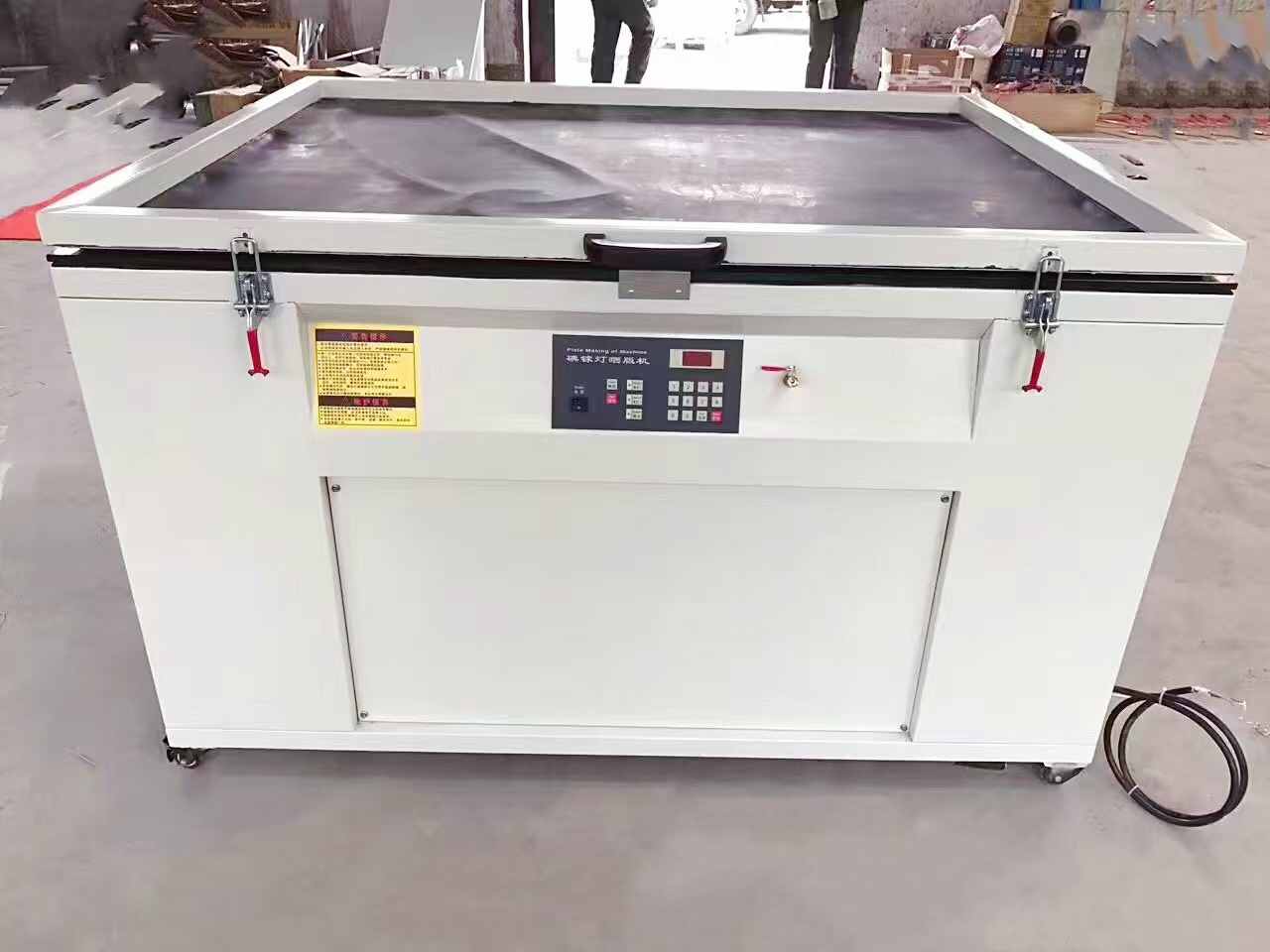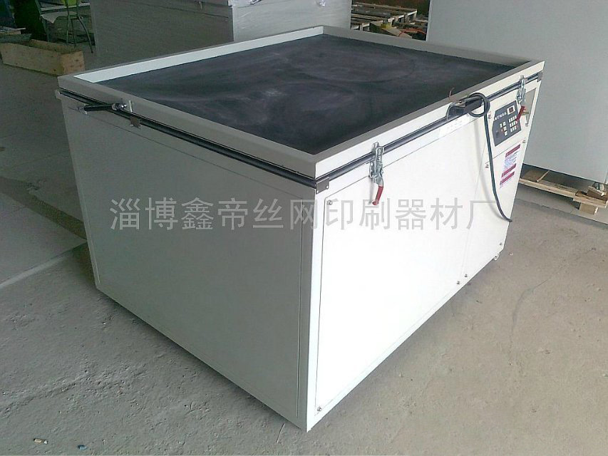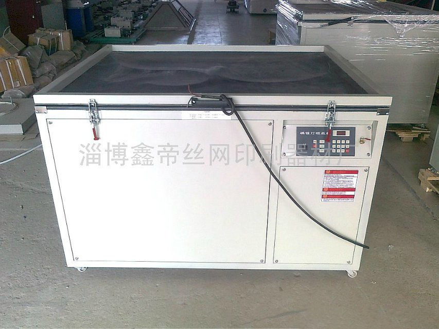打开电源开关、对版灯亮、风机旋转。轻轻将图布感光胶网框及菲林放置于玻璃台板上,对好位置,避免碰撞损坏玻璃台面,影响感光效果,用软布将网框四角盖好,放下橡皮框并锁紧,避免网框上毛刺刺破橡皮造成损坏。