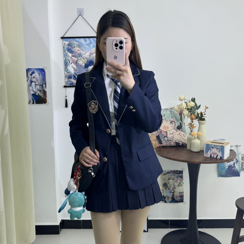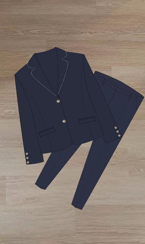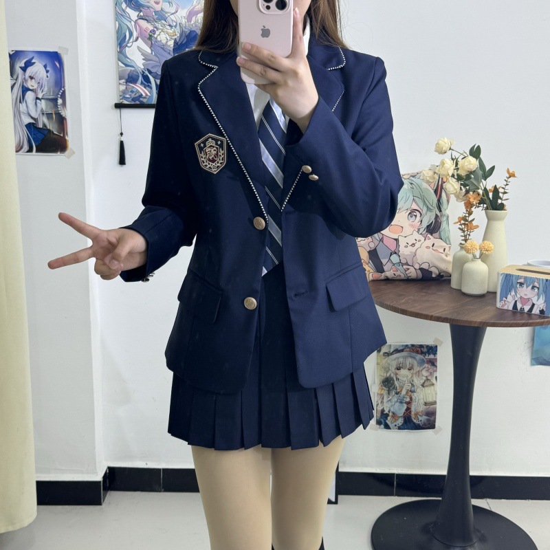 Цельный женский костюм в белую полоску; Цельный белый мужской костюм в полоску; Синяя юбка А-силуэта + носки; Голубые мужские брюки; женская белая рубашка с длинным рукавом; Мужская белая рубашка с длинным рукавом; Женский костюм в белую полоску + белая длинная рубашка + голубая юбка А-силуэта + галстук в синюю полоску + значок; Мужской костюм в белую полоску + белая длинная рубашка + голубые брюки + галстук в синюю полоску + значок