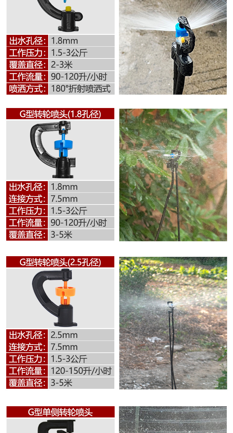 7.5G тип преломляющий световой туман (отверстие 1.0); 7.5G тип преломляющий свет туман (1.2 отверстия); 7.5G тип преломляющий свет туман (1.8 отверстия); 7.5G тип преломляющий световой туман (2.5 отверстия); Лопастной насос с плоским соплом типа 7.5G (1.8 отверстия); Лопастной насос с плоским соплом типа 7.5G (2.5 отверстия); 7.5G тип винтовое зубчатое желтое колесо; Наклонное колесо типа 7,5G; 7.5G тип 180 градусов одностороннее преломление; 7.5G тип односторонний импеллер; Алюминиевая головка типа 7.5G с плоским преломлением; 7.5G тип алюминиевой головки с вогнутой преломляющей поверхностью (вода выделяется при нажатии вниз); 7.5G тип полукруглой крыльчатки с открытым сечением; 7.5G тип с трехпоточным плоским рабочим колесом; 7.5G тип интегрированного плоского рефрактора с отверстием 2.0; 7.5G тип интегрированного плоского рефрактора с отверстием 3.0; 7.5G тип с интегрированной вогнутой рефракцией и отверстием 2.0; 7.5G тип с интегрированной вогнутой рефракцией и отверстием 3.0; 6.0G тип преломляющего светового тумана; Лопастной насос с плоским рабочим колесом типа 6.0G