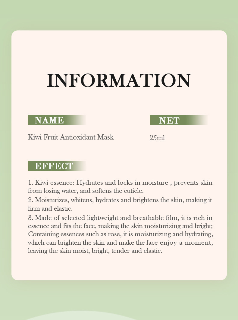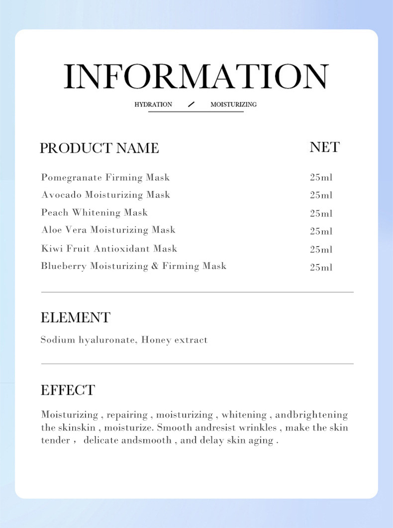 Маска авокадо 25 мл [только для экспортных продаж внешней торговли]; Маска граната 25 мл [только для экспортных продаж внешней торговли]; Персиковая маска 25 мл [только для экспортных продаж внешней торговли]; Увлажняющая маска Aloe Vera 25 мл [только для внешнеторговых экспортных продаж]; Увлажняющая маска Lanyuan 25 мл [только для экспортных продаж внешней торговли]; Маска киви 25 мл [только для экспортных продаж внешней торговли]