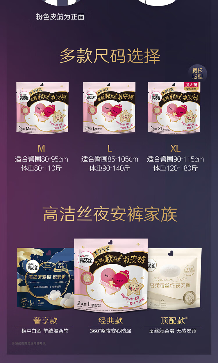 Ночные брюки размера М, 2 пары/упаковка (штрих-код: 402, 32 упаковки/коробка); Ночные брюки размера L 2 пары/упаковка (штрих-код: 4039, 32 упаковки/коробка); Ночные брюки размера XL, 2 пары в упаковке (штрих-код: 4886, 24 упаковки в коробке); Ночные брюки L размера 4 пары/упаковка (штрих-код: 4435, 8 упаковок/коробка); Брюки Юань, размер L, 6 пар в упаковке (штрих-код: 4534, 8 упаковок в коробке, 5 + 1 шт. в дополнительном количестве); Шелковые ночные брюки размера L, 2 пары в упаковке (штрих-код: 4084, 32 упаковки в коробке)