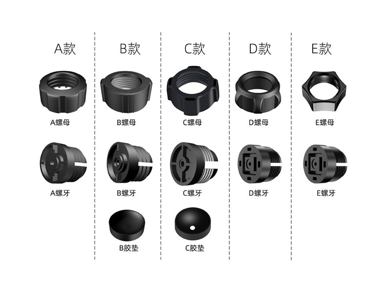 Гайка типа А; Резьба типа А; Согласование типа А [гайка + резьба]; Гайка типа B; Резьба типа B; Резиновая прокладка типа B; Соответствие типа B [гайка + нить + резиновая прокладка]; Гайка типа С; Резьба типа C; Резиновая прокладка типа C; Соответствие типа C [гайка + нить + резиновая прокладка]; Гайка типа D; Резьба типа D; Согласование типа D [гайка + резьба]; Гайка типа Е; Резьба типа Е; Соответствие типа E [гайка + резьба]