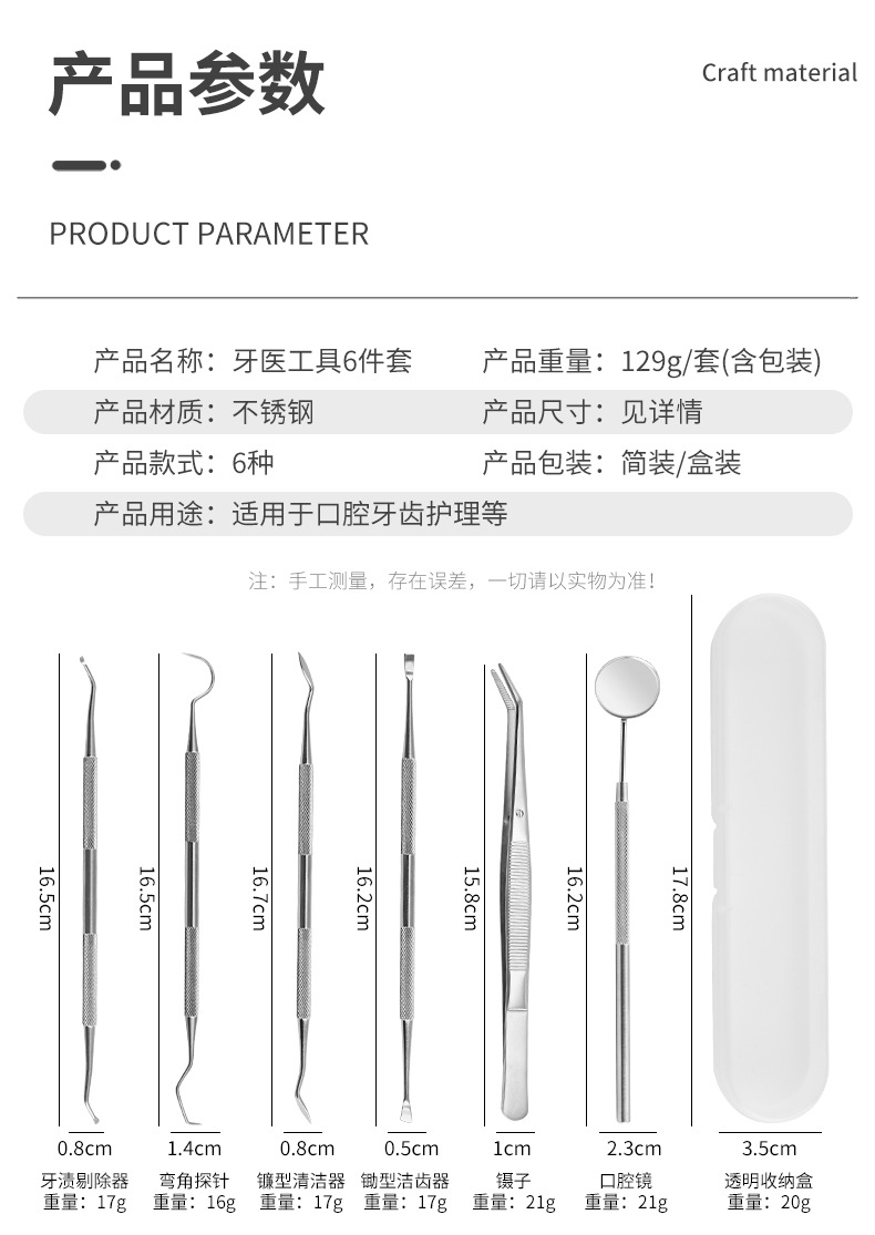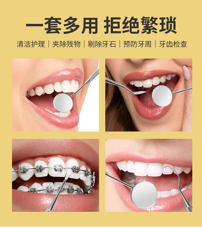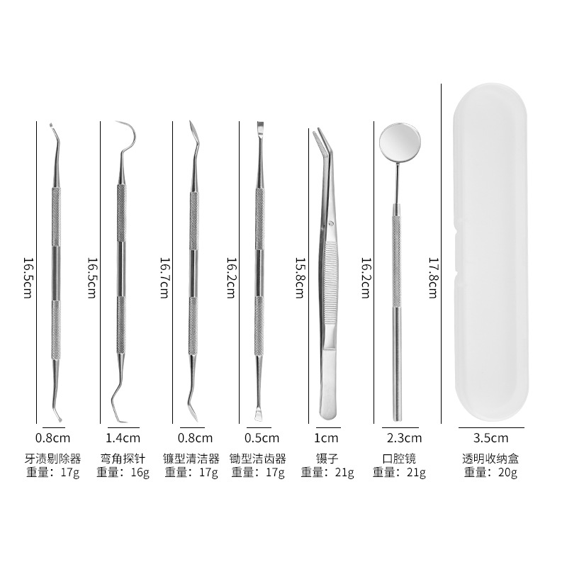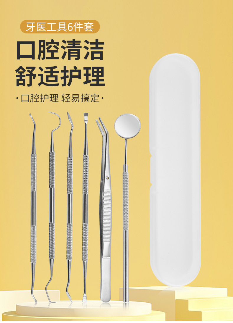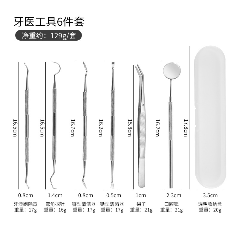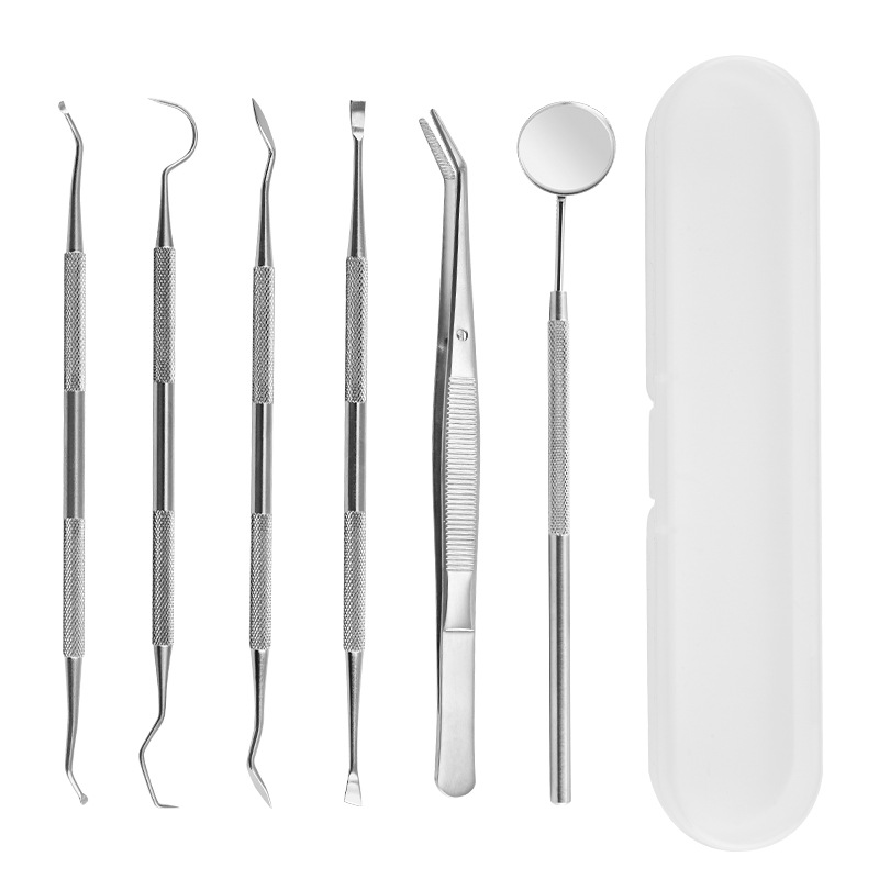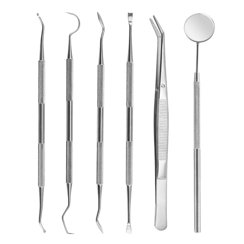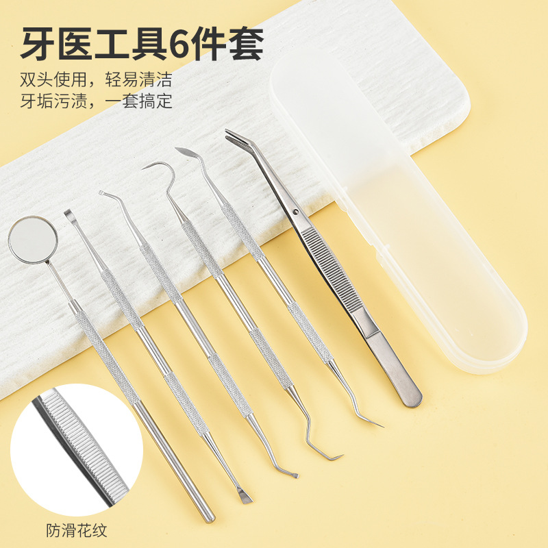 Средство для удаления зубных пятен; угловой зонд; очиститель серпа; Средство для чистки зубов мотыги; пинцет; Зеркало для полости рта; Набор инструментов для стоматолога из 6 предметов