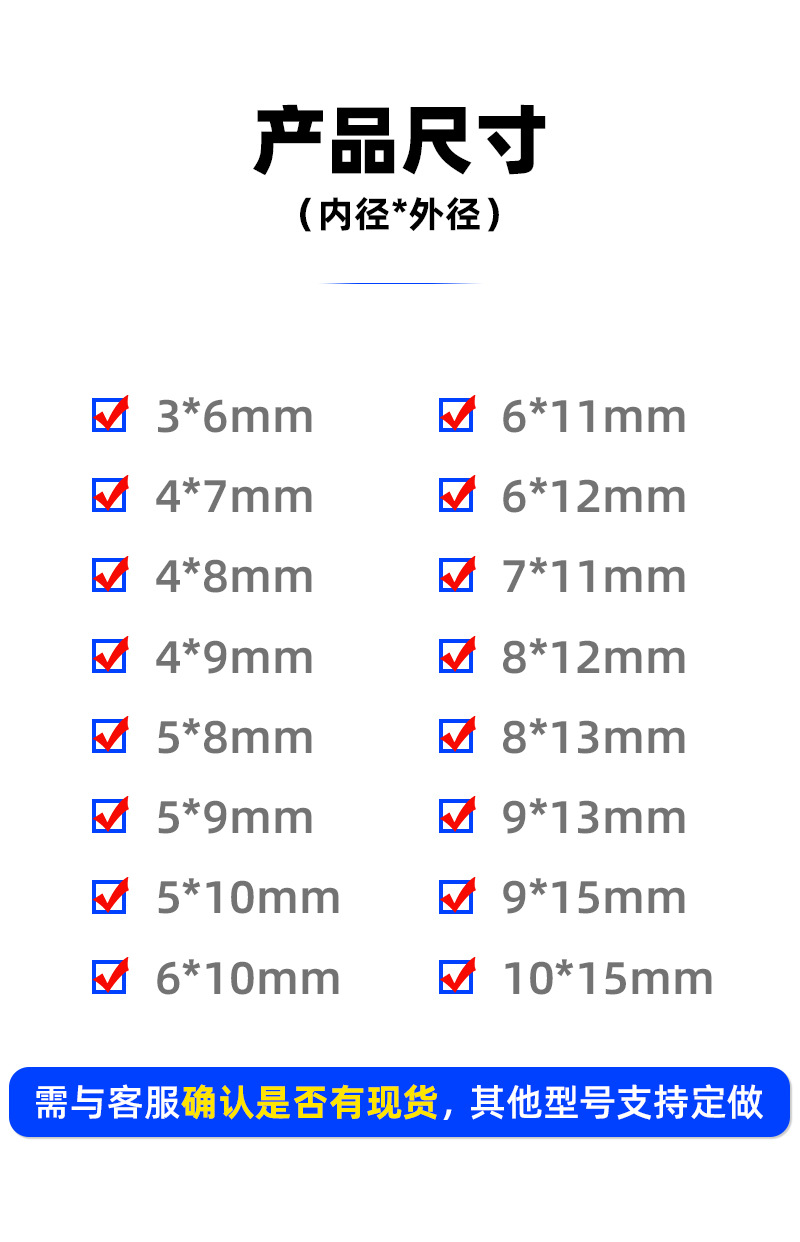 Внутренний диаметр 3 мм, внешний диаметр 6 мм.; Внутренний диаметр 4 мм, внешний диаметр 7 мм.; Внутренний диаметр 4 мм, внешний диаметр 8 мм.; Внутренний диаметр 4 мм, внешний диаметр 9 мм.; Внутренний диаметр 4 мм, внешний диаметр 10 мм.; Внутренний диаметр 5 мм, внешний диаметр 8 мм.; Внутренний диаметр 5 мм, внешний диаметр 9 мм.; Внутренний диаметр 5 мм, внешний диаметр 10 мм.; Внутренний диаметр 6 мм, внешний диаметр 10 мм.; Внутренний диаметр 6 мм, внешний диаметр 11 мм.; Внутренний диаметр 6 мм, внешний диаметр 12 мм.; Внутренний диаметр 7 мм, внешний диаметр 11 мм.; Внутренний диаметр 7 мм, внешний диаметр 12 мм.; Внутренний диаметр 8 мм, внешний диаметр 12 мм.; Внутренний диаметр 8 мм, внешний диаметр 13 мм.; Внутренний диаметр 8 мм, внешний диаметр 15 мм.; Внутренний диаметр 8 мм, внешний диаметр 18 мм.; Внутренний диаметр 9 мм, внешний диаметр 13 мм.; Внутренний диаметр 9 мм, внешний диаметр 15 мм.; Внутренний диаметр 10 мм, внешний диаметр 15 мм.; Внутренний диаметр 10 мм, внешний диаметр 17 мм.; Внутренний диаметр 12 мм, внешний диаметр 19 мм.; Внутренний диаметр 17 мм, внешний диаметр 23 мм.; Внутренний диаметр 19 мм, внешний диаметр 24 мм.; Внутренний диаметр 25 мм, внешний диаметр 32 мм.; Внутренний диаметр 50 мм, внешний диаметр 56 мм