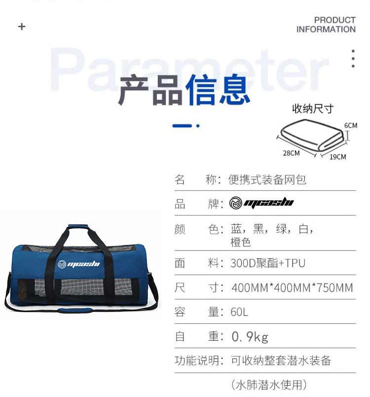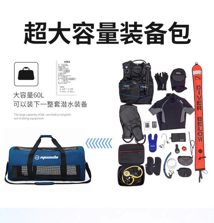 这个包有60L的容量,适合潜水和水肺潜水使用,可以收纳潜水全套装备,包括潜水服,脚蹼,潜水袜子,潜水头套等