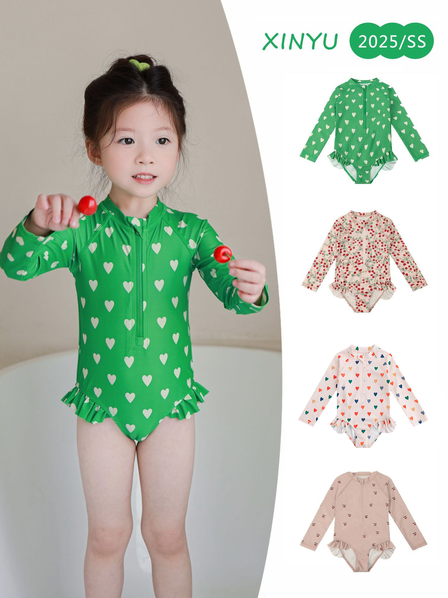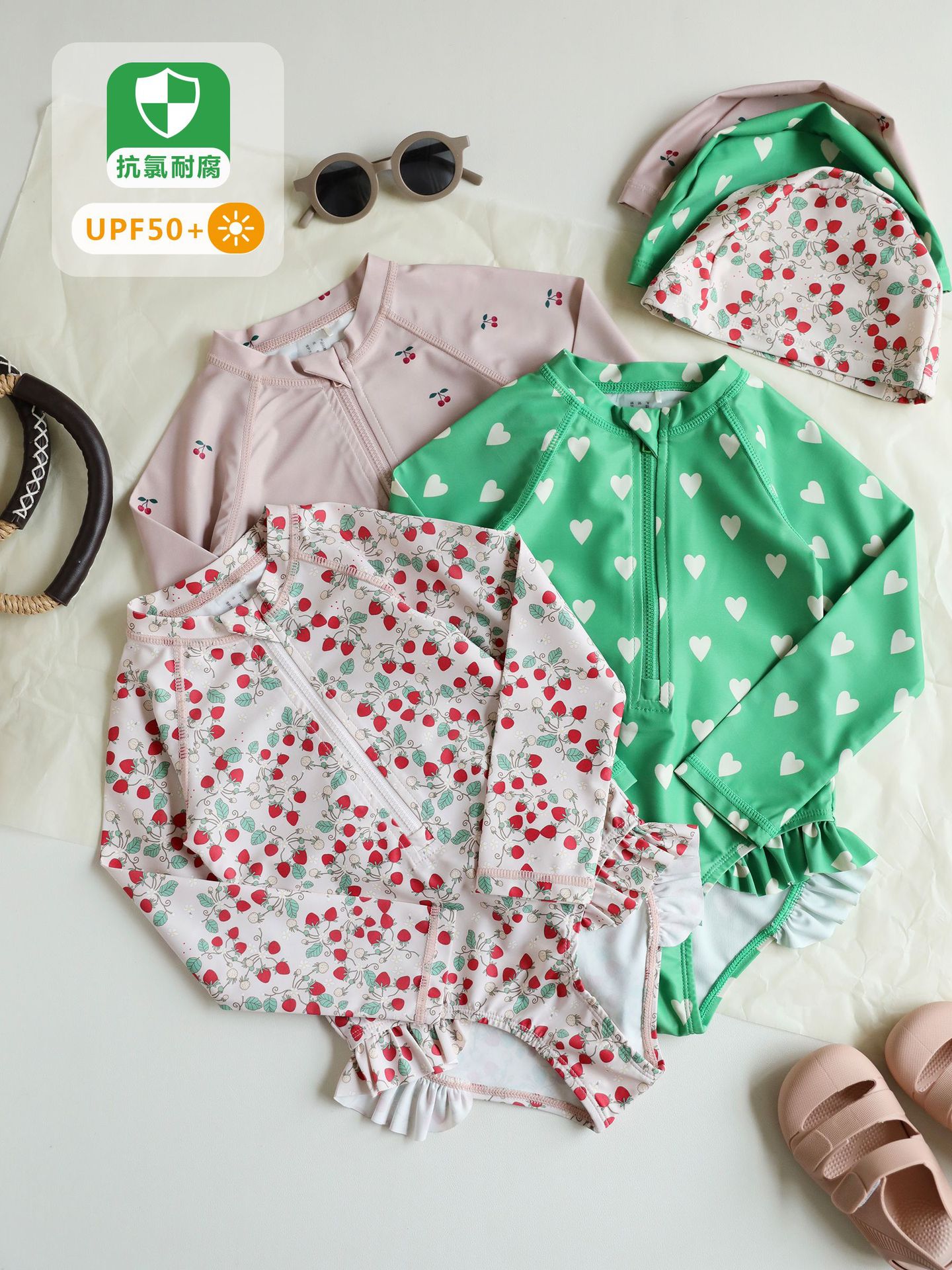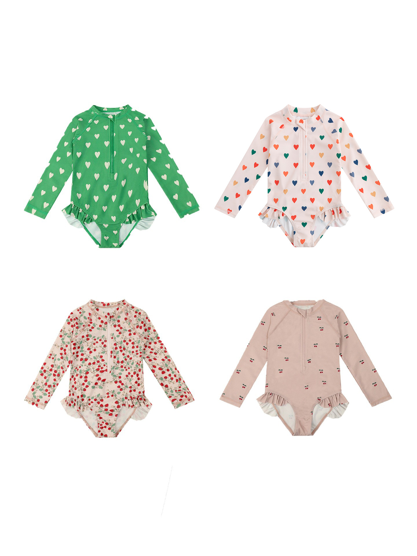 Цельный маленький вишневый купальник для девочек [купальник + шапочка для плавания]; Цельное изумрудно-зеленое сердечко для девочек [купальник + шапочка для плавания]; Цельный купальник для девочек с клубничным цветком [купальник + шапочка для плавания]; Цельные разноцветные сердечки для девочек [купальник + шапочка для плавания]
