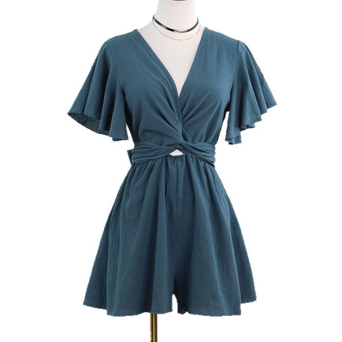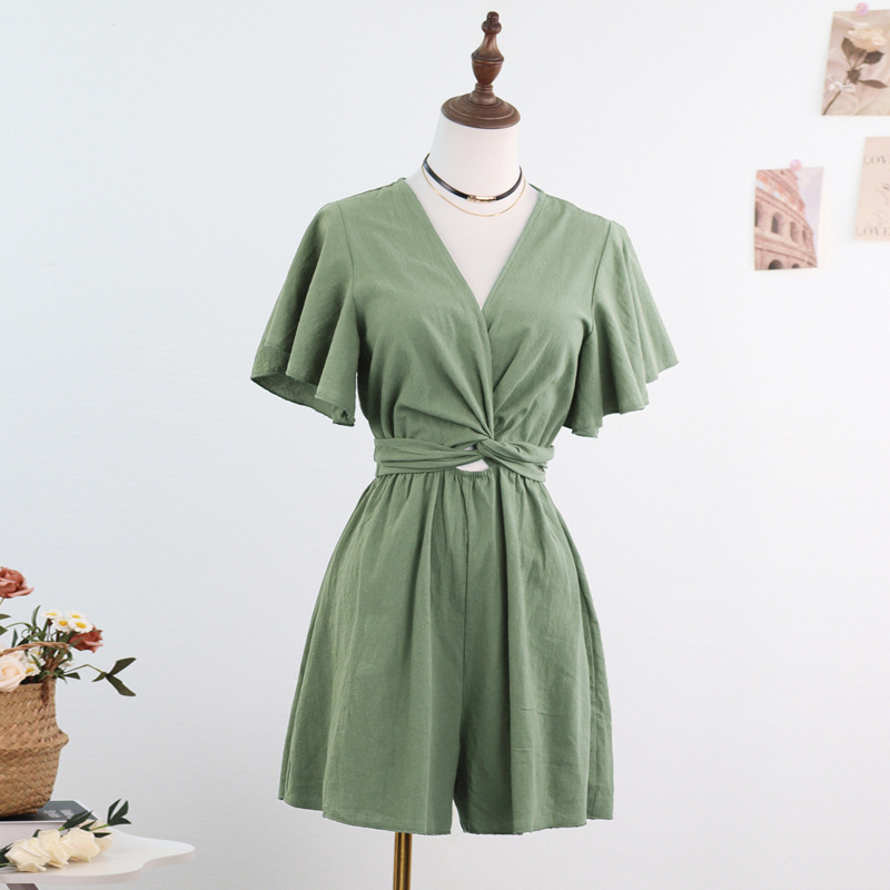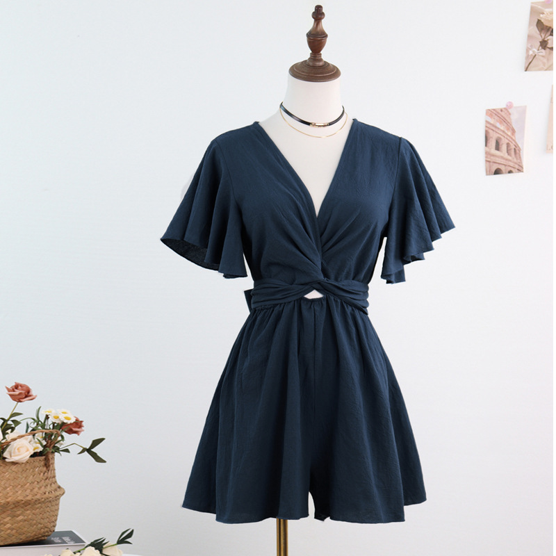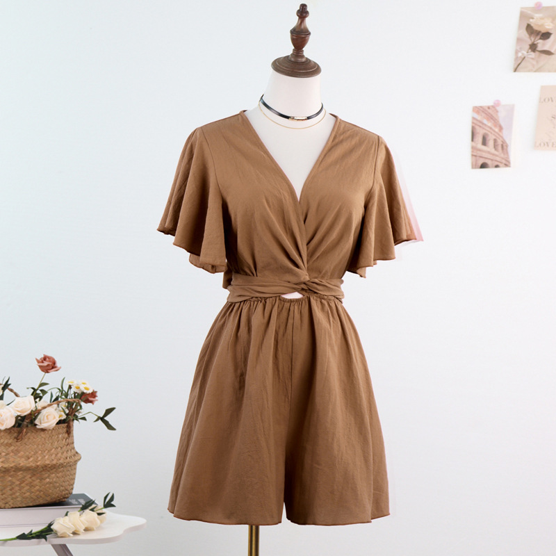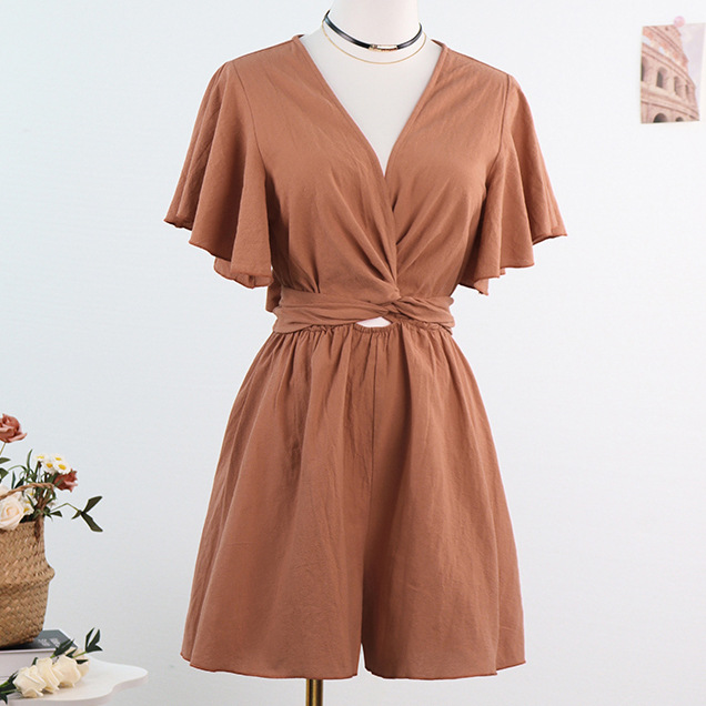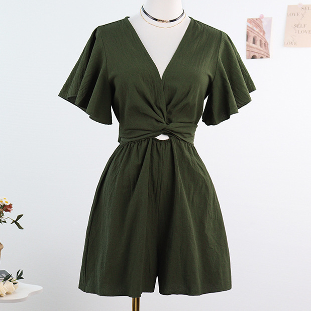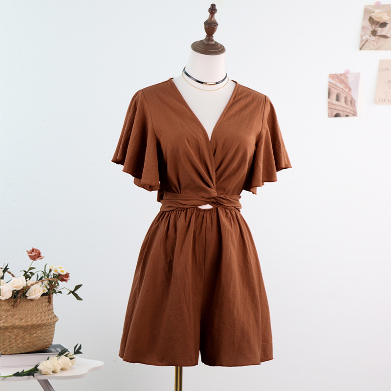 Независимый дизайн Европейский и Американский трансграничный Amazon сплошной цвет комбинезон женский 2025 весна и лето темперамент коммутирующие комбинезоны с V-образным вырезом
