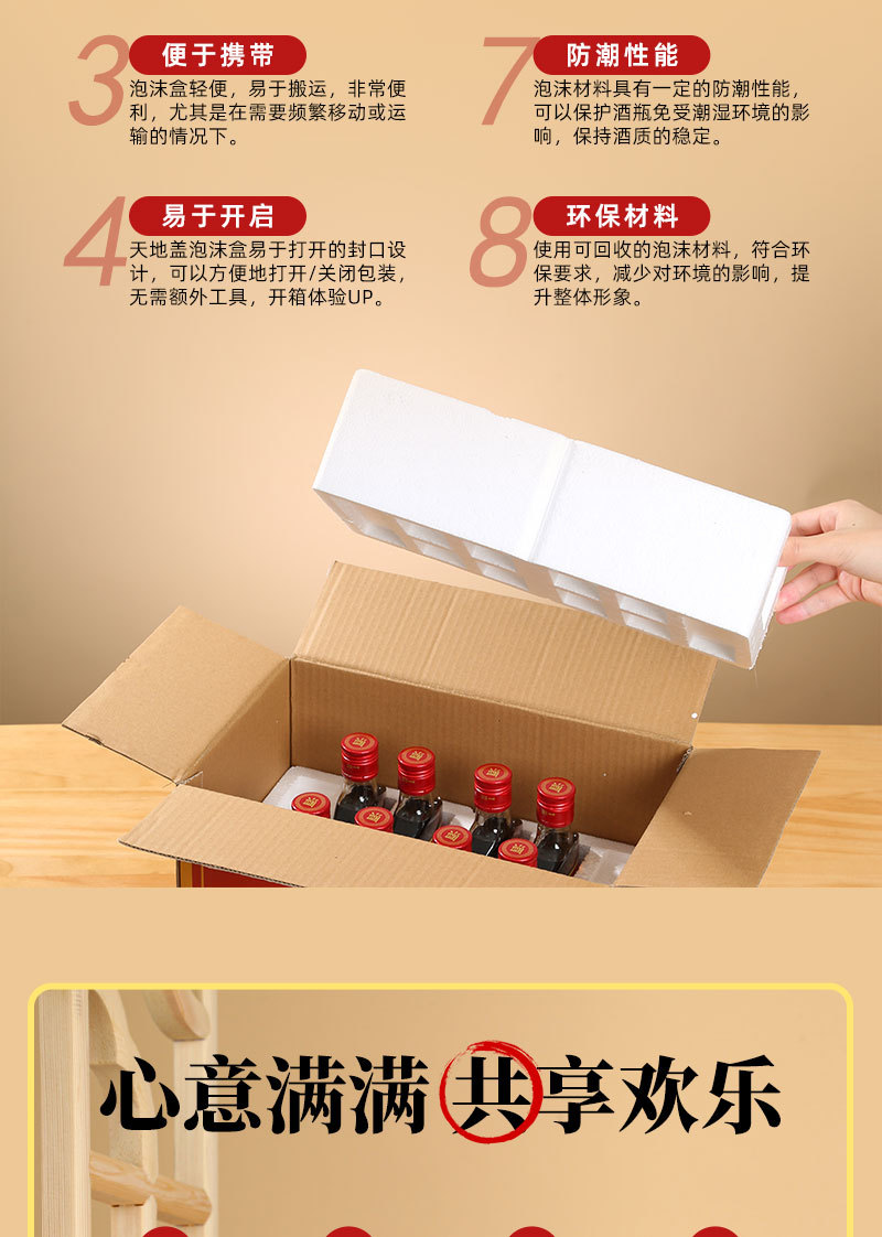 125 мл*24 бутылки (пенопластовая коробка с верхней и нижней крышкой); 520 мл*6 бутылок (пенопластовая коробка с верхней и нижней крышками)