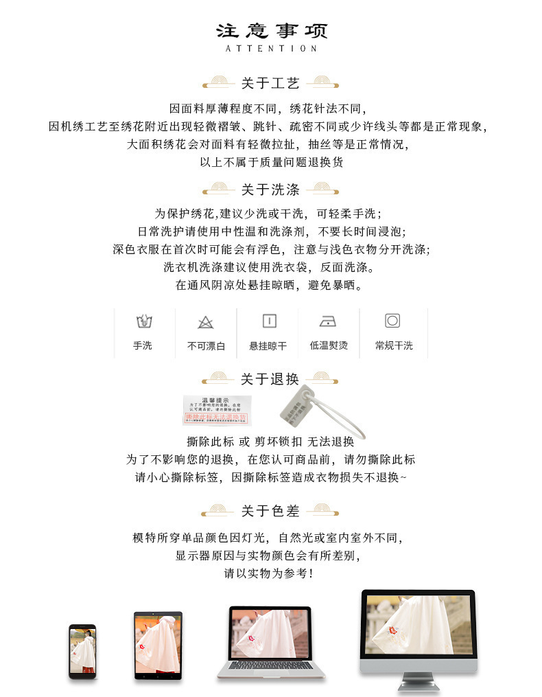 *洗涤说明:禁用肥皂,洗衣粉 等碱性洗涤用品