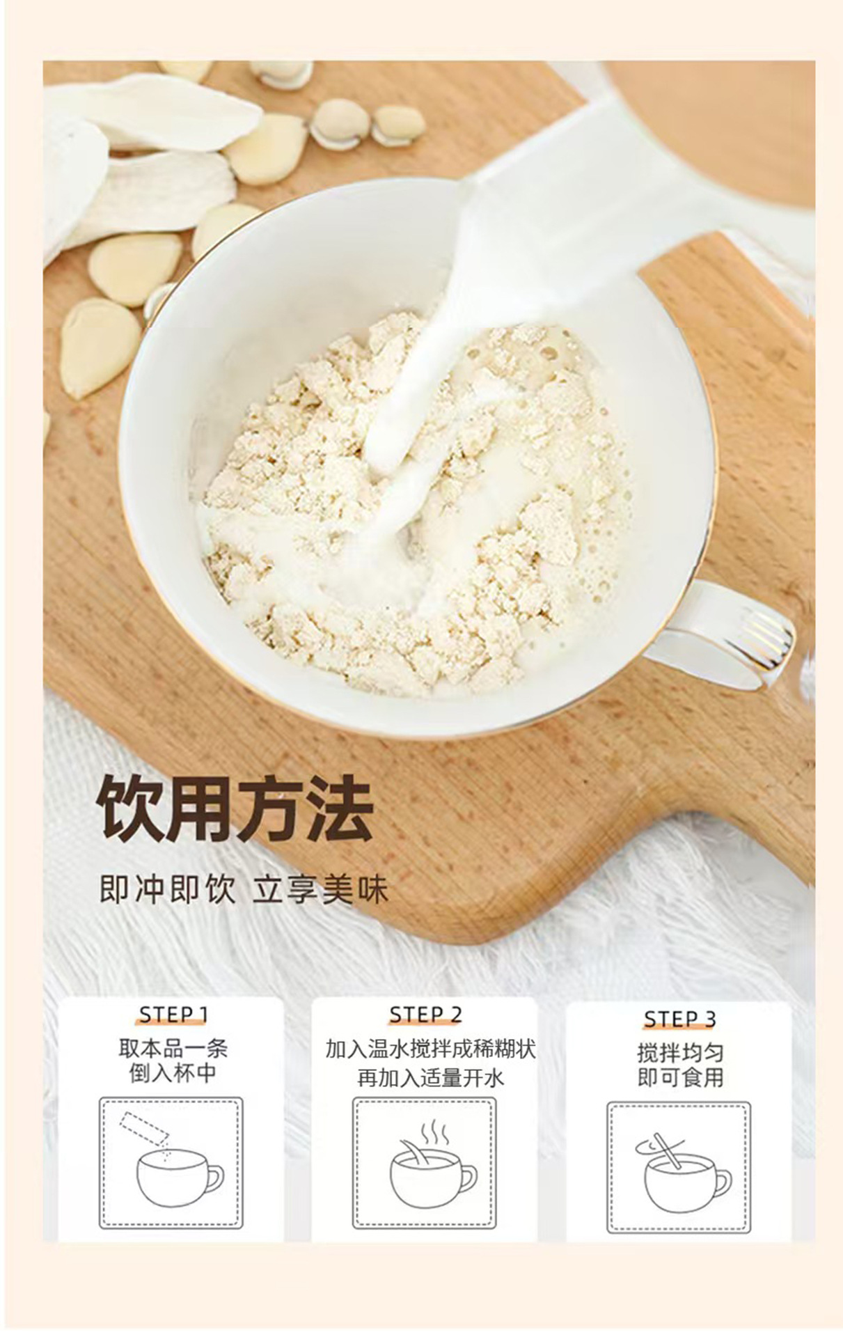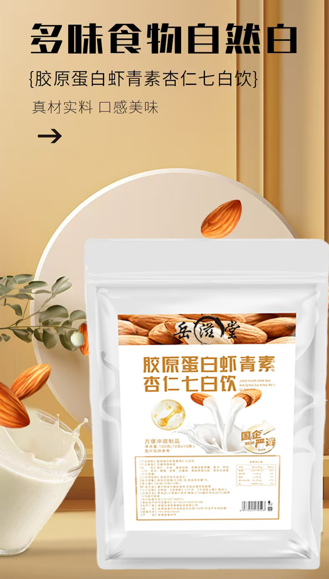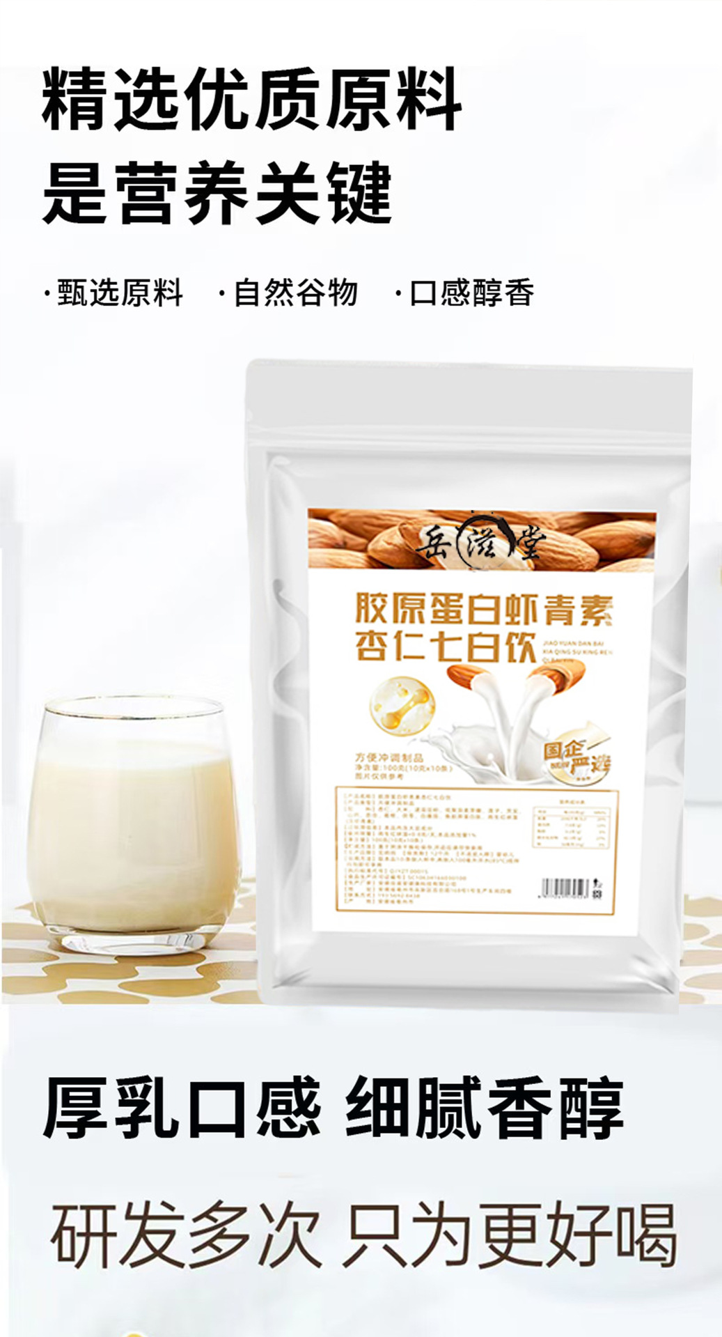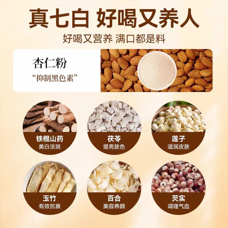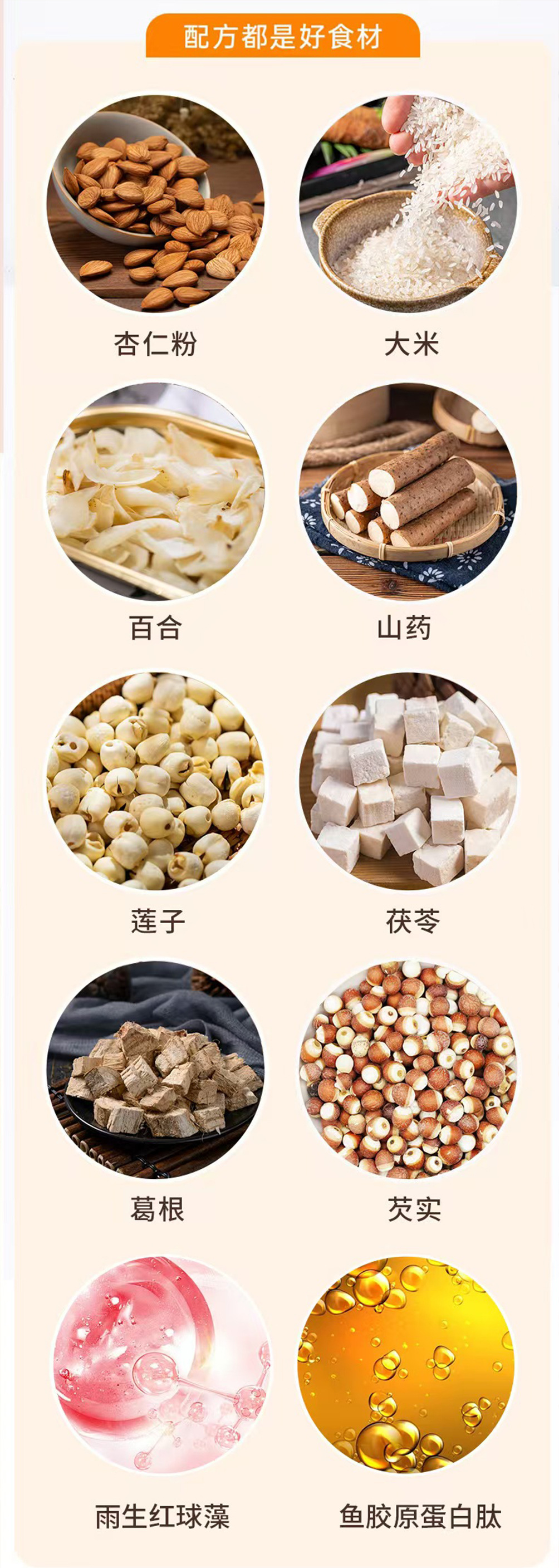 Коллаген из птичьих гнезд, астаксантин, миндаль, напиток «Семь белых», ямс, лилия, корень кудзу, пория, заменитель питания из плодов горгон.