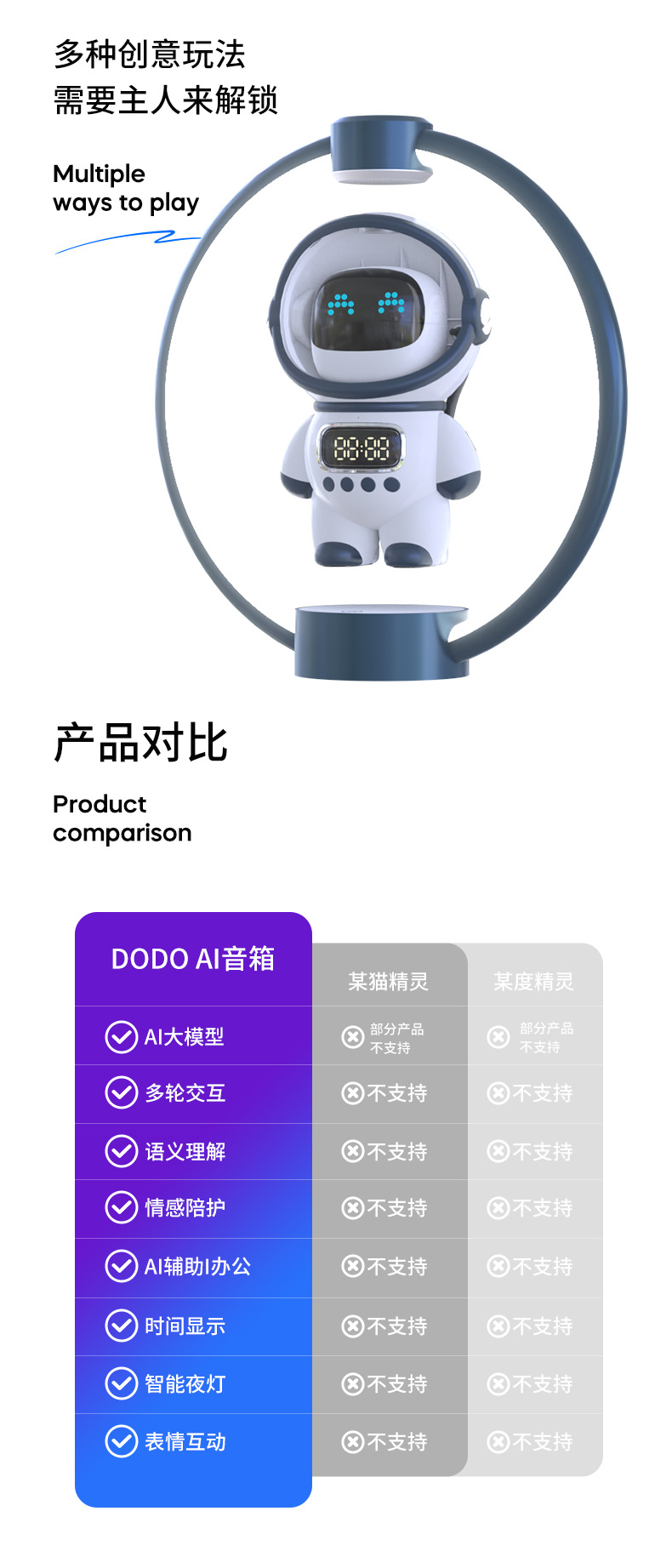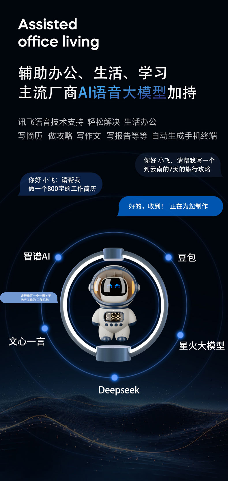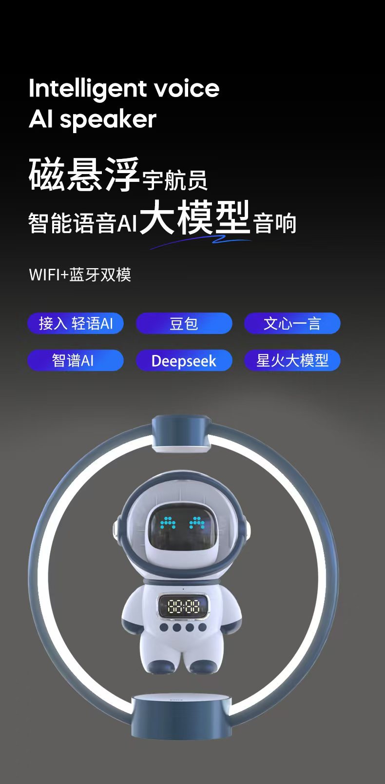 功能 悬浮功能 1.智能语音对话与AI大模型 2. 日常生活,工作,百科全能助理 3.语音闹钟设置,自动对时 4.动态/情绪表情频谱 5.小夜灯功能 6.插TF卡 7.AUX音频输入 8.蓝牙连接播放 9.支持2.4G/WIFI网络连接 10.时钟显示 11.支持小程序在线编辑、智能AI写作,一键在线生成内容, 自动生成演讲稿。12.覆盖写作/情感/文案/娱乐/学习/教育/创作等各个场景. 13. 智能AI模组搭建(内含豆包A1,智谱AI,文心一言,MiniMax,DeepSeek,讯飞星火)