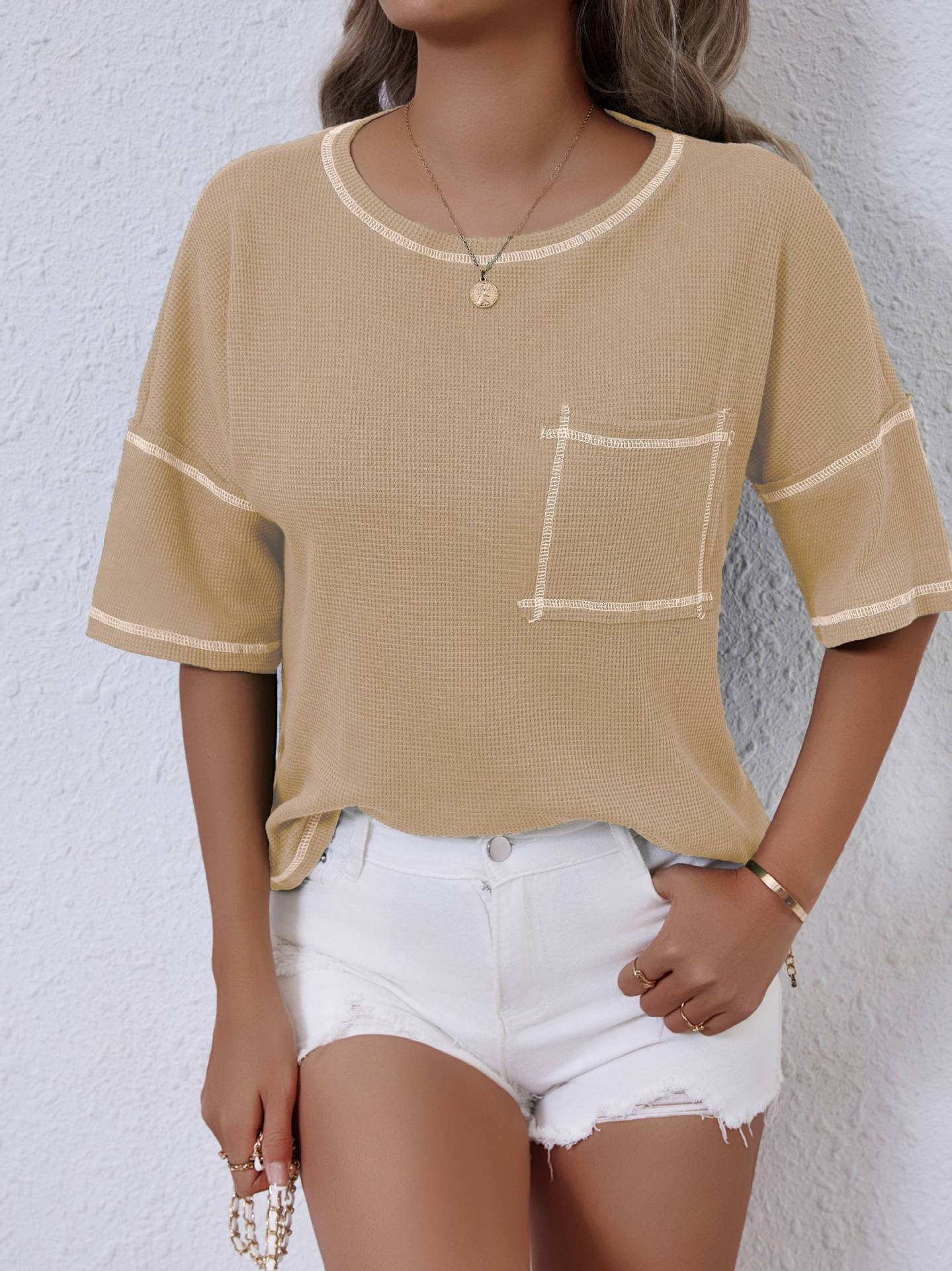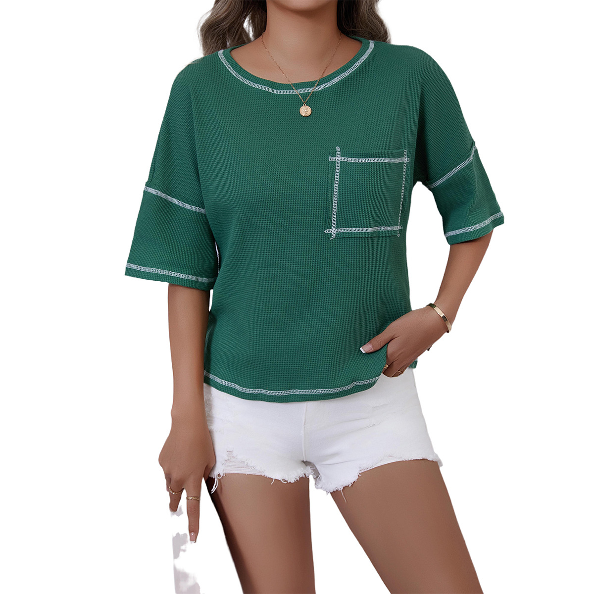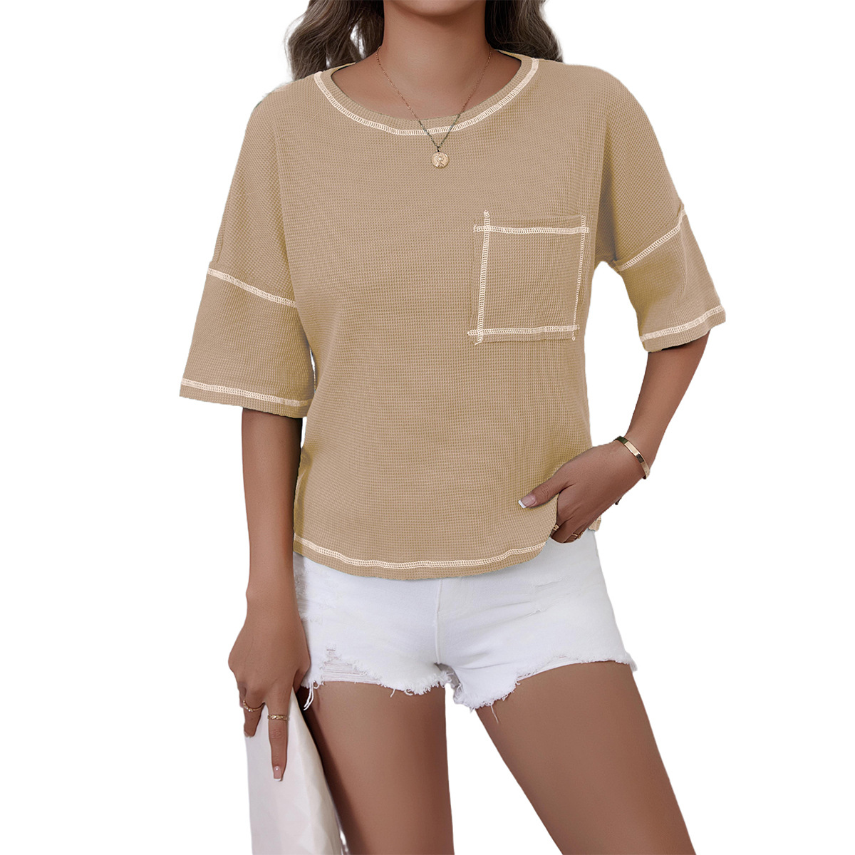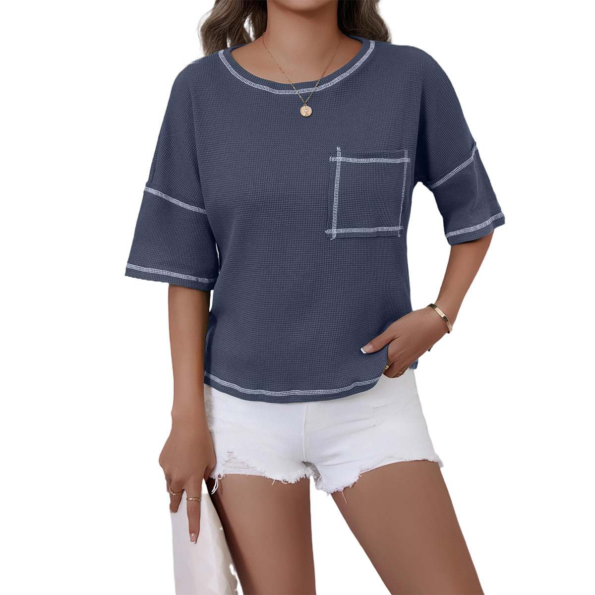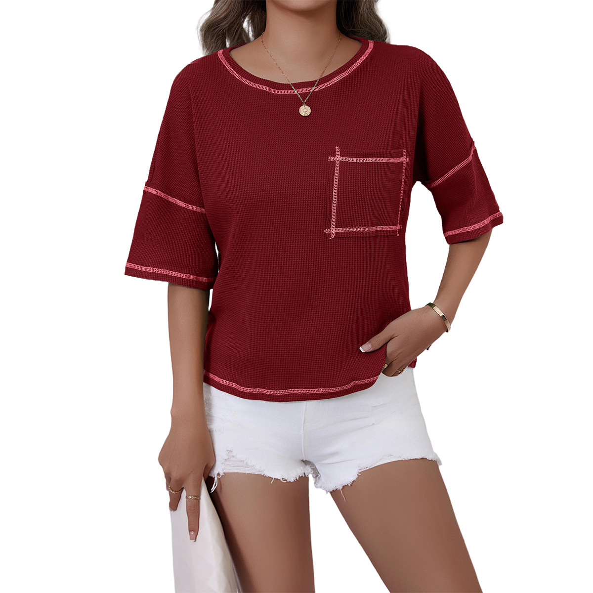 Женская футболка из вафельного трикотажа с круглым вырезом и коротким рукавом, однотонная, повседневная, универсальная, коллекция Весна/Лето 2025, для внешней торговли Amazon, в европейском и американском стиле.