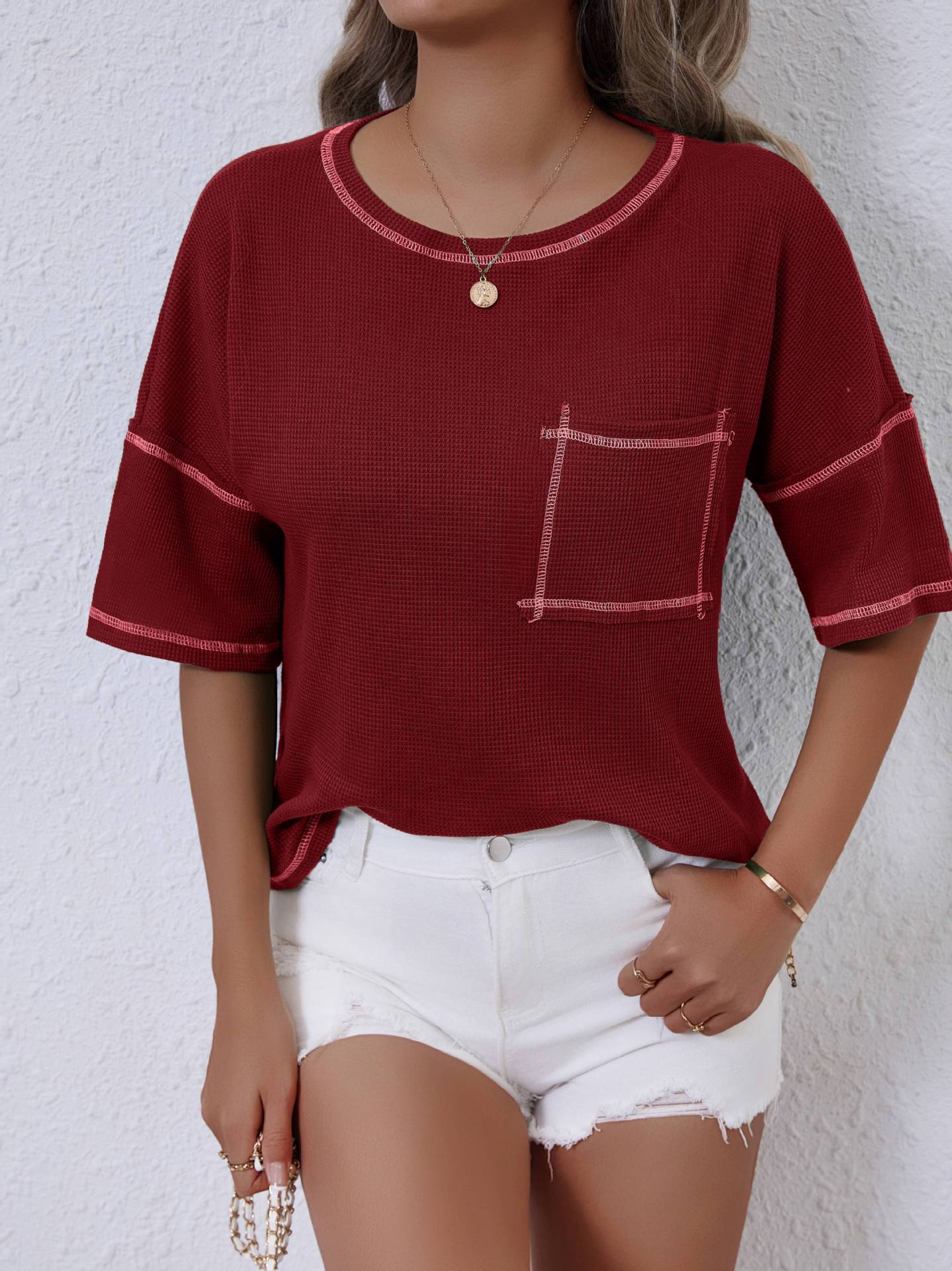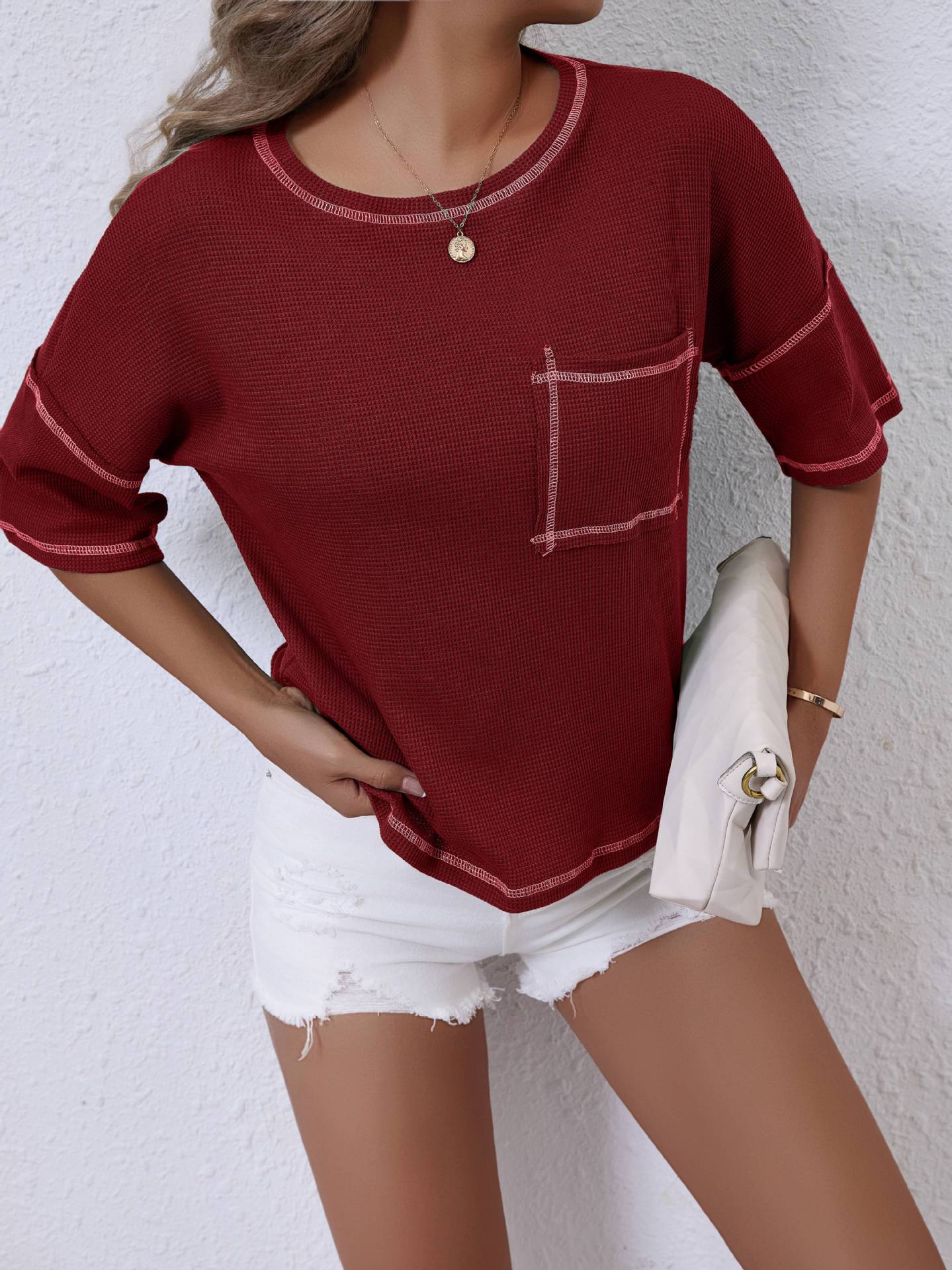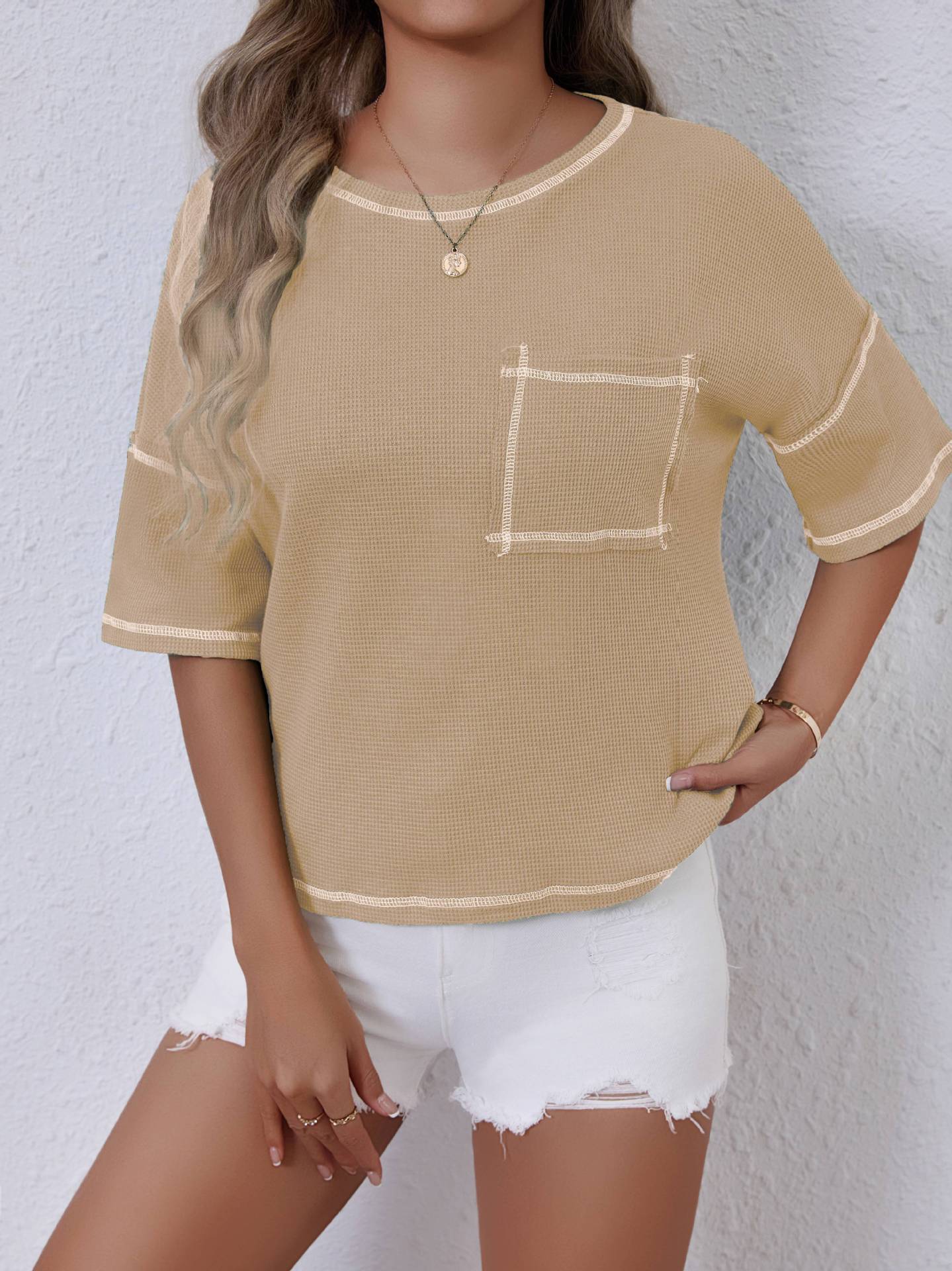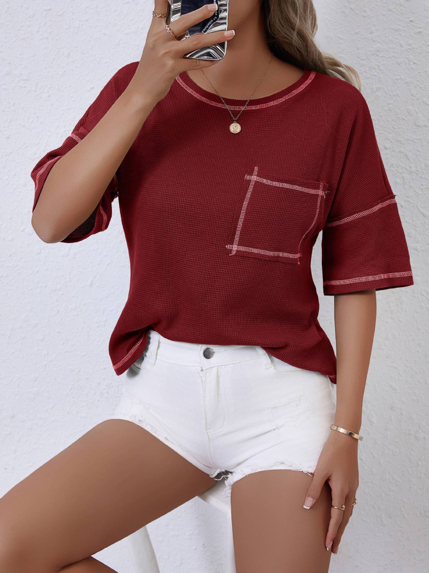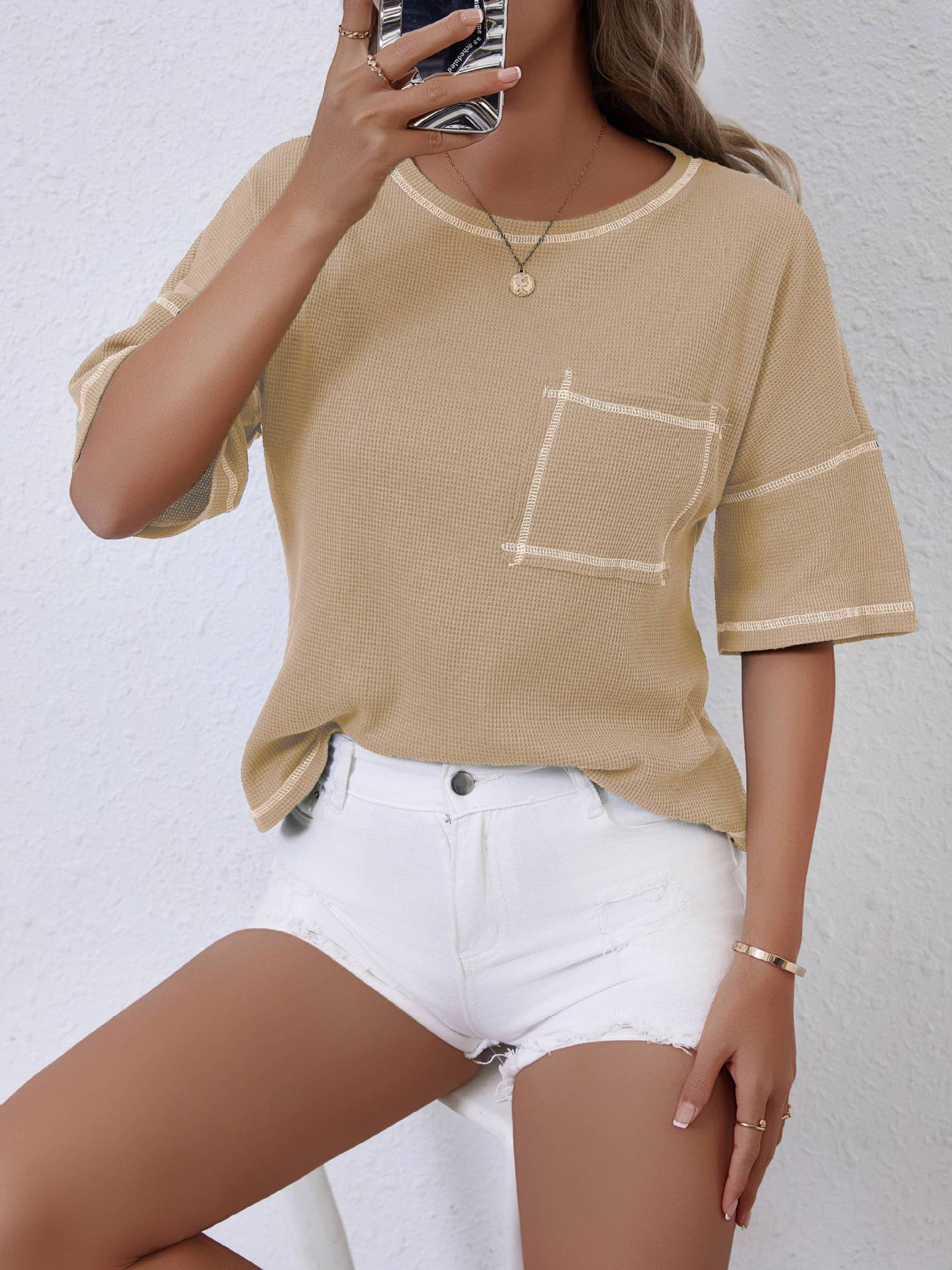 Женская футболка из вафельного трикотажа с круглым вырезом и коротким рукавом, однотонная, повседневная, универсальная, коллекция Весна/Лето 2025, для внешней торговли Amazon, в европейском и американском стиле.