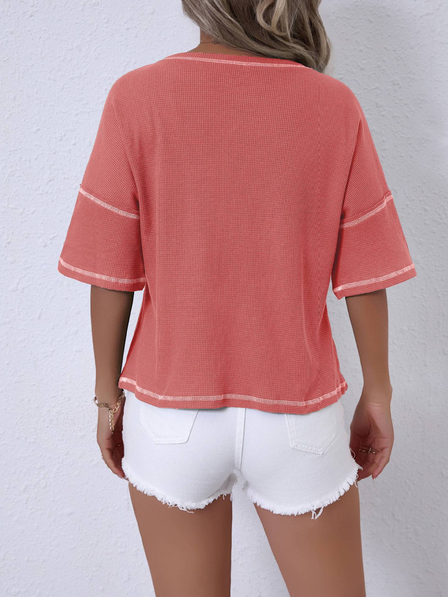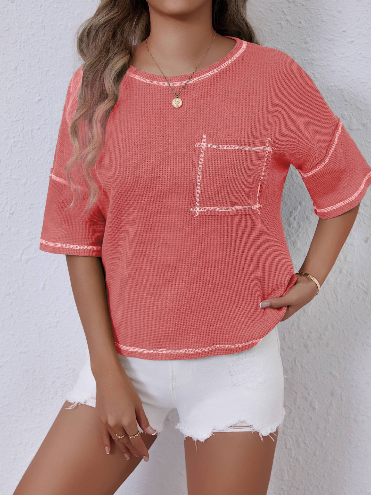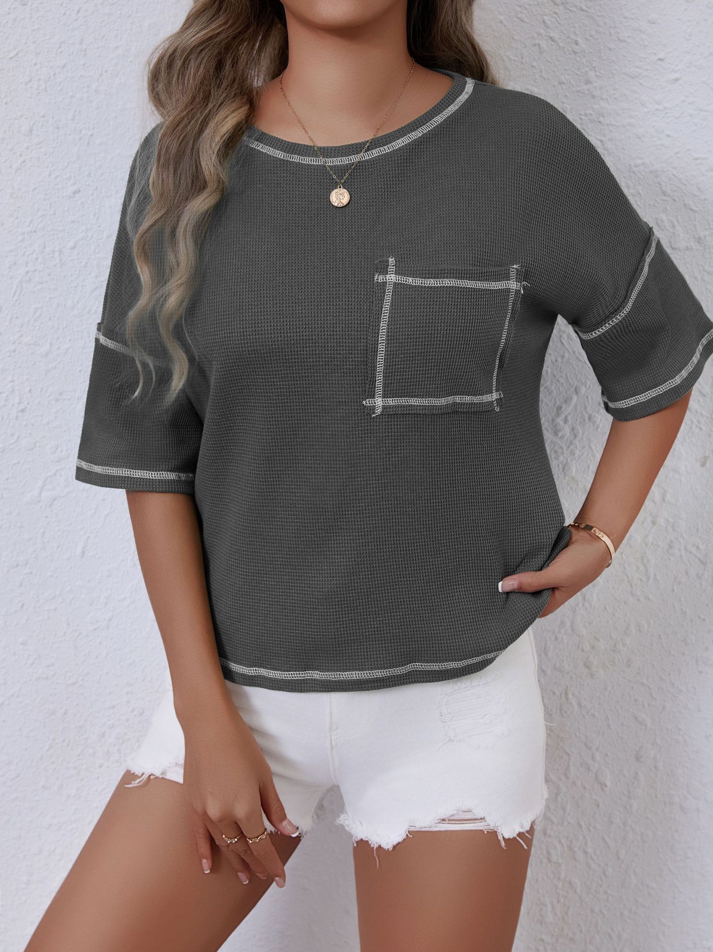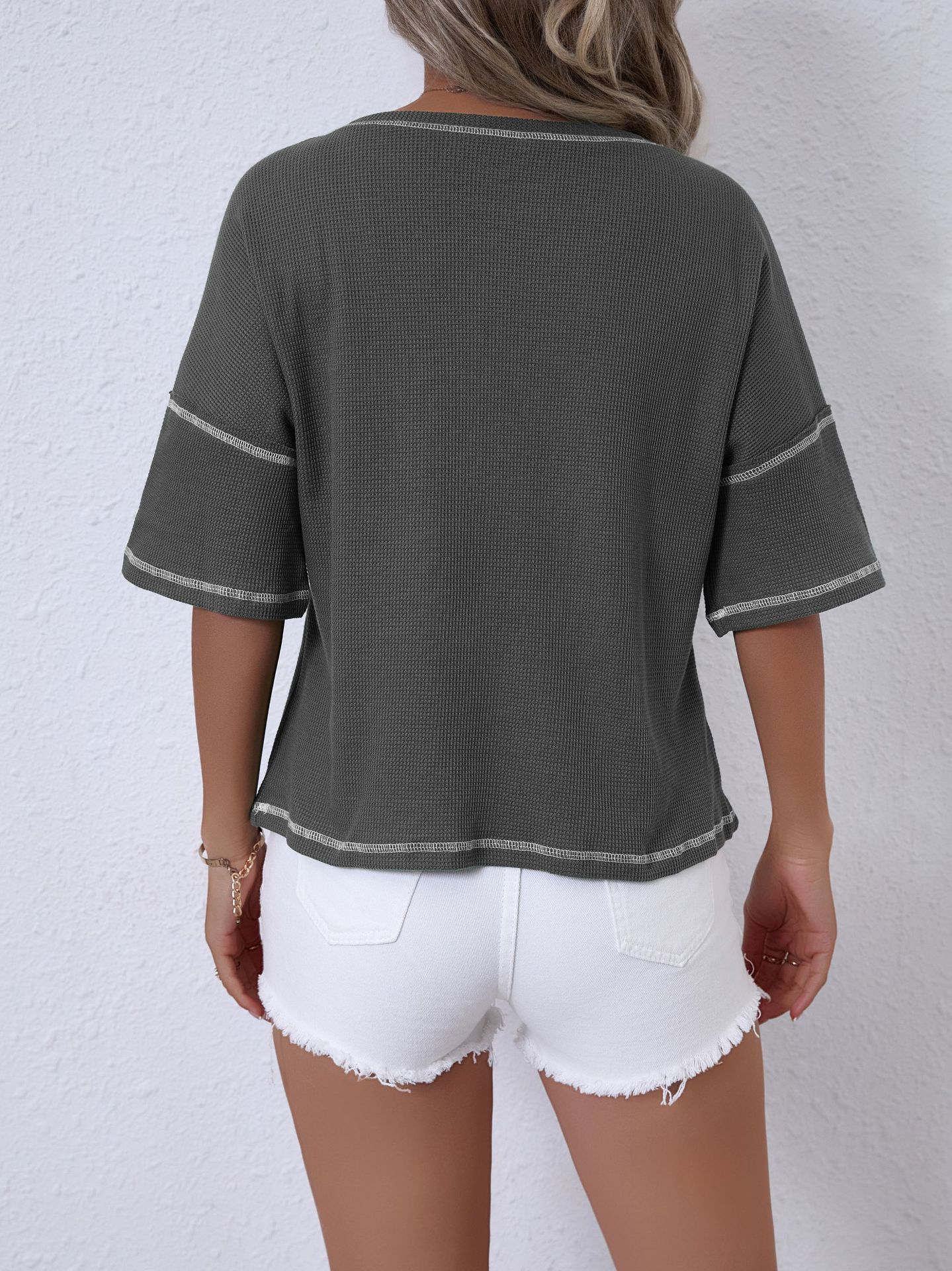 Женская футболка из вафельного трикотажа с круглым вырезом и коротким рукавом, однотонная, повседневная, универсальная, коллекция Весна/Лето 2025, для внешней торговли Amazon, в европейском и американском стиле.