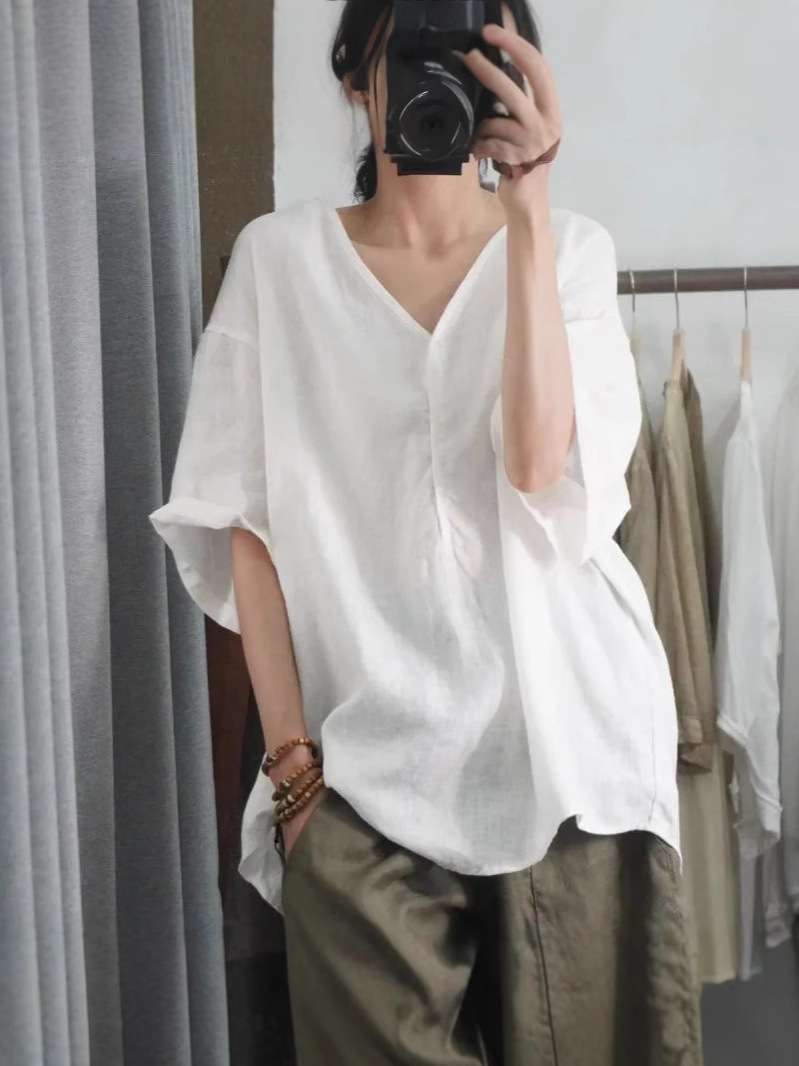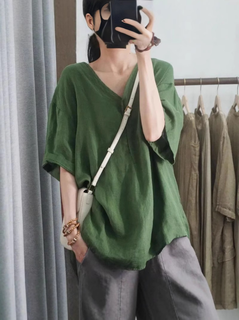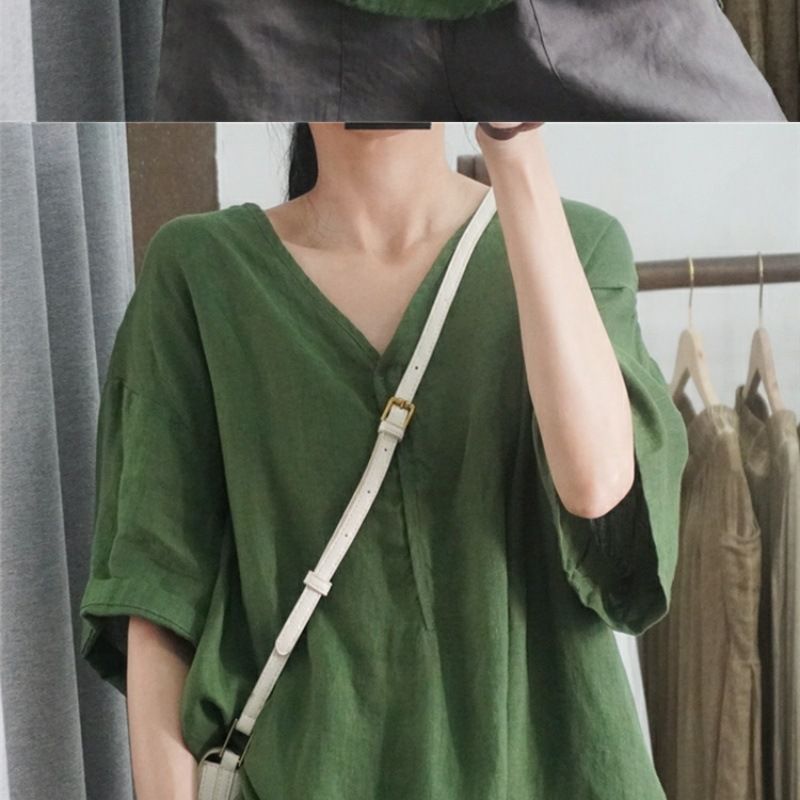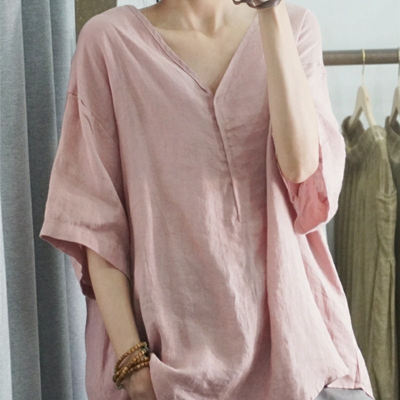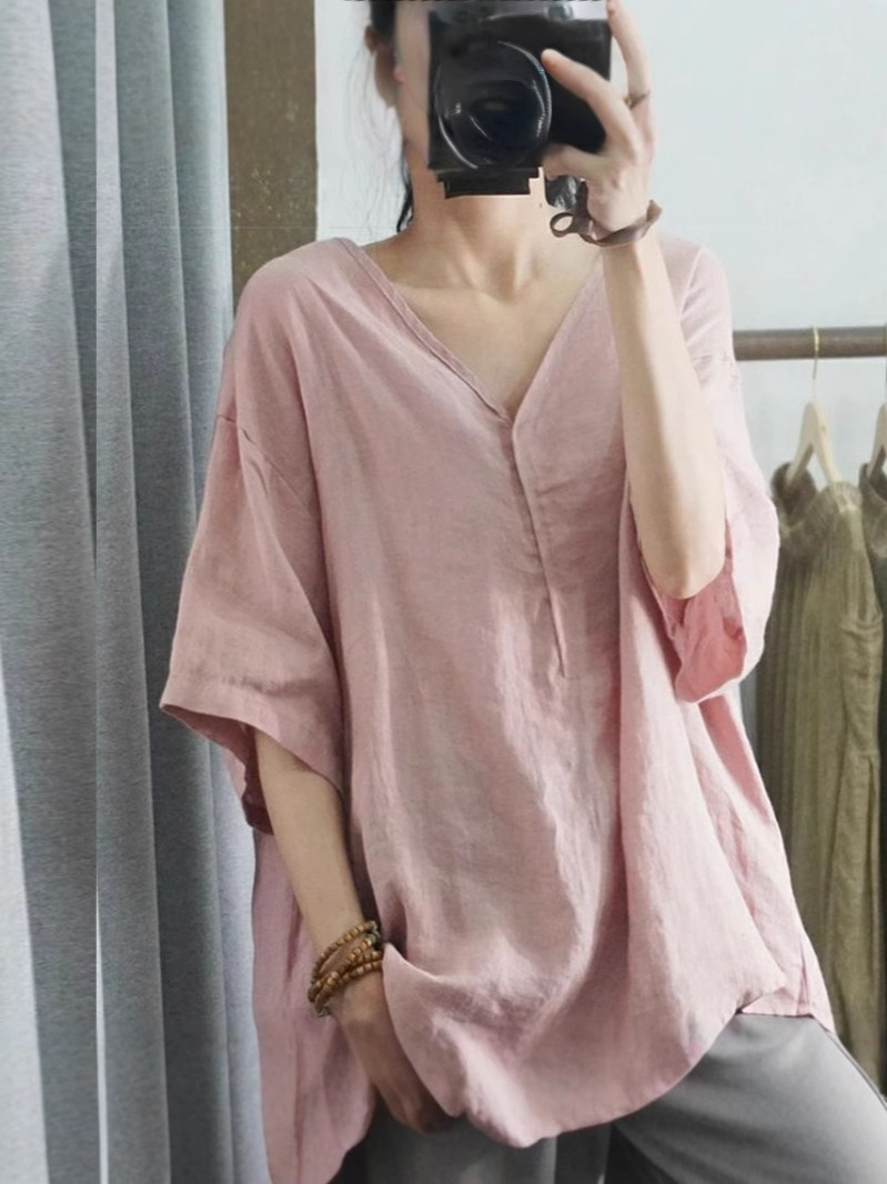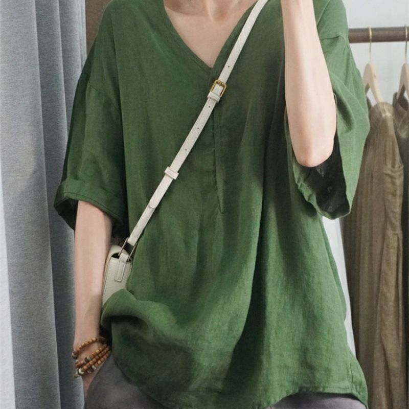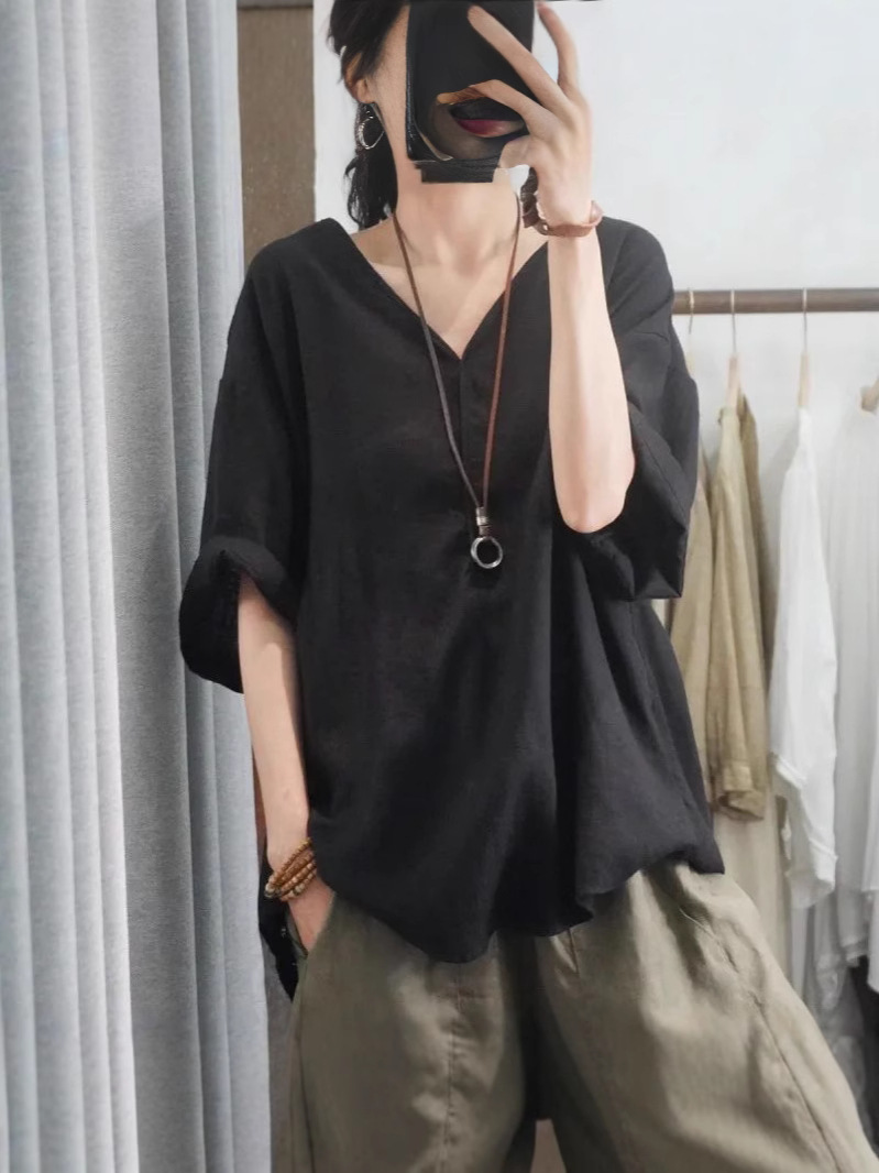 Летний новый стиль с половиной рукава повседневный свободный большой размер, покрывающий мясо, удобный V-образный топ с короткими рукавами футболка сплошной цвет высокого уровня женская одежда