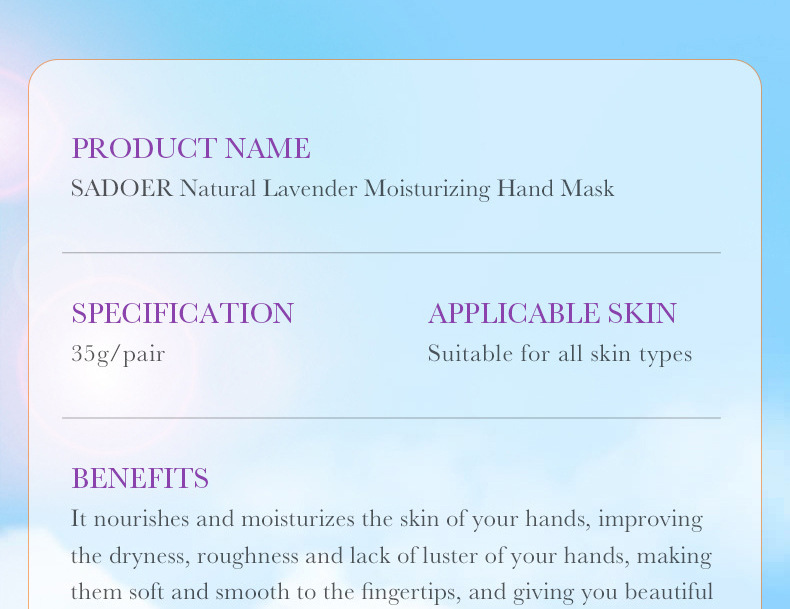 Лавандовая лавандовая маска для ног 35 г/пара (только для внешнеторговых продаж); Маска для ног из козьего молока, козьего молока, 35 г/пара (только для внешнеторговых продаж); Маска для ног Rose 35 г/пара (только для внешнеторговых продаж); Маска для ног Aloe Aloe 35 г/пара (только для внешнеторговых продаж); Отбеливающая маска для ног 35 г/пара (только для внешнеторговых продаж).; Лавандовая маска для рук 35 г/пара (только для внешнеторговых продаж); Маска для рук из козьего молока, козьего молока, 35 г/пара (только для внешнеторговых продаж); Маска для рук из розовой розы 35 г/пара (только для внешнеторговых продаж); Маска для рук Aloe Aloe 35 г/пара (только для внешнеторговых продаж); Отбеливающая маска для рук 35 г/пара (только для внешнеторговых продаж)