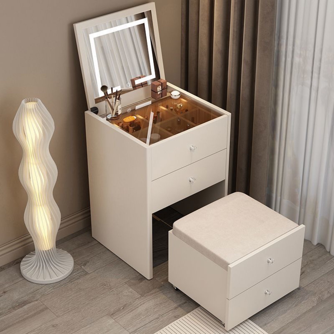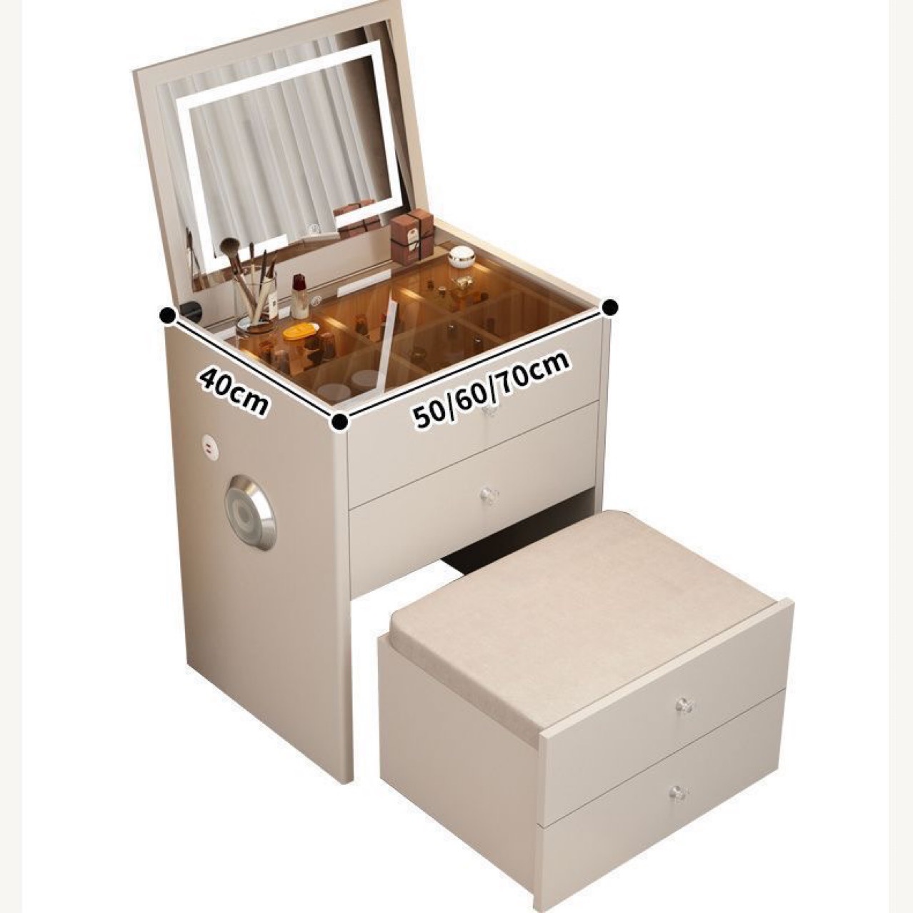 50 см белое настольное зеркало с табуретом для макияжа; 60-сантиметровый белый стол с зеркалом и табуретом для макияжа; 70 см белое настольное зеркало с табуретом для макияжа; Серый стол с зеркалом 50 см и табурет для макияжа в комплекте; Комбинация табурета для макияжа и настольного зеркала серого цвета, 60 см; Серый стол с зеркалом 70 см и табурет для макияжа в комплекте
