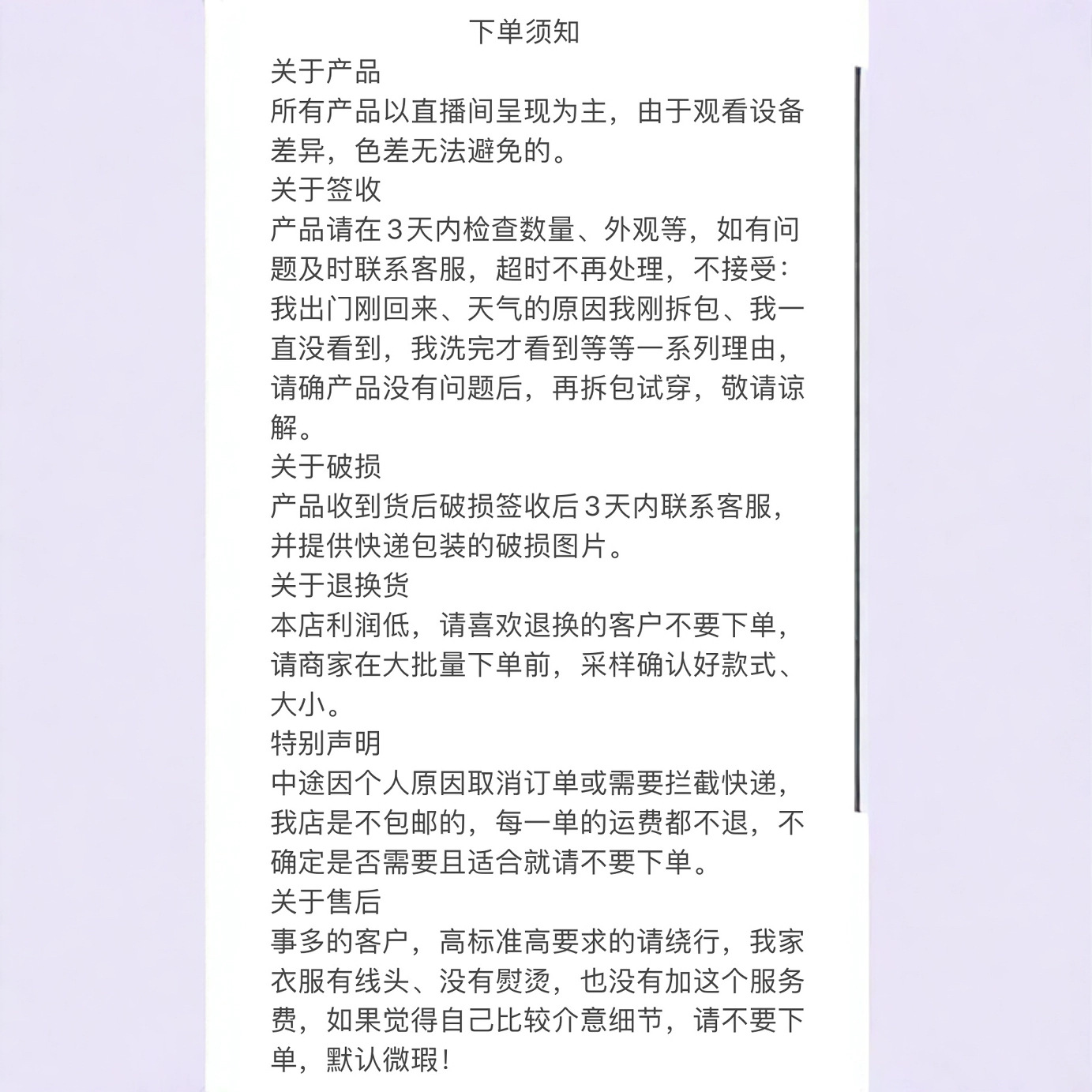 事多的客户,高标准高要求的请绕行,我家衣服有线头、没有熨烫,也没有加这个服务费,如果觉得自己比较介意细节,请不要下单,默认微瑕!