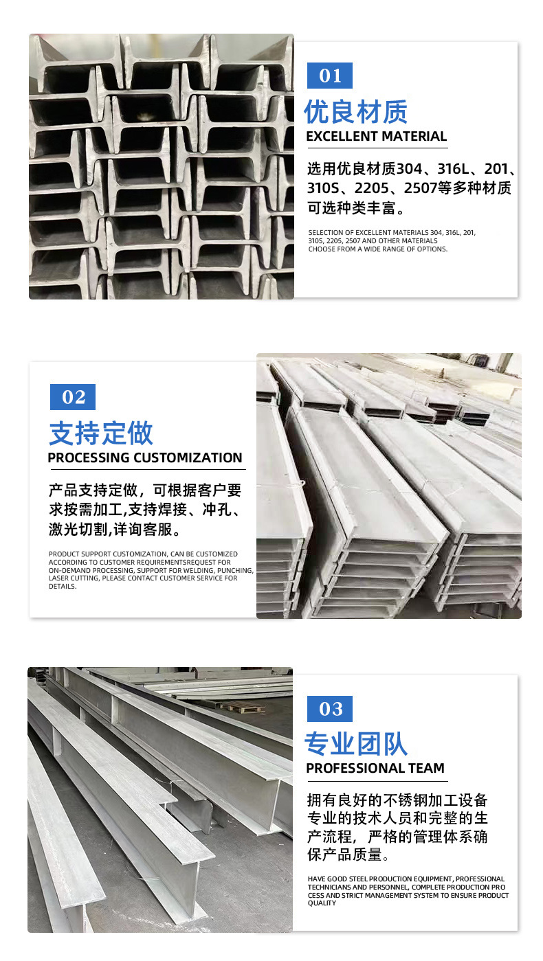 Производитель I-образных балок из нержавеющей стали оптом, обработка перфорацией I-образных балок из нержавеющей стали 304/316L, H-образная сталь из нержавеющей стали