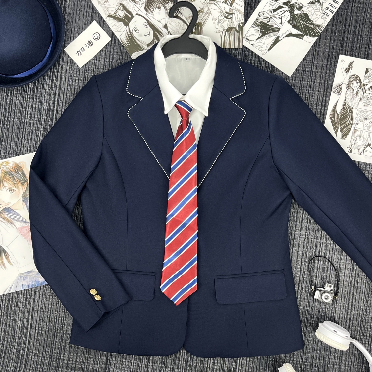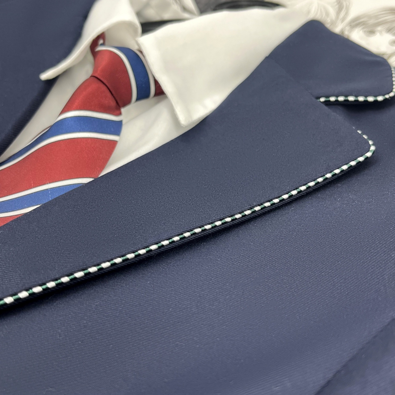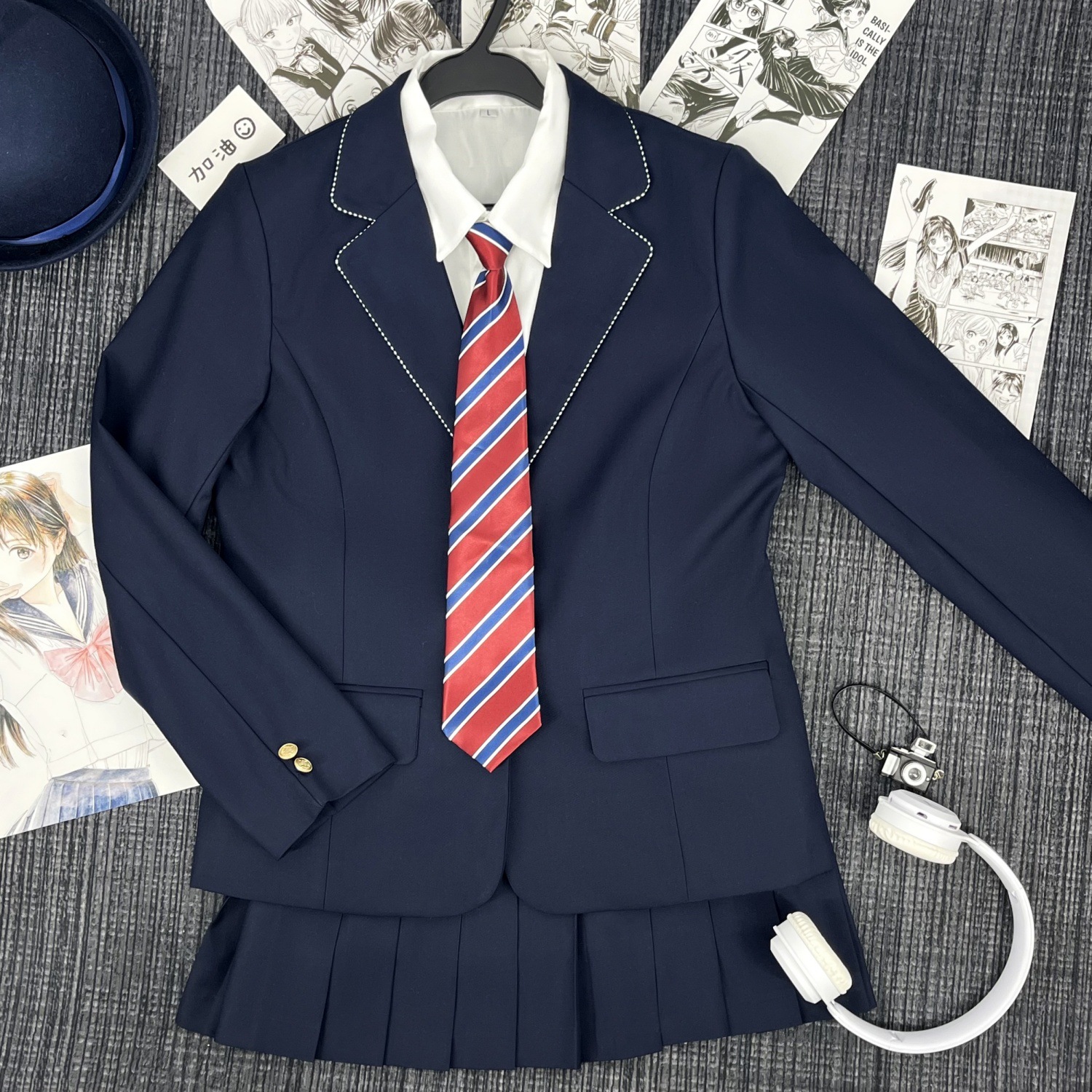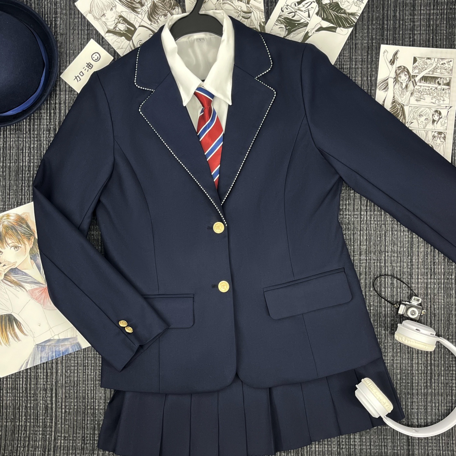 Один костюм в зеленую полоску; Костюм в зеленую полоску + юбка; Костюм в зеленую полоску + женская белая рубашка с длинными рукавами + красно-синий клетчатый галстук; Костюм в зеленую полоску + женская длинная белая рубашка + подходящий галстук + юбка