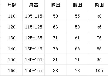 110cm; 120cm; 130cm; 140cm; 150cm; 160cm