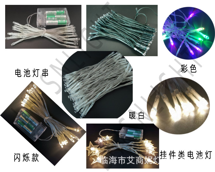 供应:节日灯串,LED灯串,圣诞灯串,电池灯/铜线灯,复活节灯串,鬼节灯串,圣诞树配件灯串,装饰灯串,星星灯串,网灯,滴水灯,窗帘灯,冰条灯等等。
