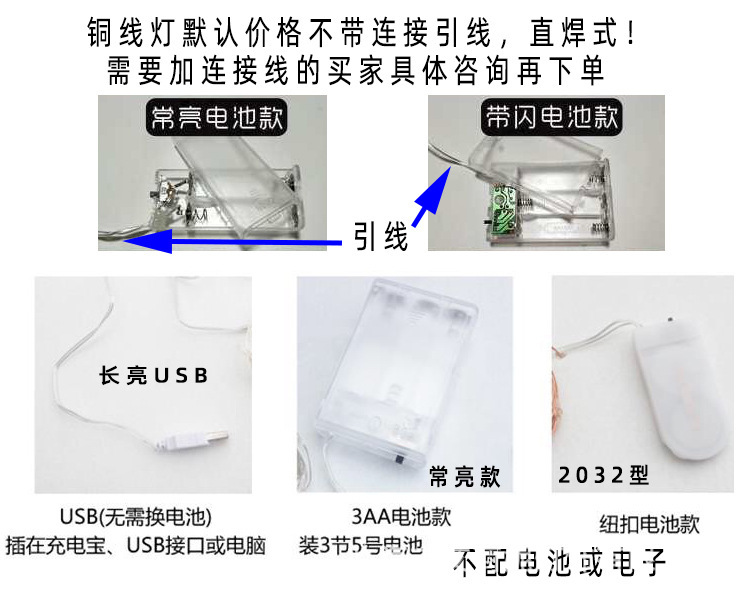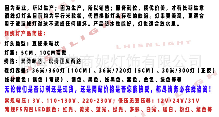 规格:灯泡头数不限,灯的长度不限,电线的颜色及尺寸不限,插头不限,控制器不限,颜色不限,防水与否不限,可否连接不限。千言万字归一句:只要有详细参数,生产不是问题。